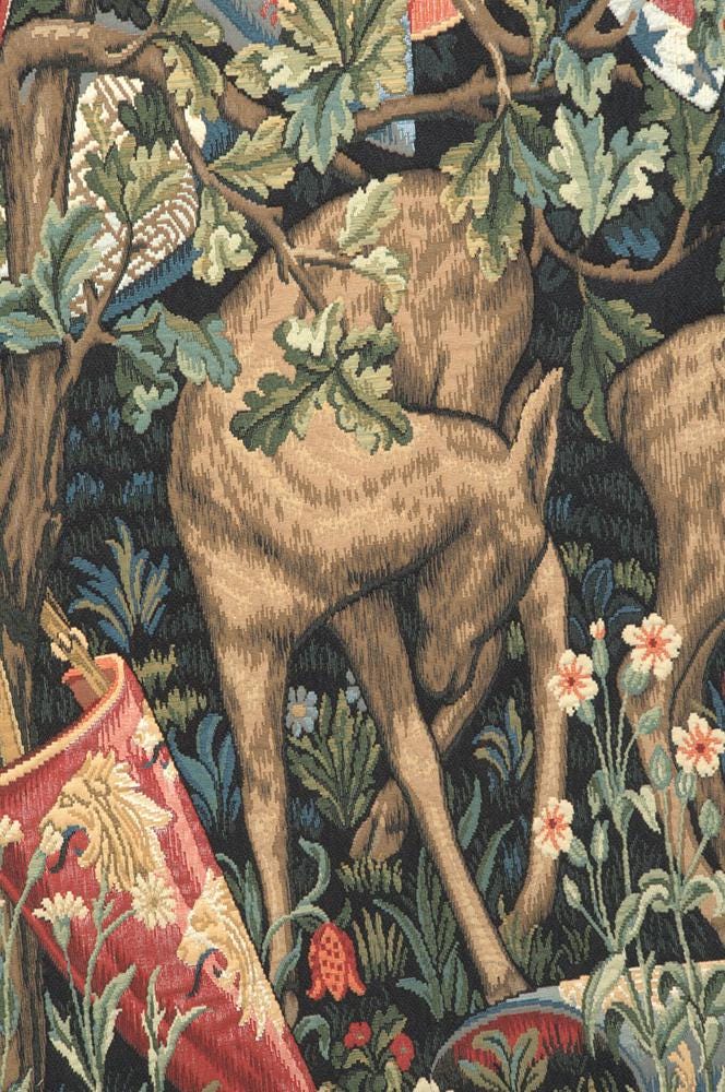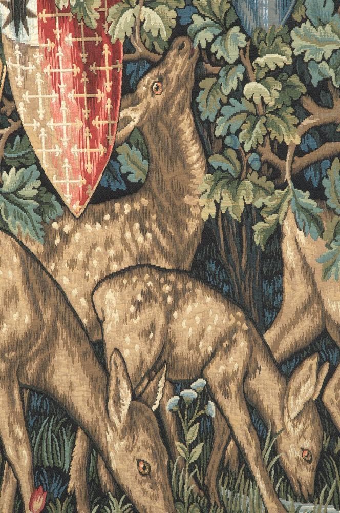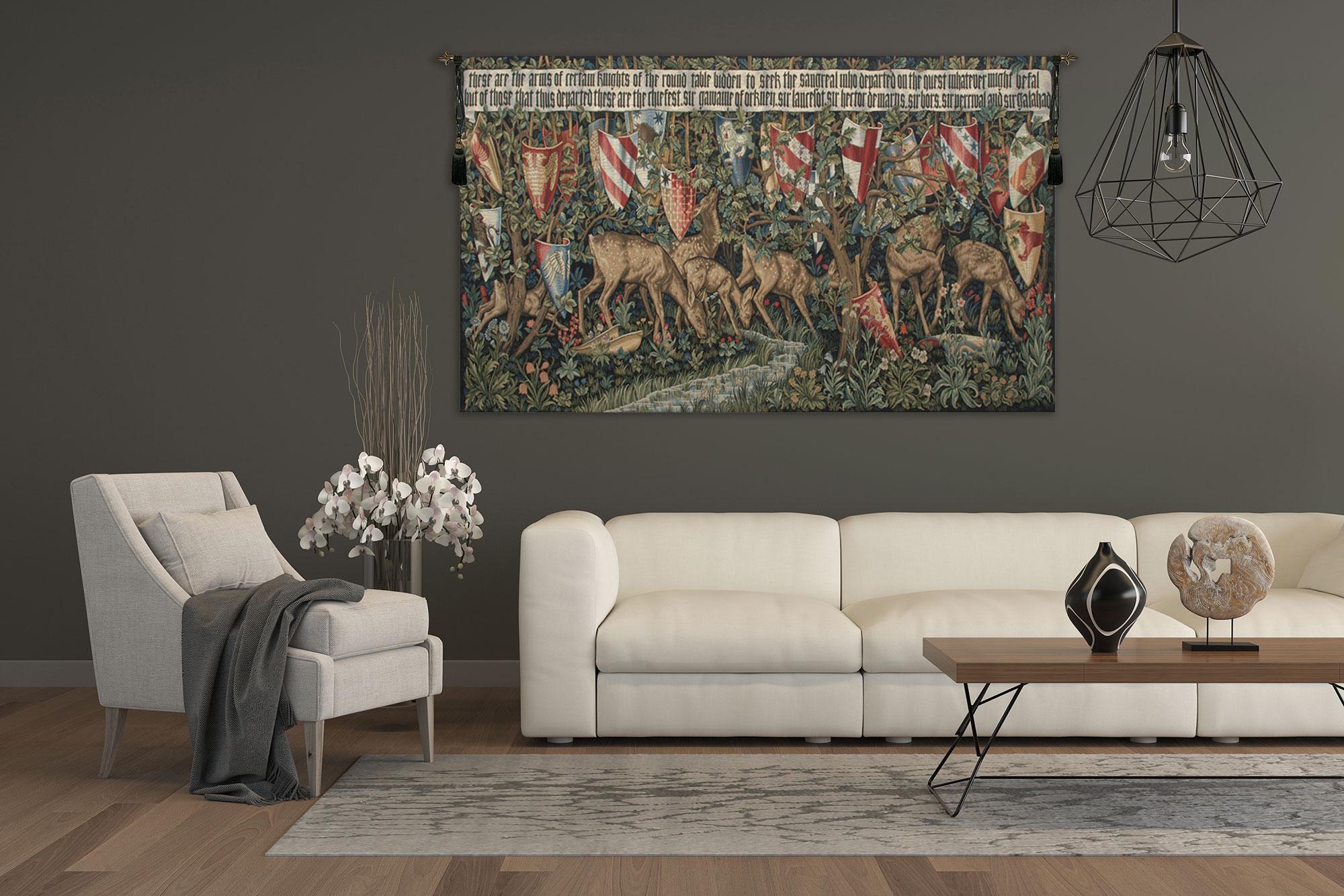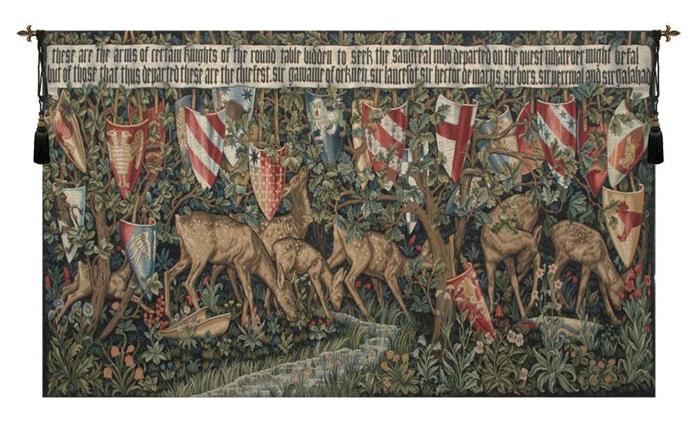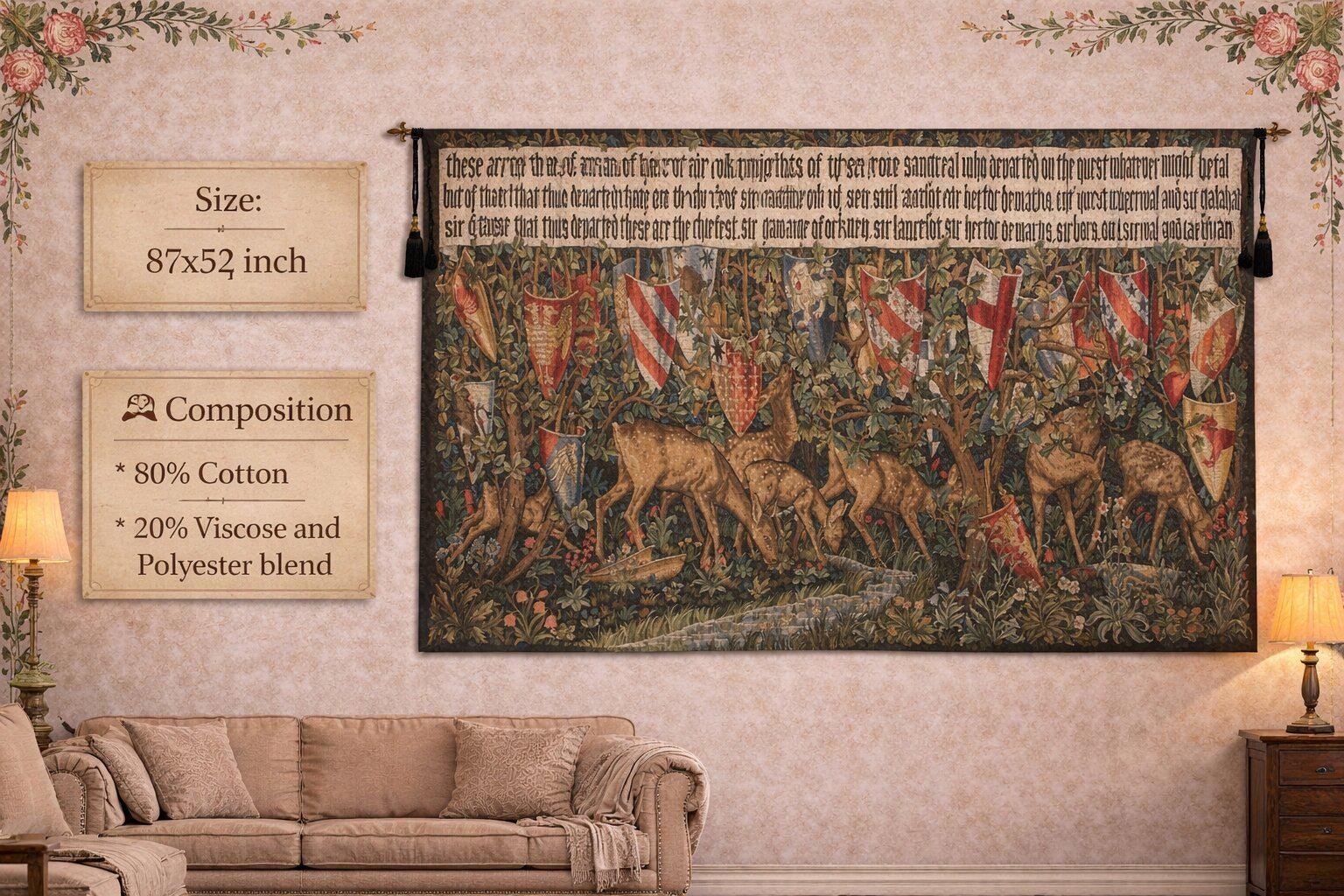 Inspired by the legendary works of Edward Burne-Jones and Morris & Co., this tapestry blends natural verdure scenery with medieval symbolism. The composition showcases graceful deer among lush foliage, surrounded by banners representing the Knights of the Round Table, creating a rich narrative rooted in Arthurian legend.