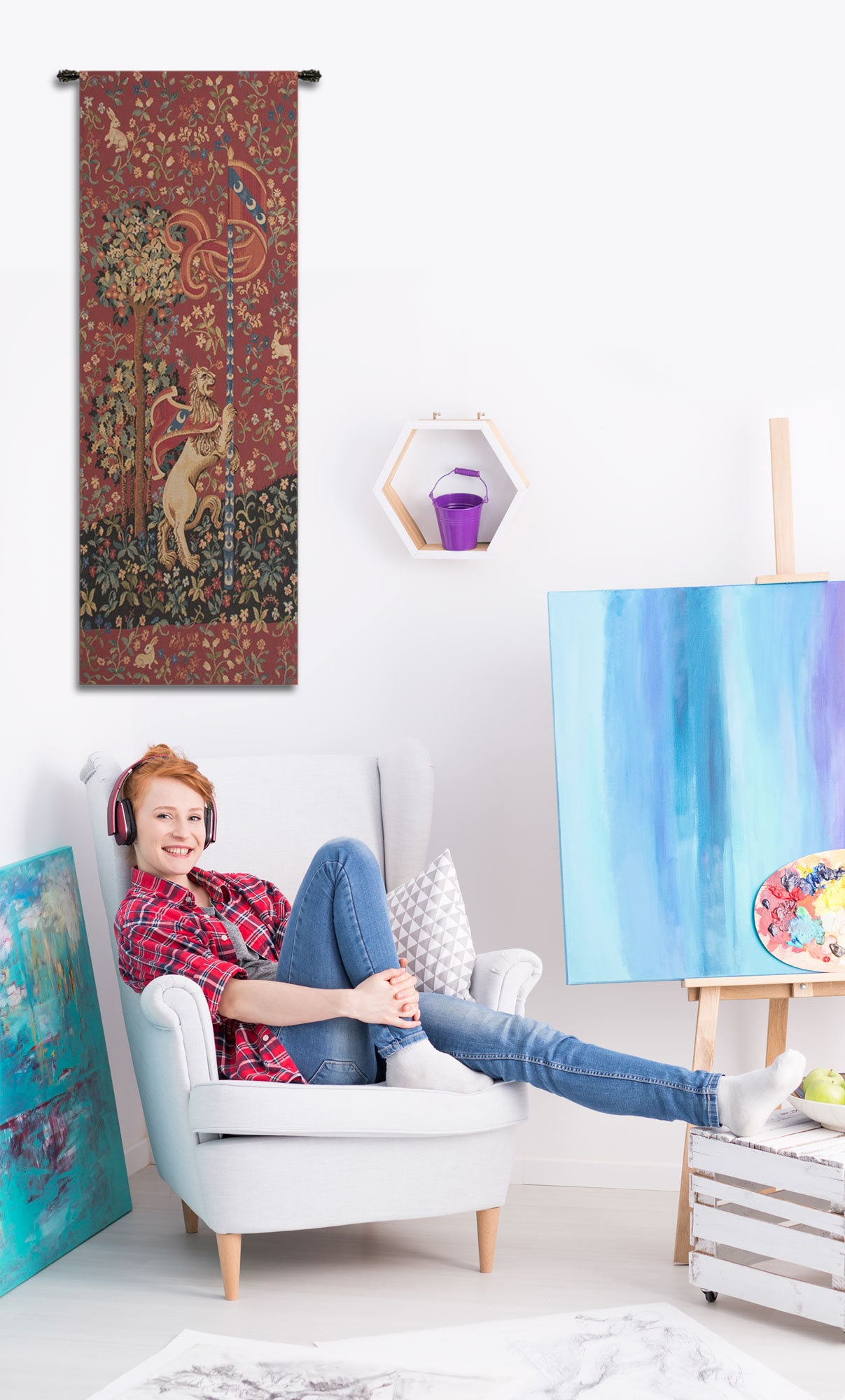The artwork is an extract from the famous set of 6 medieval tapestries Lady and the Unicorn. Woven in about 1511, they feature the arms of Jean le Viste and are now housed in the Cluny Museum, Paris.
