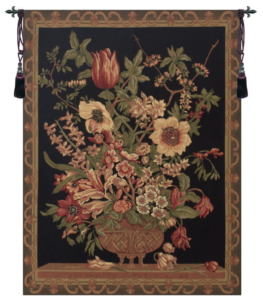 This wall tapestry hanging vertical showcases a wildly blooming floral centerpiece set against a deep black background, making it a bold and elegant choice for living rooms, hallways, or bedrooms. Woven in Belgium with a soft cotton blend, this wall tapestry woven offers a textural sheen and exceptional quality. Make this piece the centerpiece of your home, adding charm and vibrancy to any space.