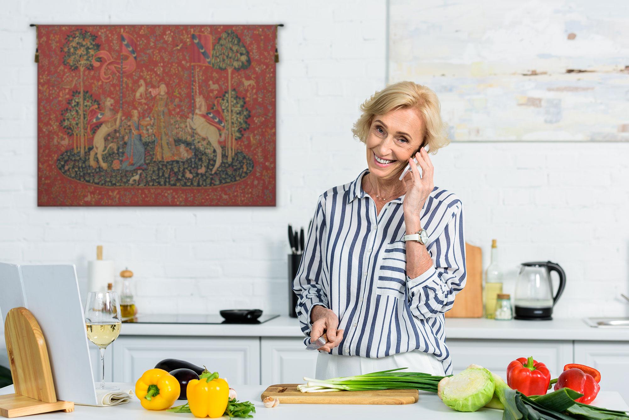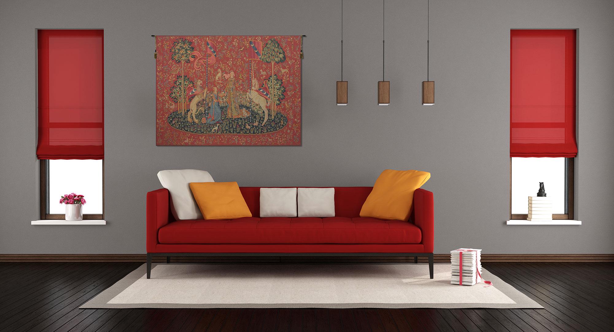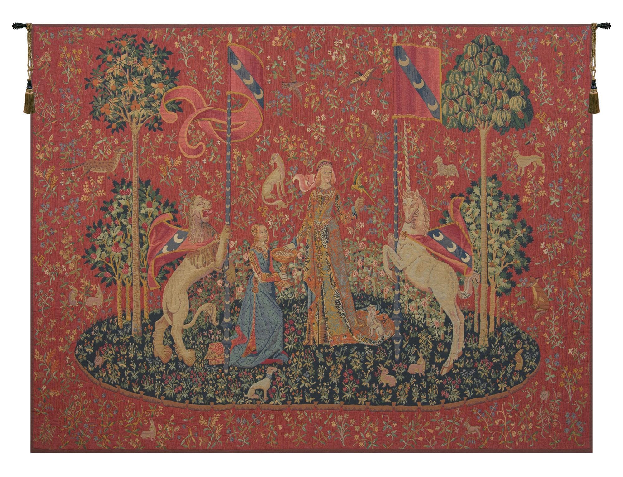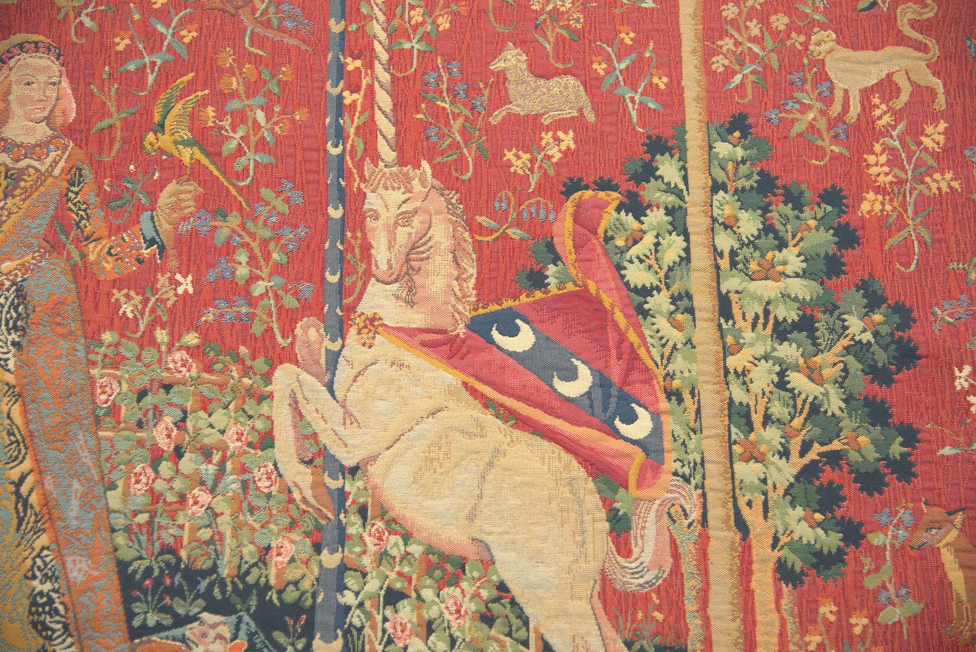 Le Desir Fonce, or Desire, is a Belgian wall tapestry made in Belgium.  It comes from the The Lady with the Unicorn series originally woven in 1510 by Willem de Pannemaker, and featuring the arms of Jean le Viste who originally commissioned the 6 tapestries.  Each represent one of the senses except for the final A Mon Seul Desir, commonly considered to be a declaration of love.