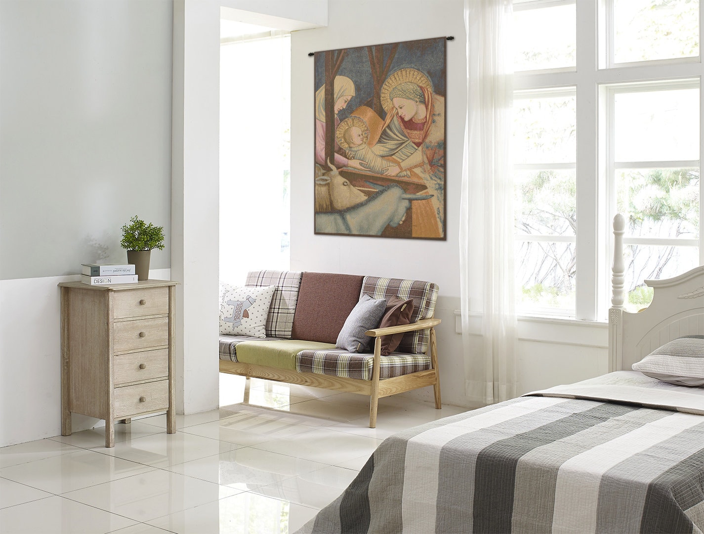 Celebrate the beauty of sacred art with the Nativity, Giotto Left Panel Wall Tapestry โ a stunning Italian Jacquard woven masterpiece inspired by the Nativity fresco of Giotto di Bondone (1267โ1337).