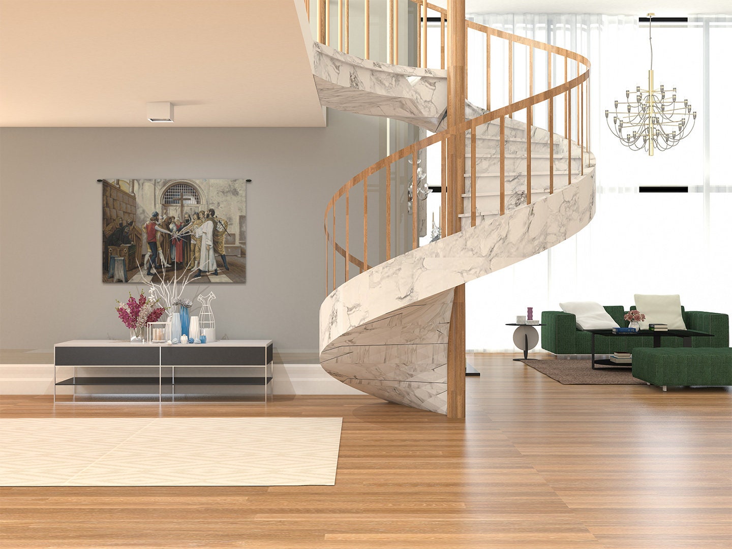 Oath is an Italian jacquard wall tapestry. The artowrk is Inspired by the painting Oath Of Pontida by Mosè Bianchi (1840 - 1904). The Oath of Pontida in history was was a medieval alliance formed in 1167 to counter the attempts by the Holy Roman Emperors from the House of Hohenstaufen to assert Imperial influence over Italy. At its apex it included most of the cities of Northern Italy, although its membership changed with time, and was supported by the Pope. With the death of the third and last Hohenstaufen emperor Frederick II in 1250 it became obsolete and was disbanded.
