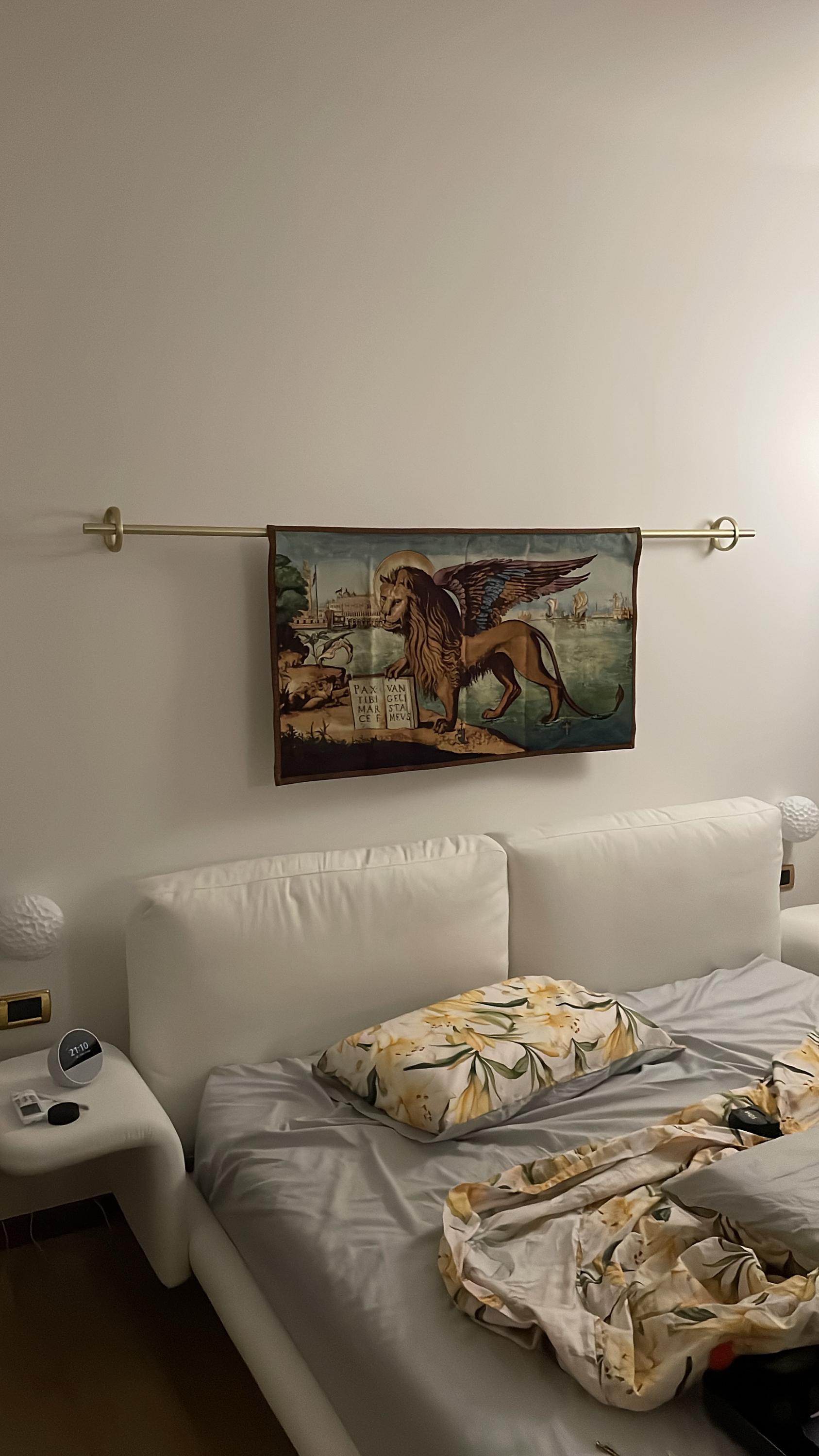 Lion Arrives in Venice is an Italian jacquard wall tapestry. This artwork comes from Lion of St. Mark by Venetian painter Vittore Carpaccio (c.1460–1525/6). The Lion of Venice is an ancient bronze winged lion sculpture in the Piazza di San Marco (St Mark's Square) of Venice, Italy, which came to symbolize the city as well as one of its patron saints, St Mark after its arrival there in the 12th century.
