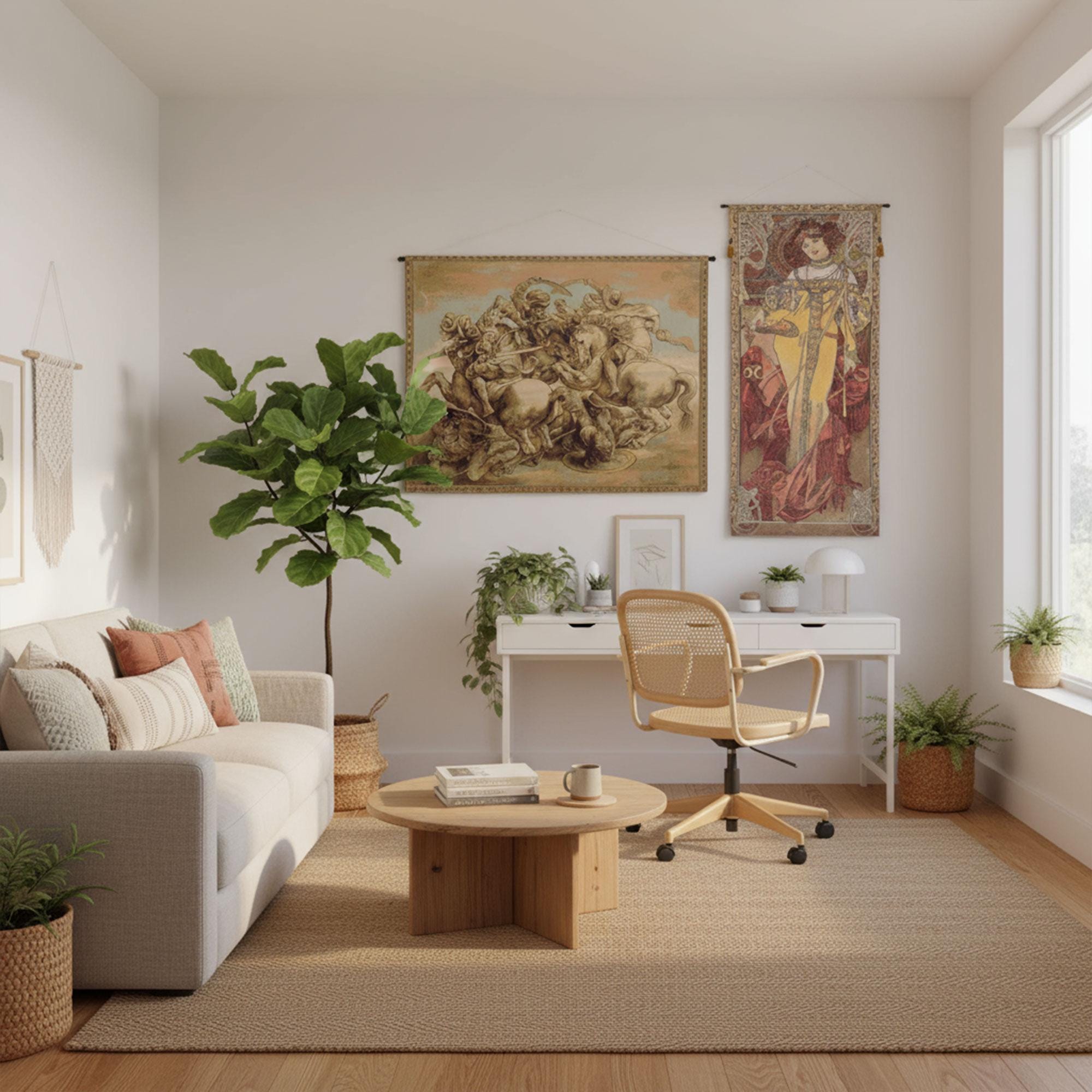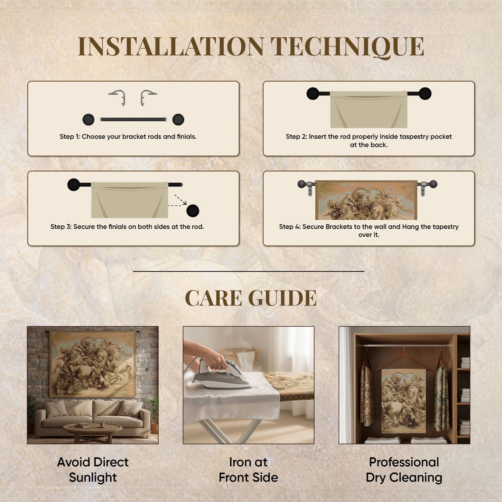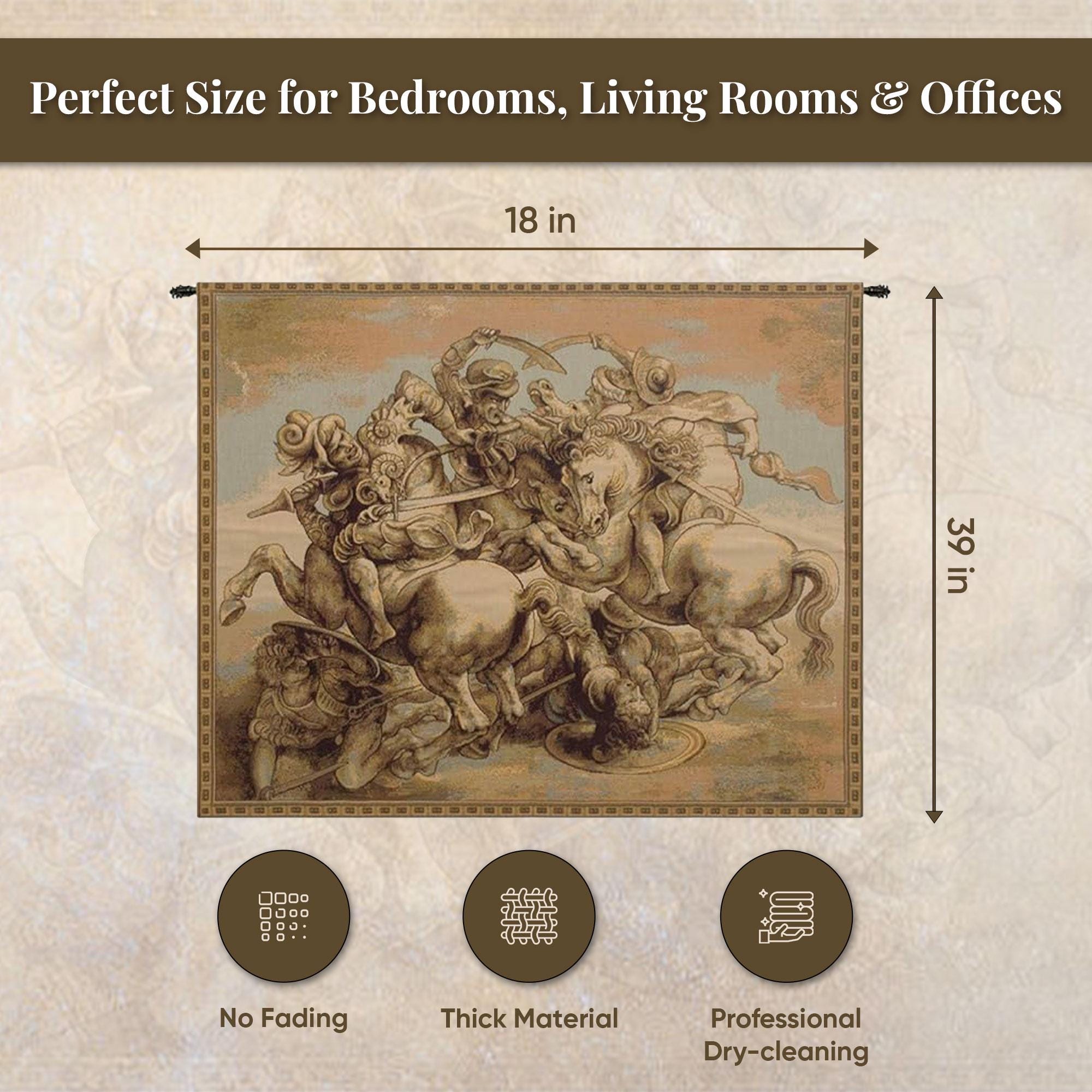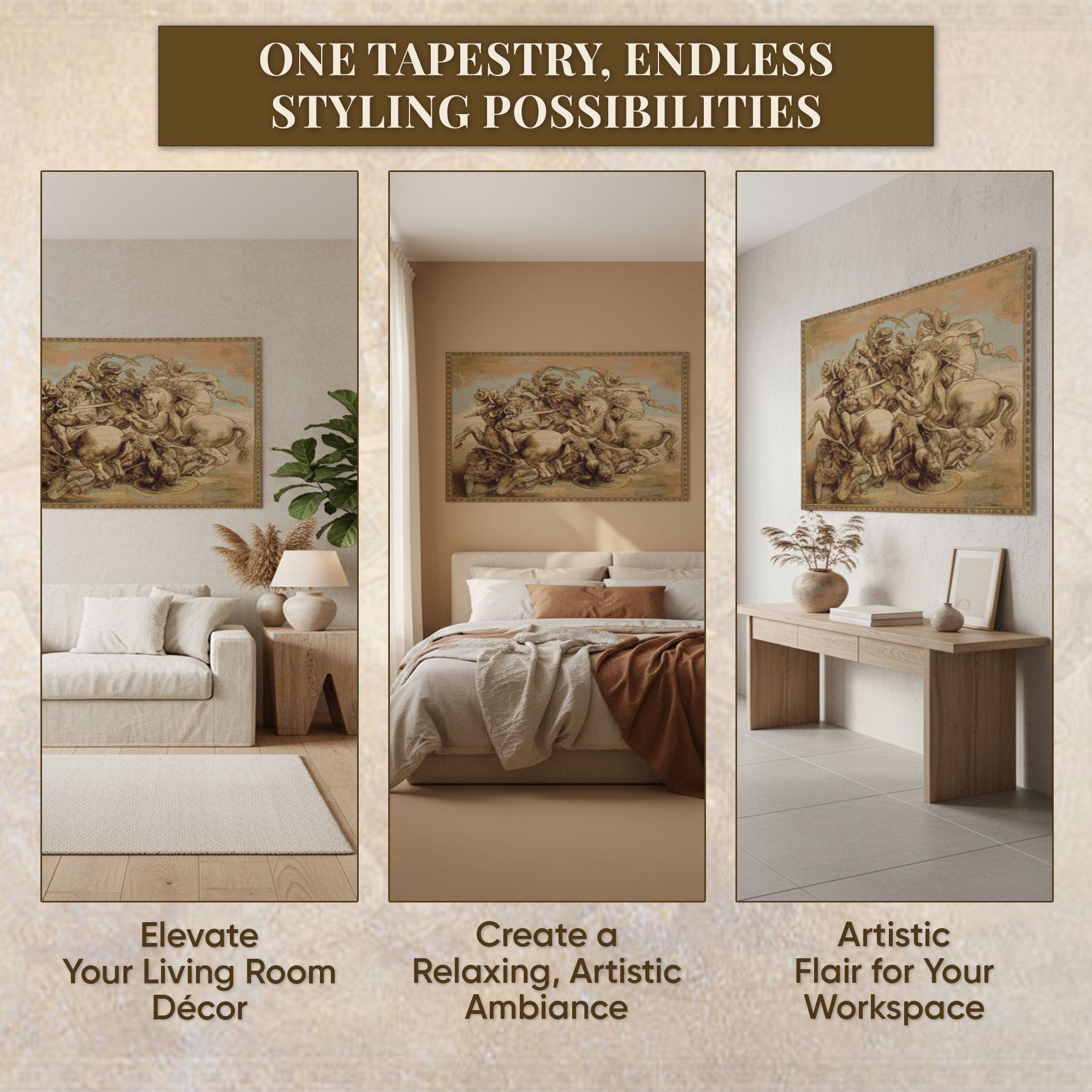 The Battle of Anghiari is an Italian jacquard wall tapestry. The artwork is from a lost painting est. 1505 by Renaissance Master Leonardo da Vinci. The composition of the central section is best known through a drawing by Peter Paul Rubens in the Louvre, Paris. This work, dating from 1603 and known as The Battle of the Standard, was based on an engraving of 1553 by Lorenzo Zacchia, which was taken from the painting itself or possibly derived from a cartoon by Leonardo.