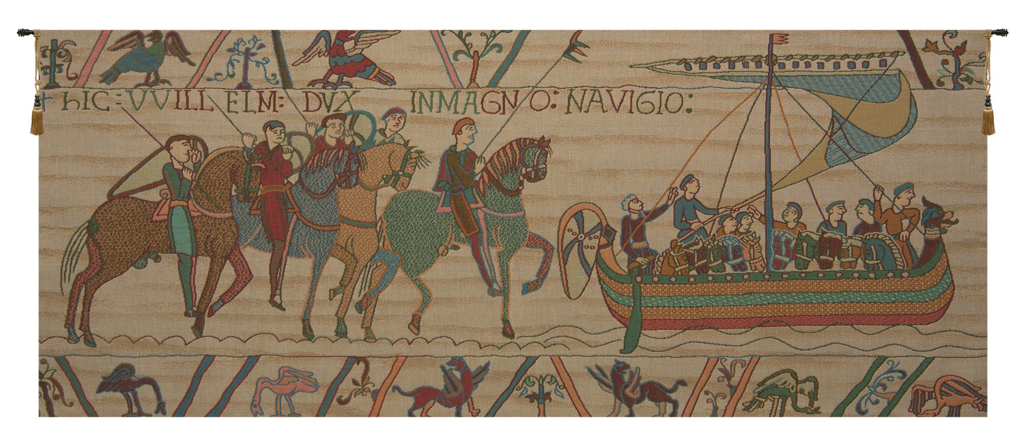 Part of Bayeux, this jacquard wall tapestry is an extract of queen Mathilde's tapestry. The original some 230 feet long, is in the Bayeux museum in Normandy. It describes how England was conquered by Normans.