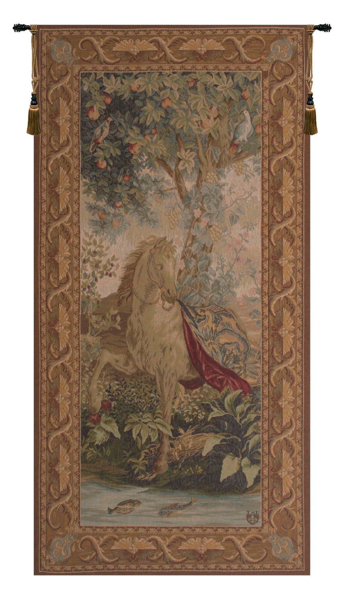 Le Point D'eau Cheval is a French jacquard woven impressionist tapestry inspired from the famous Tentures Des Indes, or Hangings of India, a set of 8 tapestries designed during the 18th century and woven at Gobelins. The original artwork was designed by Albert Eckhout, a famous 17th-century artist. This small extract depicts a horse in the exotic flora and fauna of the Dutch colonies.