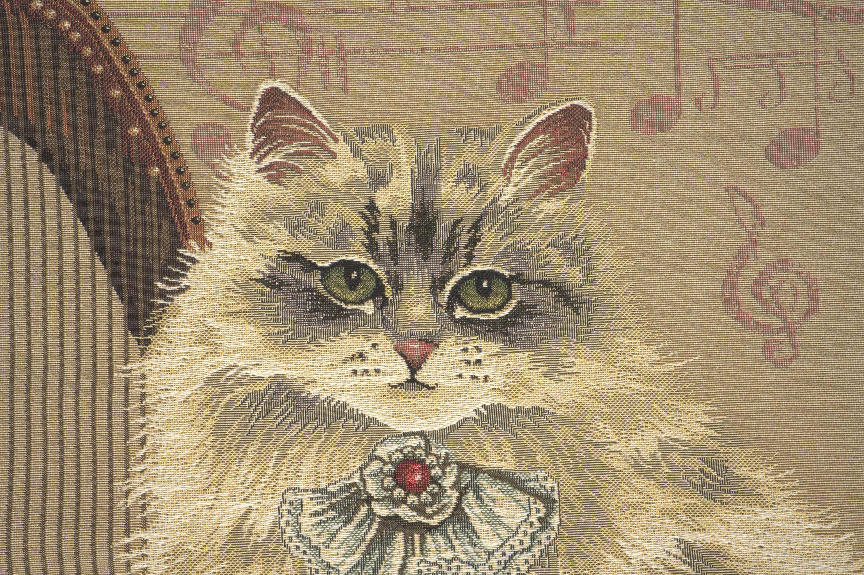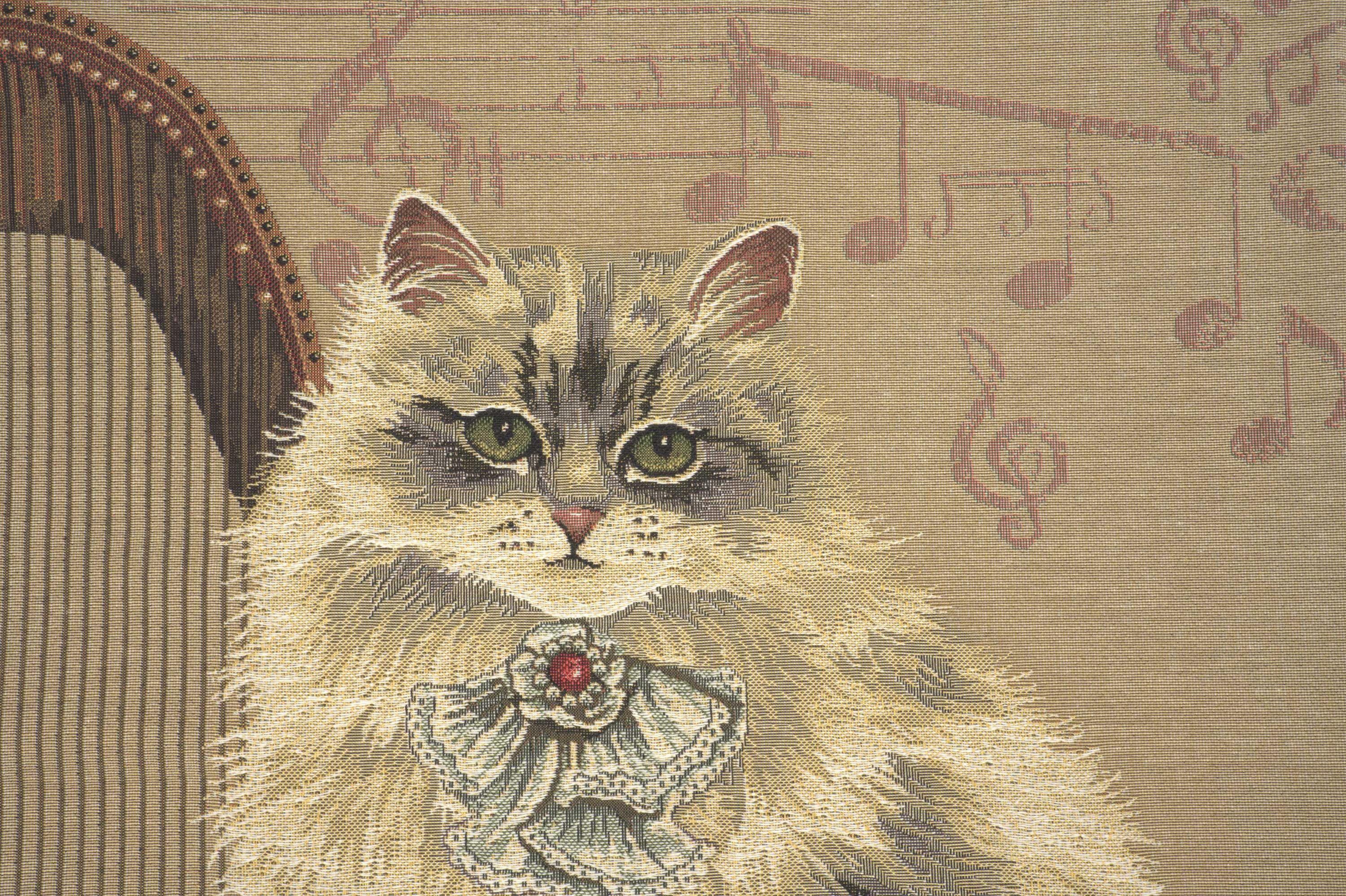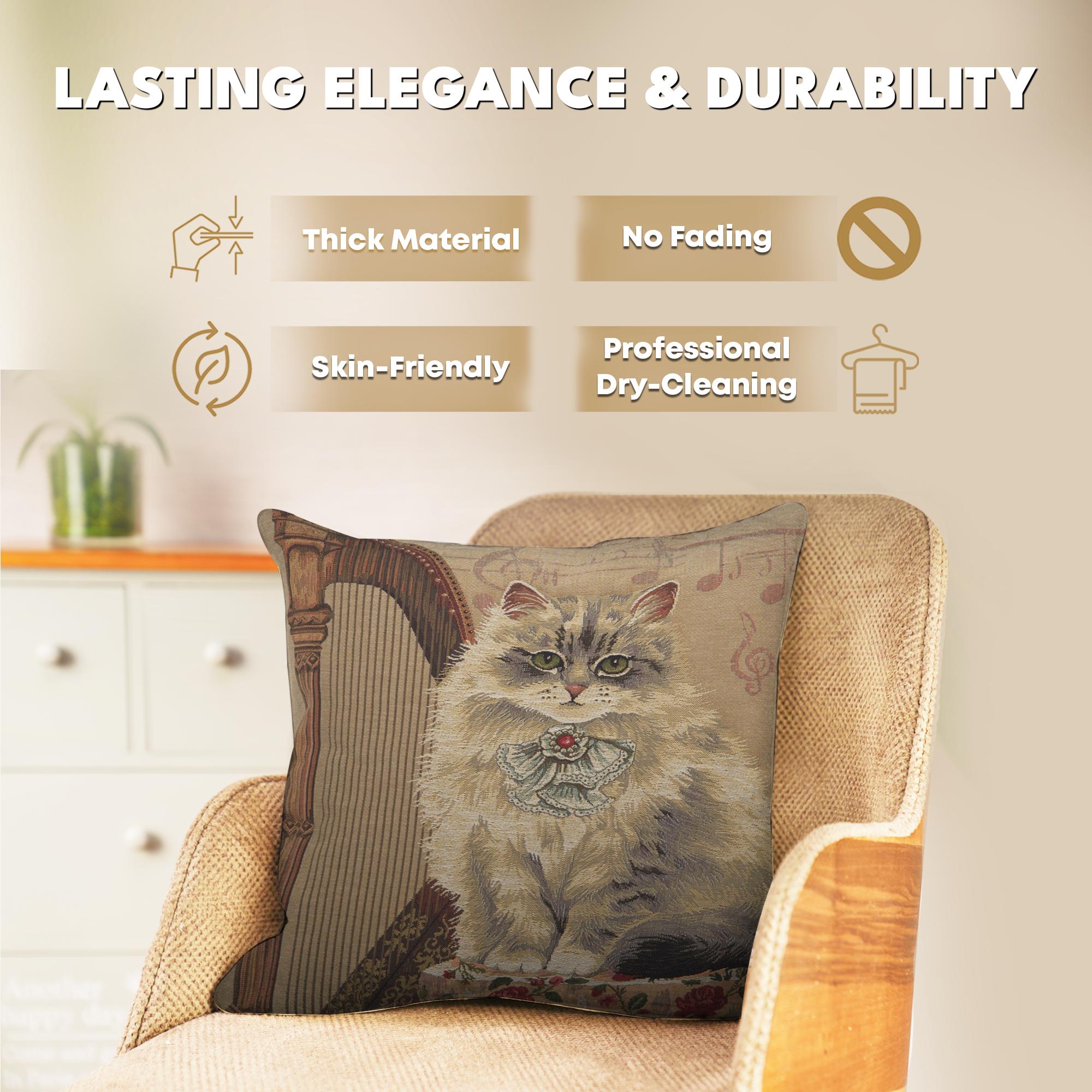 A whimsical touch for cat lovers. The Cat with Harp tapestry pillow case is a charming addition to any home. This decorative pillow covers features an artistic depiction of a cat amidst musical notes and a harp, blending sweetness with sophistication.