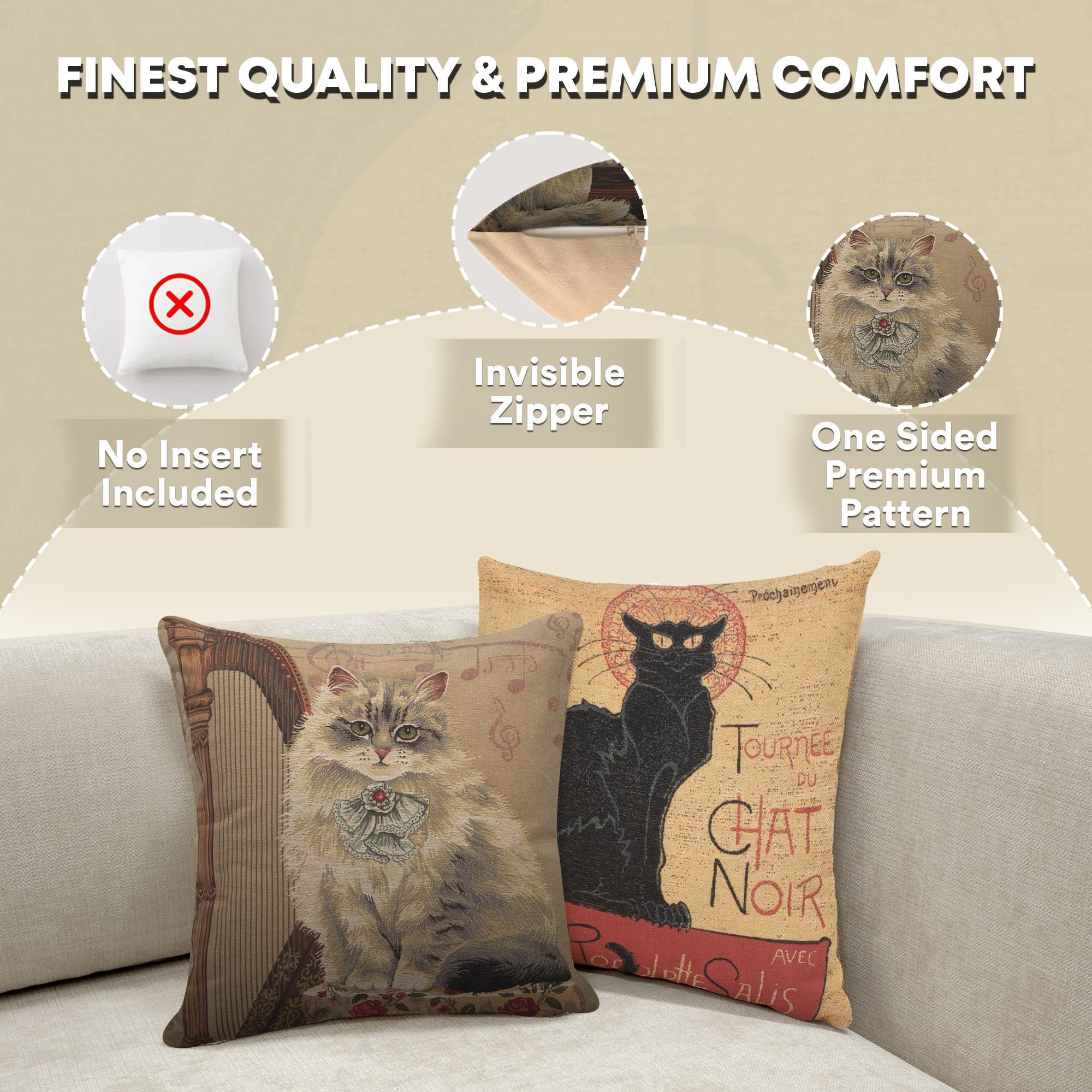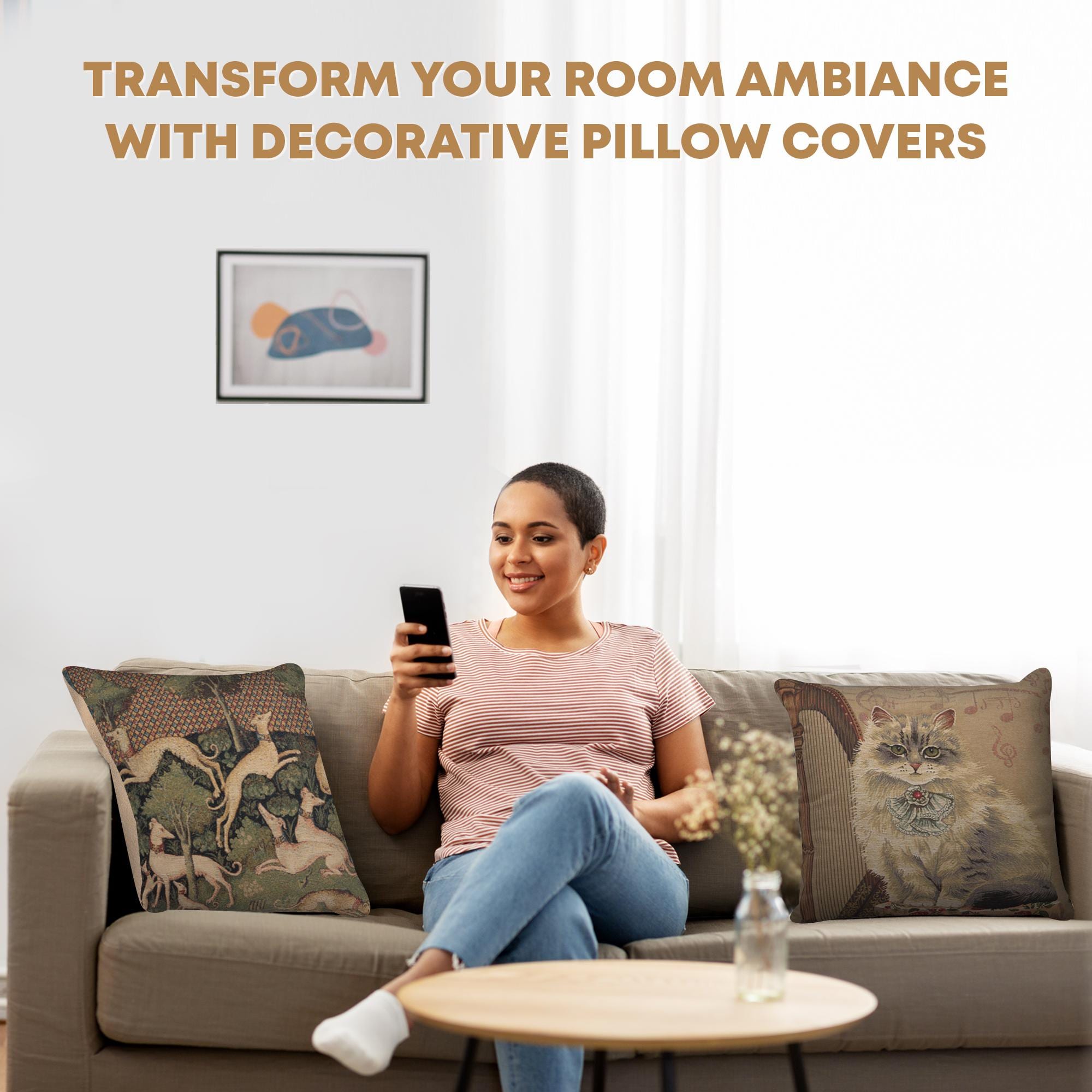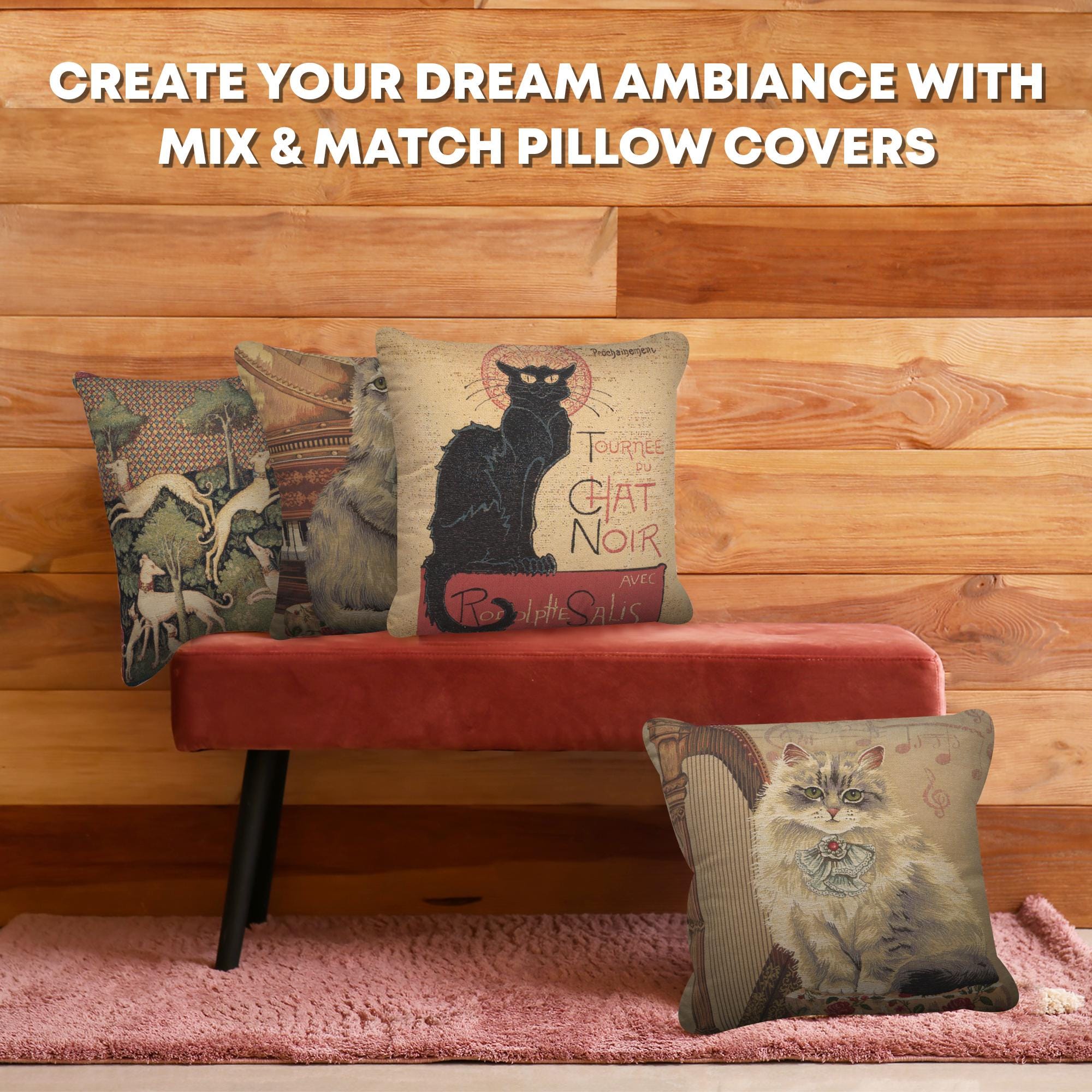 A whimsical touch for cat lovers. The Cat with Harp tapestry pillow case is a charming addition to any home. This decorative pillow covers features an artistic depiction of a cat amidst musical notes and a harp, blending sweetness with sophistication.
