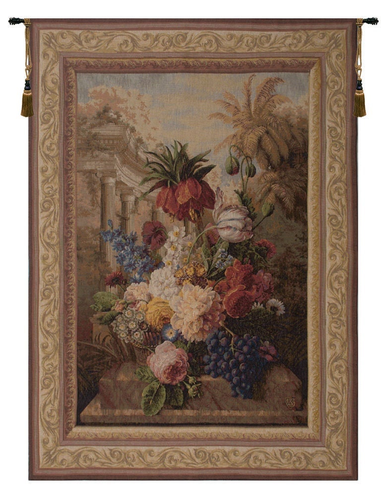 Bouquet Exotique is inspired from the work of Jan Frans van Dael (1764-1840). A soft imagery of a flower and fruit bouquet is laid on a marble console amid an exotic garden. Also known as Exotic Bouquet. This fine art tapestry makes a perfect addition to any home decor motif.