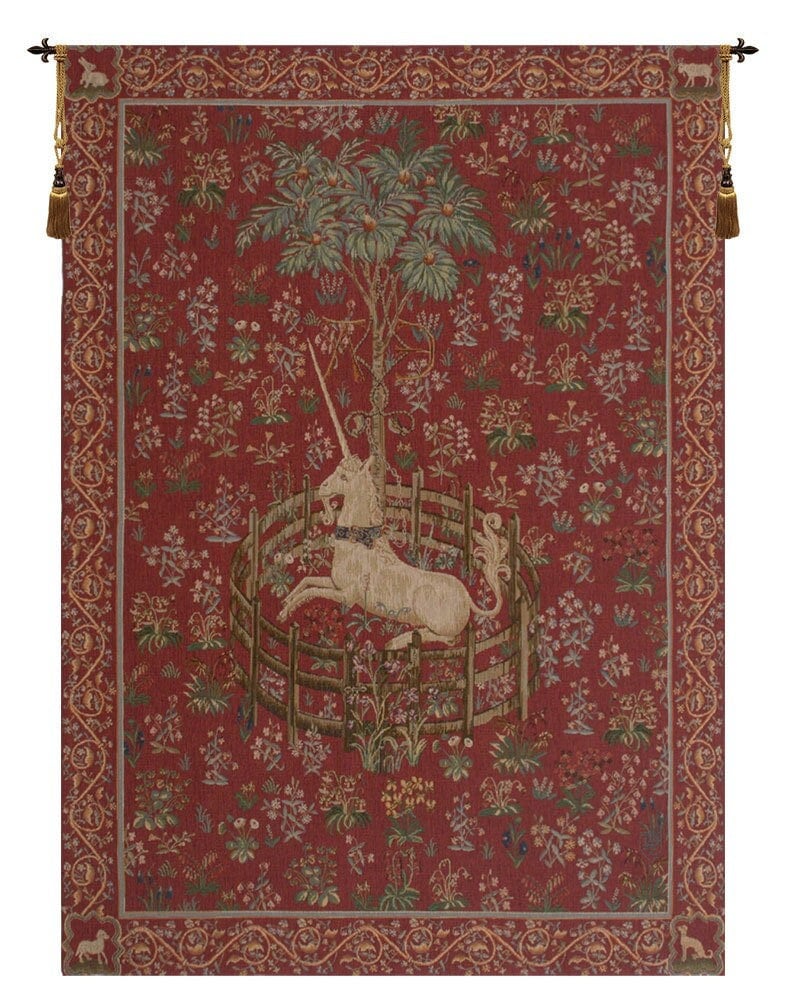 ๐๐ข๐๐จ๐ซ๐ง๐ ๐๐๐ฉ๐ญ๐ข๐ฏ๐ ๐๐จ๐ฎ๐ ๐ ๐ข๐ฌ ๐ ๐ซ๐๐ง๐๐ข๐ญ๐ข๐จ๐ง ๐จ๐ ๐ญ๐ก๐ ๐๐๐ซ๐ฅ๐ฒ ๐๐๐ญ๐ก ๐๐๐ง๐ญ๐ฎ๐ซ๐ฒ ๐ฌ๐๐ซ๐ข๐๐ฌ ๐๐๐ฅ๐ฅ๐๐, Chasse a la Licorne, or The Hunt of the Unicorn. The originals now reside in the Metropolitan Cloisters, New York. This artisan-crafted designer jacquard wall tapestry is also known as Captive Unicorn in Red and Unicorn Quest.