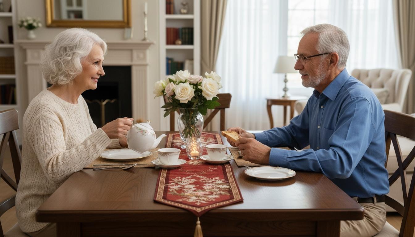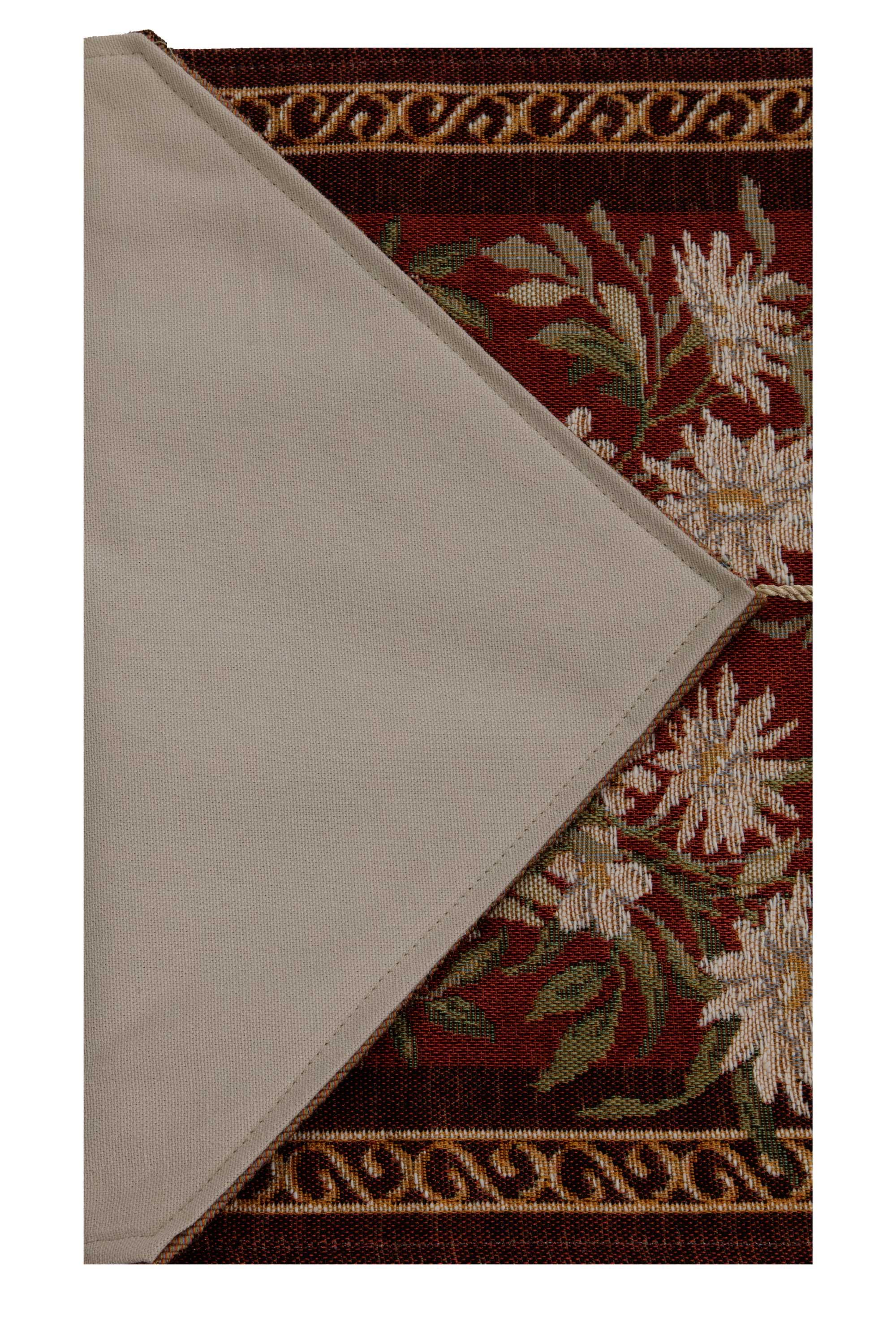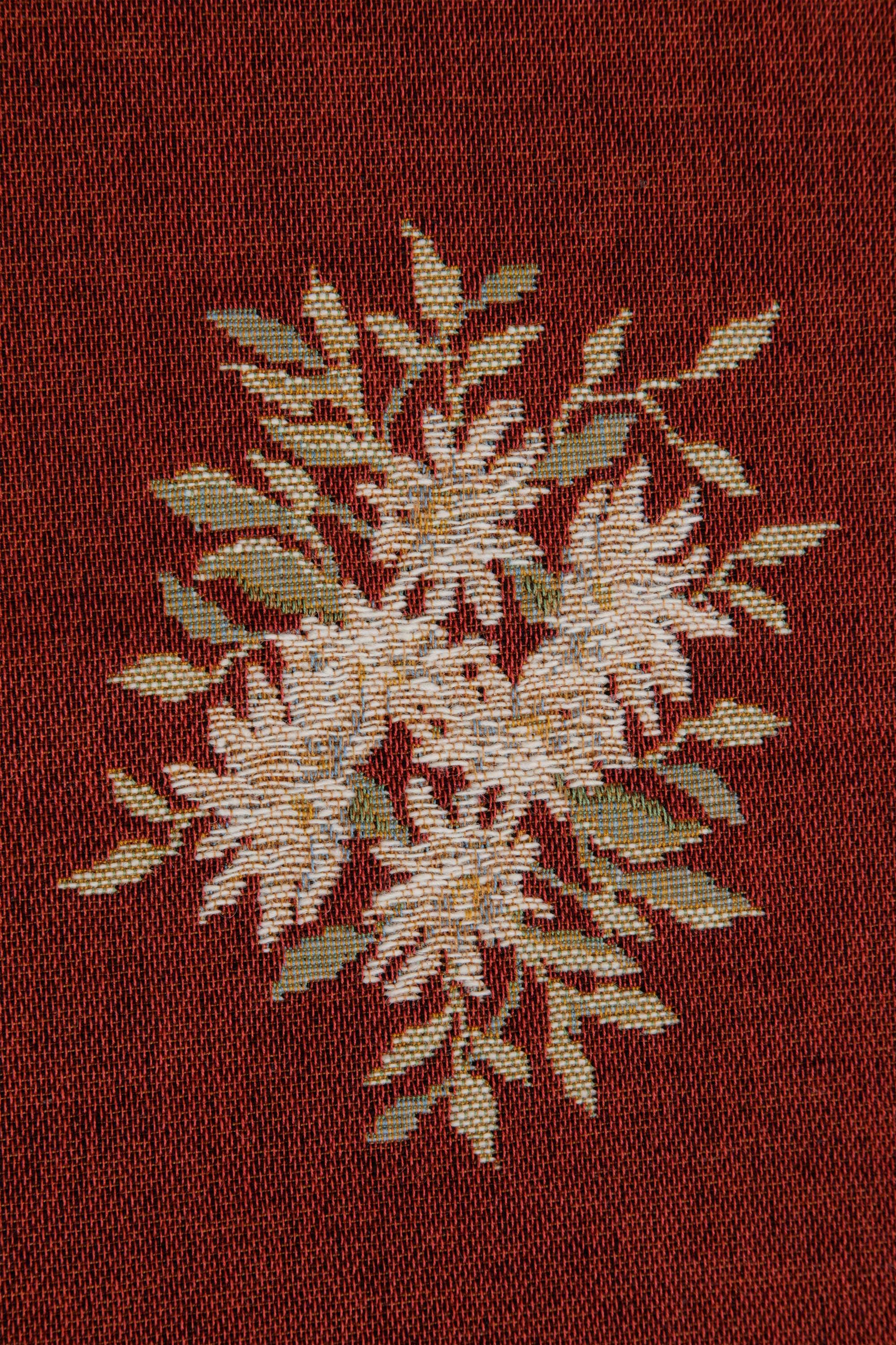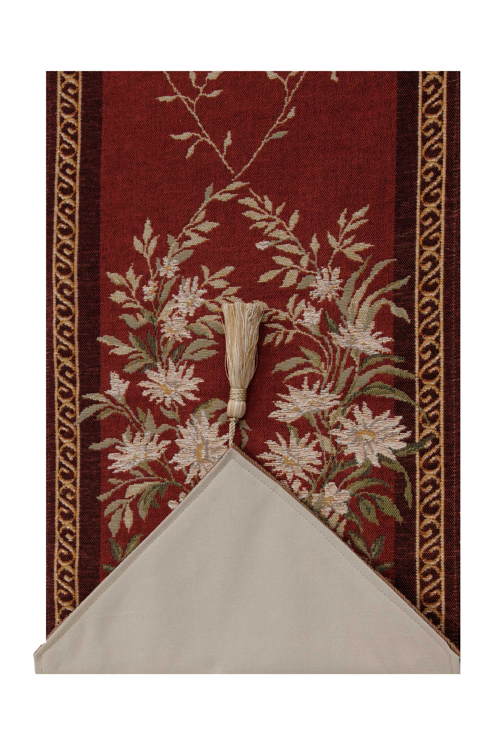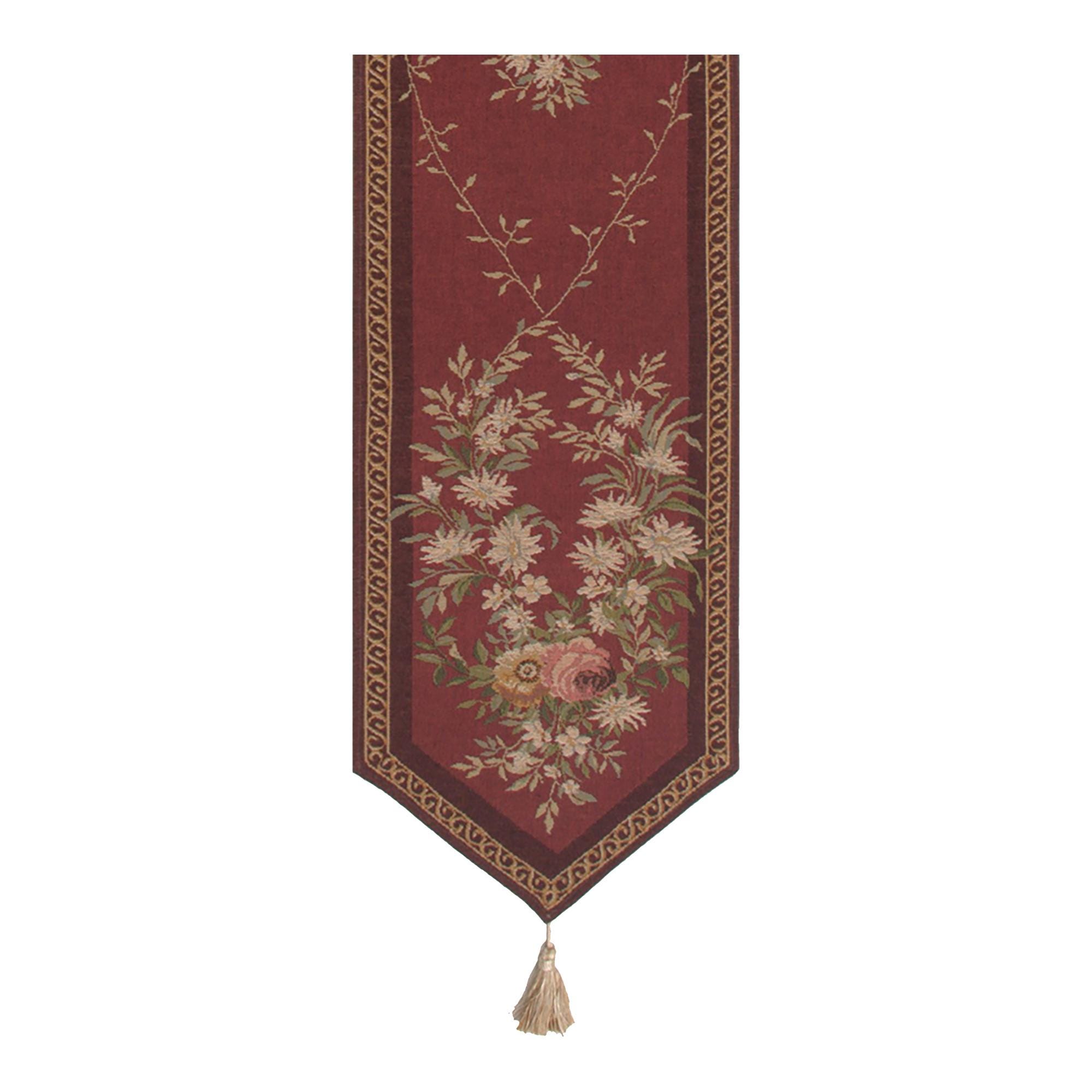 This French table runner tapestry, Aubusson Red, shows an elegant garland of flowers on a deep red background.