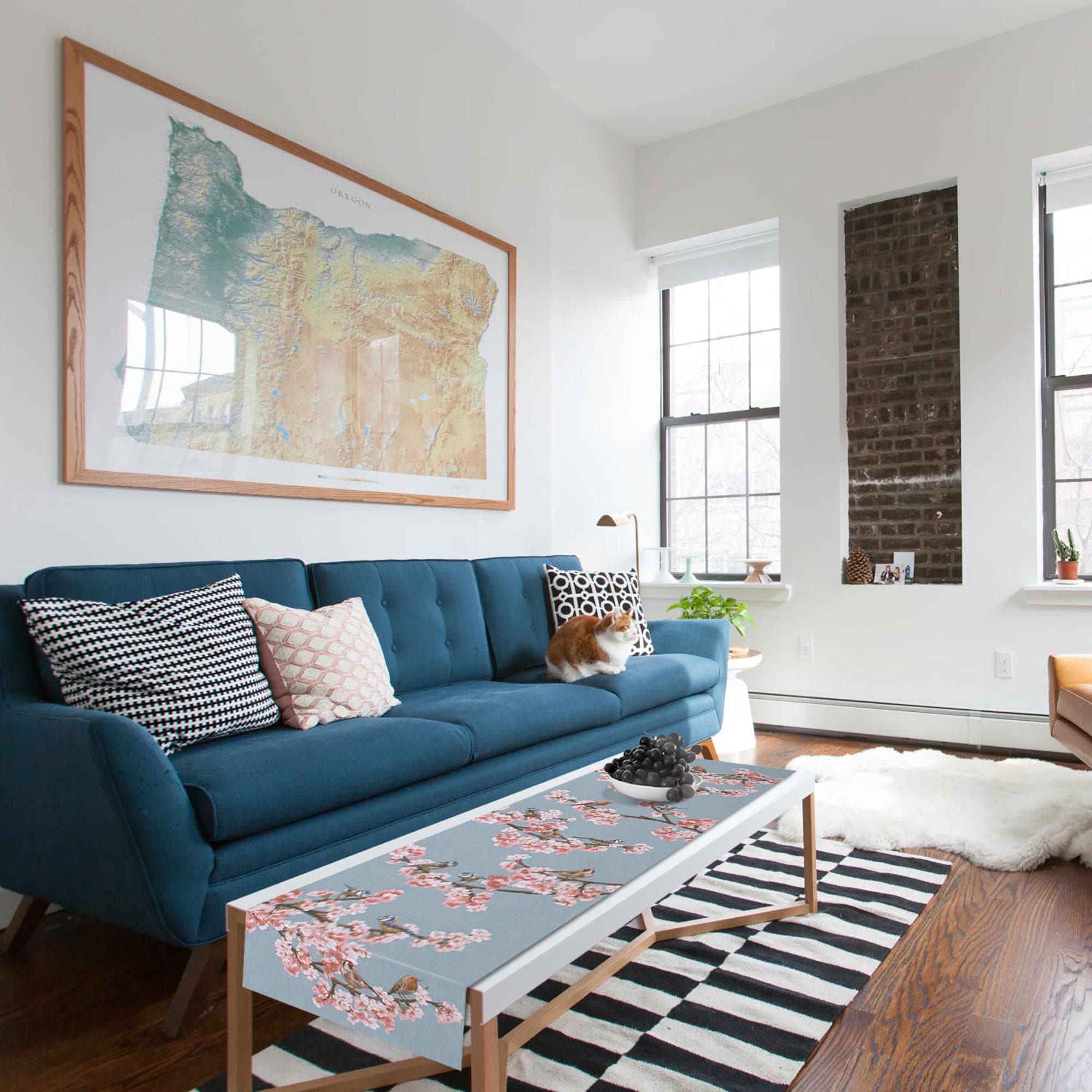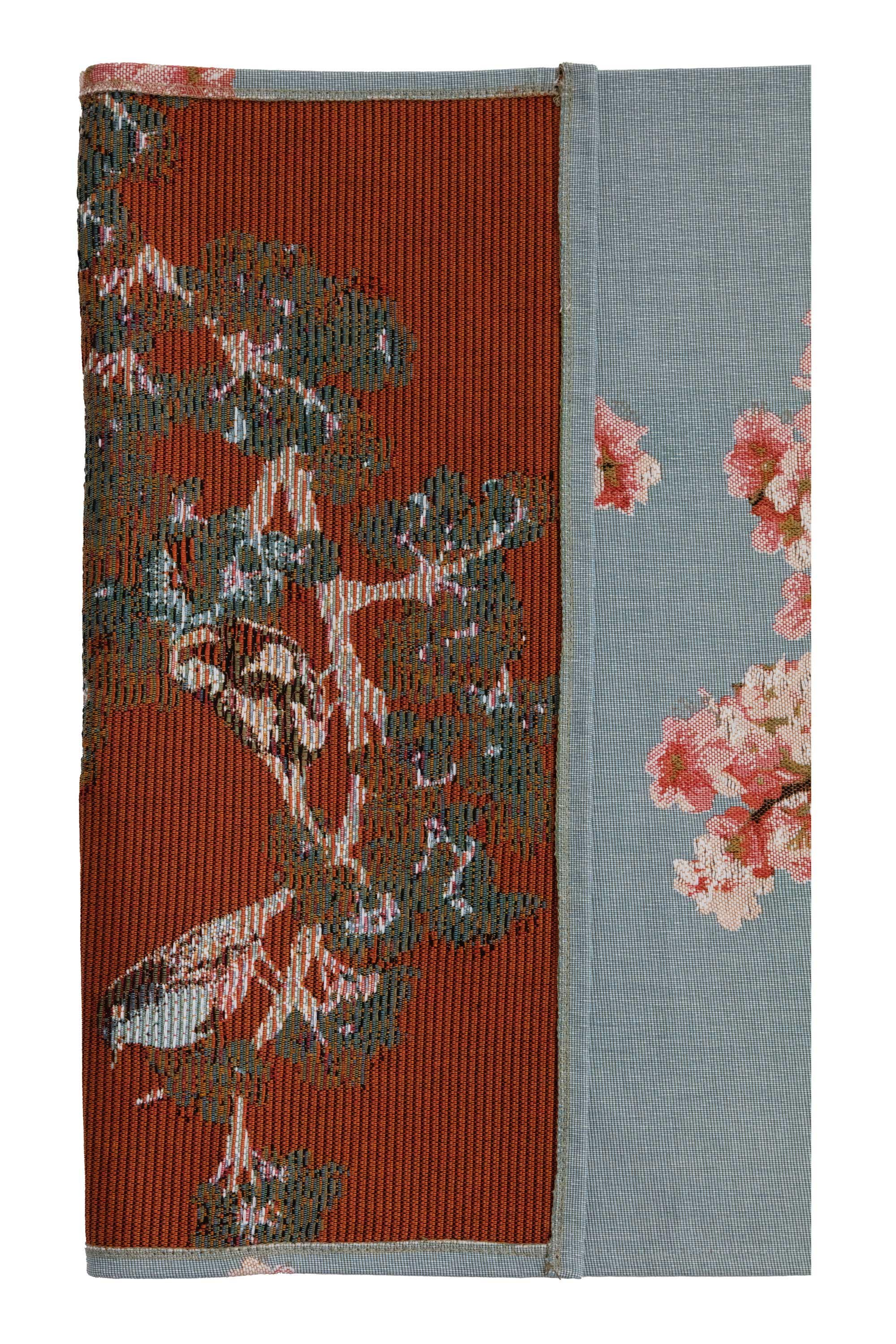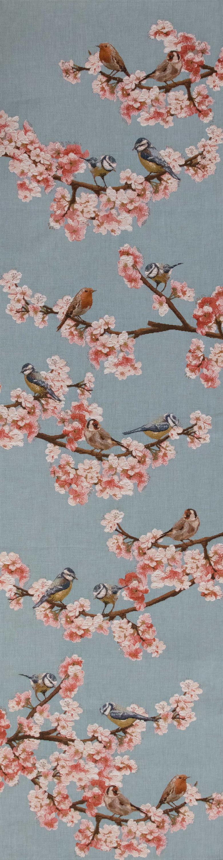 Welcome the beauty of springtime birds and blossoming fruit trees into your home with this Passerines Branch Blue Jacquard Table Runner. Perfect for adding a touch of nature to your dining table, coffee table, or sideboard.