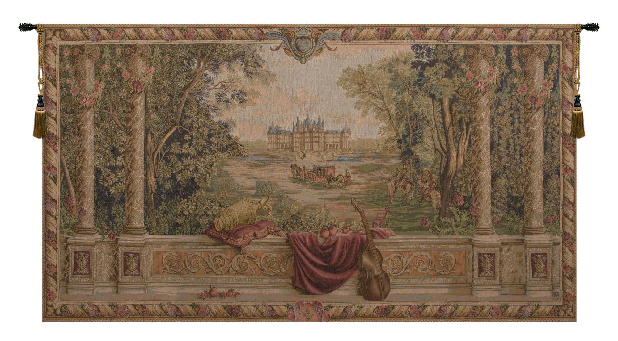 This jacquard-woven wall decor tapestry depicts a castle surrounded by green foliage, contrasted by a foreground of a columned terrace with a red drape, a pillowed pitcher, a violin, and fruit.