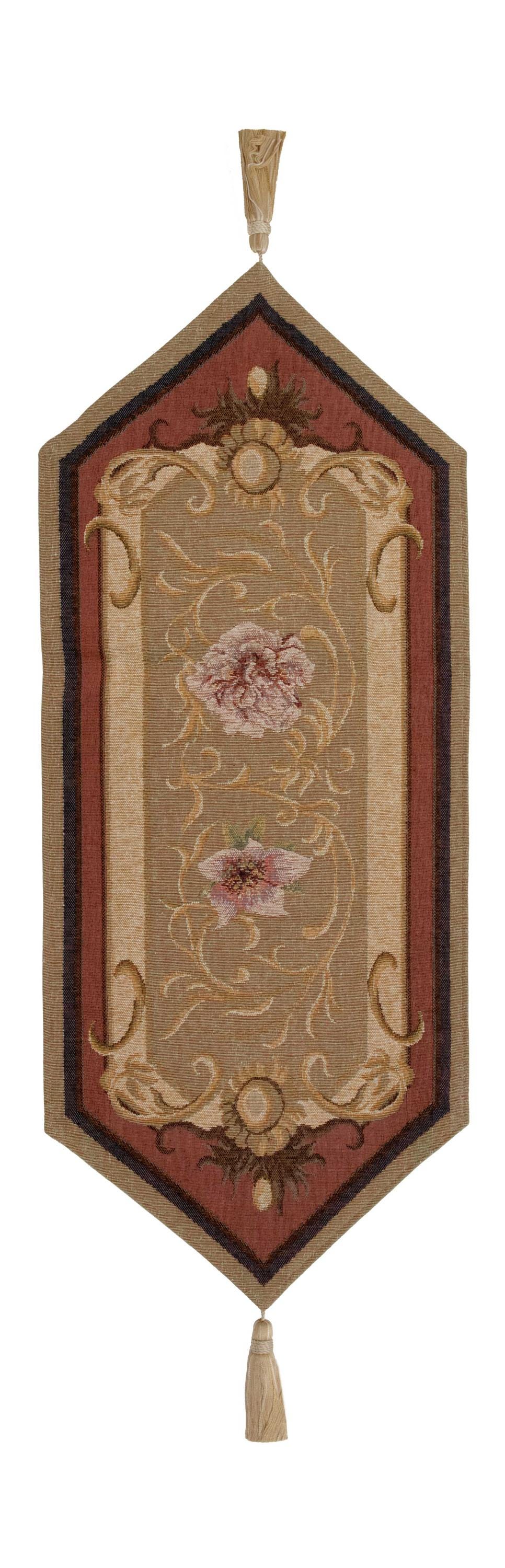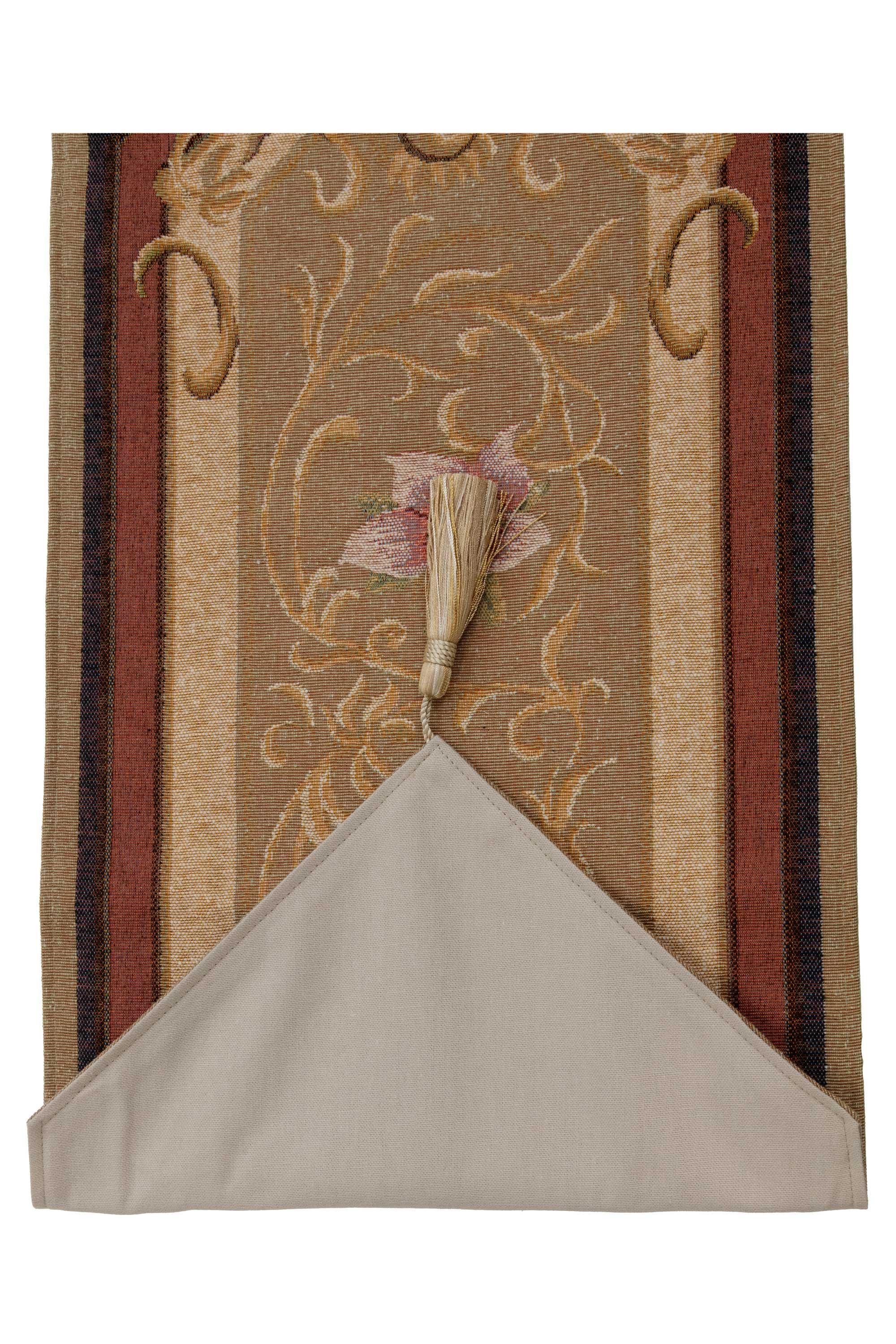 Our Josephine Table Runner Small brings the beauty of European woven décor to the home. This tapestry runner makes a lovely addition to any room. Center it on the top of a buffet in the traditional dining room. Or, place atop a cocktail table in the sitting room for a touch decoration. The runner comes woven in cotton/wool blend by expert French weavers. The tapestry reflects the artistry of 17th-century botanical motifs with scrolls and embellishments. The knife edges have decorative tassels attached. Tapestry table runner lined on back. Woven in France.