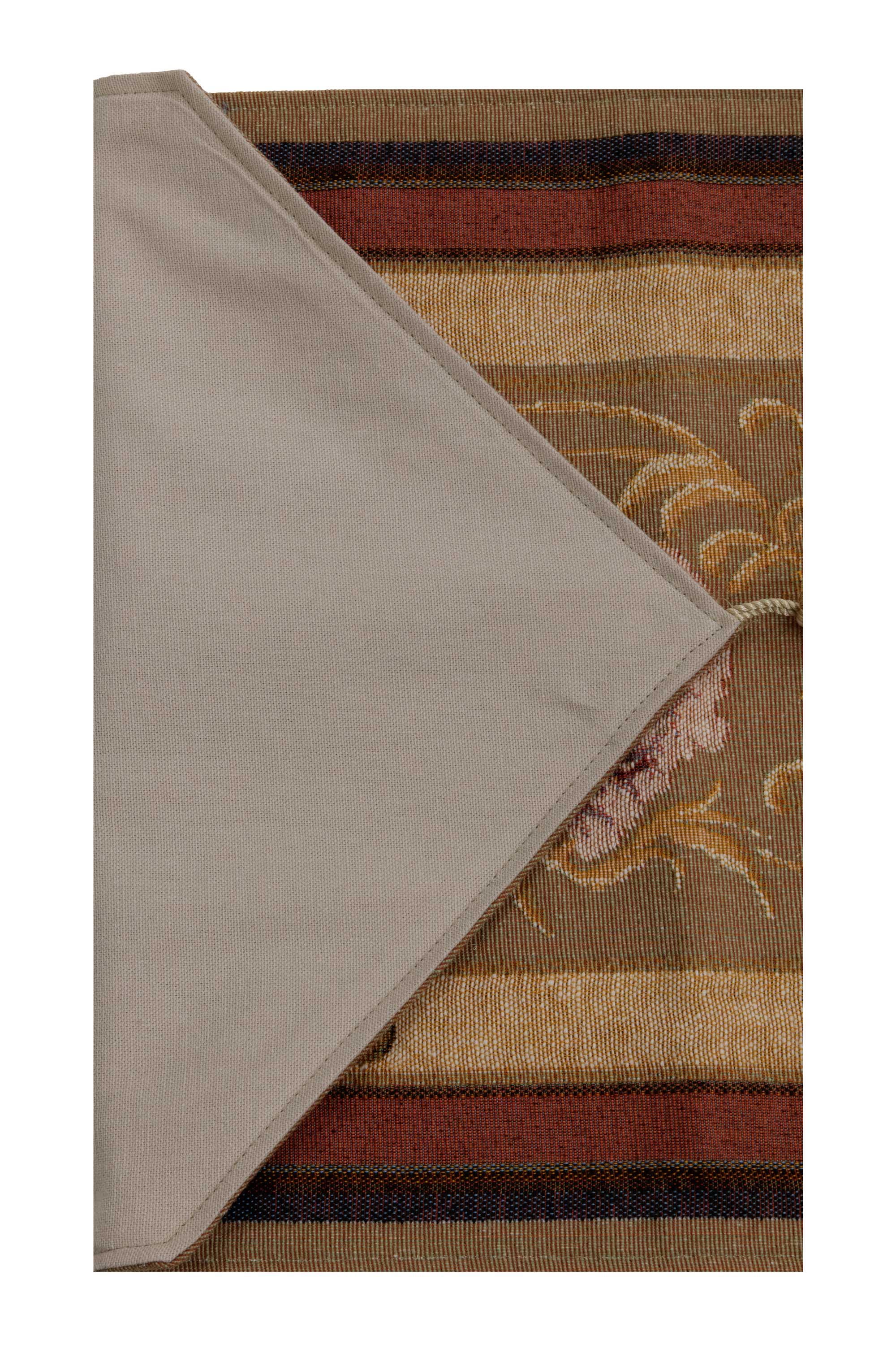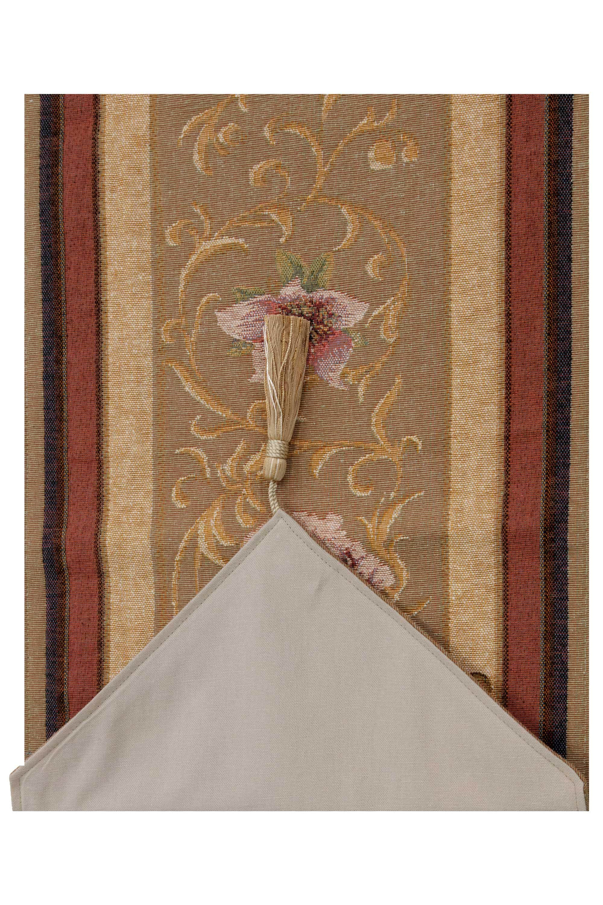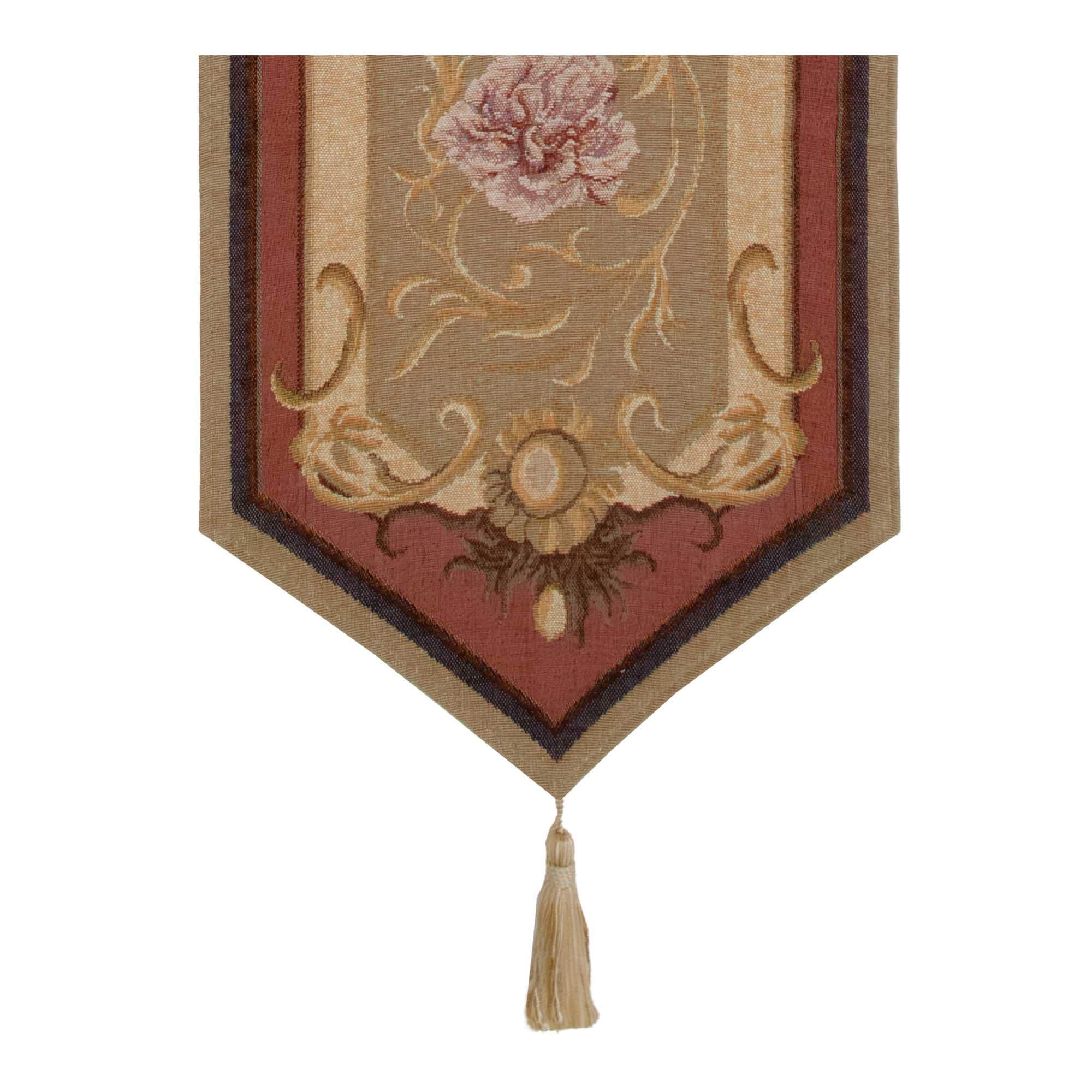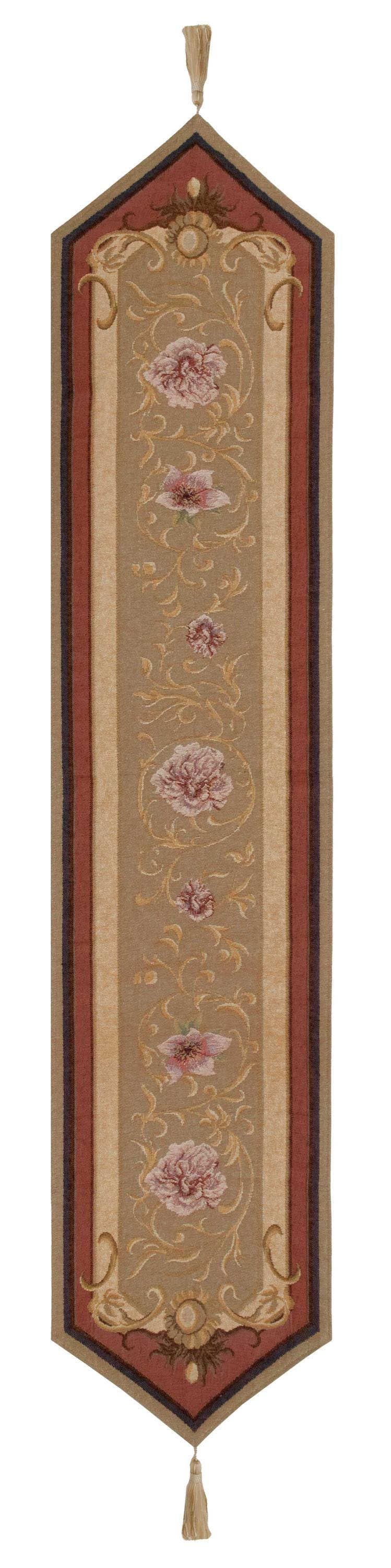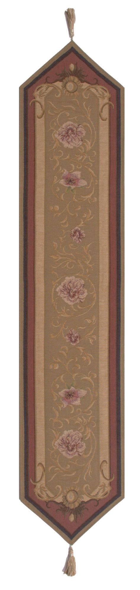 Our Josephine Tapestry Table Runner reflects the artistry of 17th century botanical motifs with scrolls and embellishments. It brings the beauty of European woven décor to the home. This tapestry runner makes a lovely addition to any room. Center it on the top of a buffet in the traditional dining room. The runner comes woven in cotton/wool blend by expert French weavers. Or, place atop a cocktail table in the sitting room for a touch decoration. The knife edges have decorative tassels attached. Tapestry table runner lined on back. Woven in France.