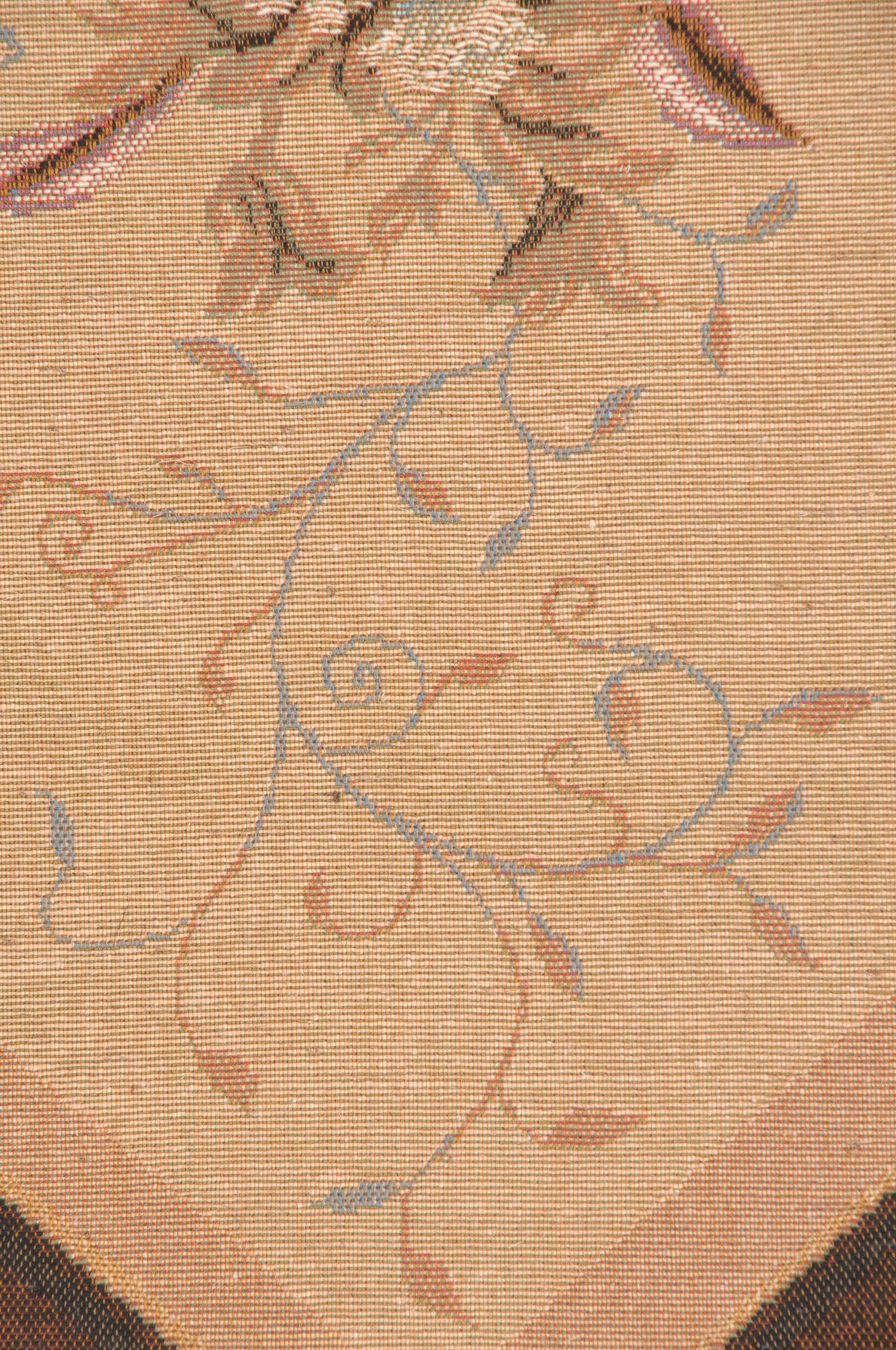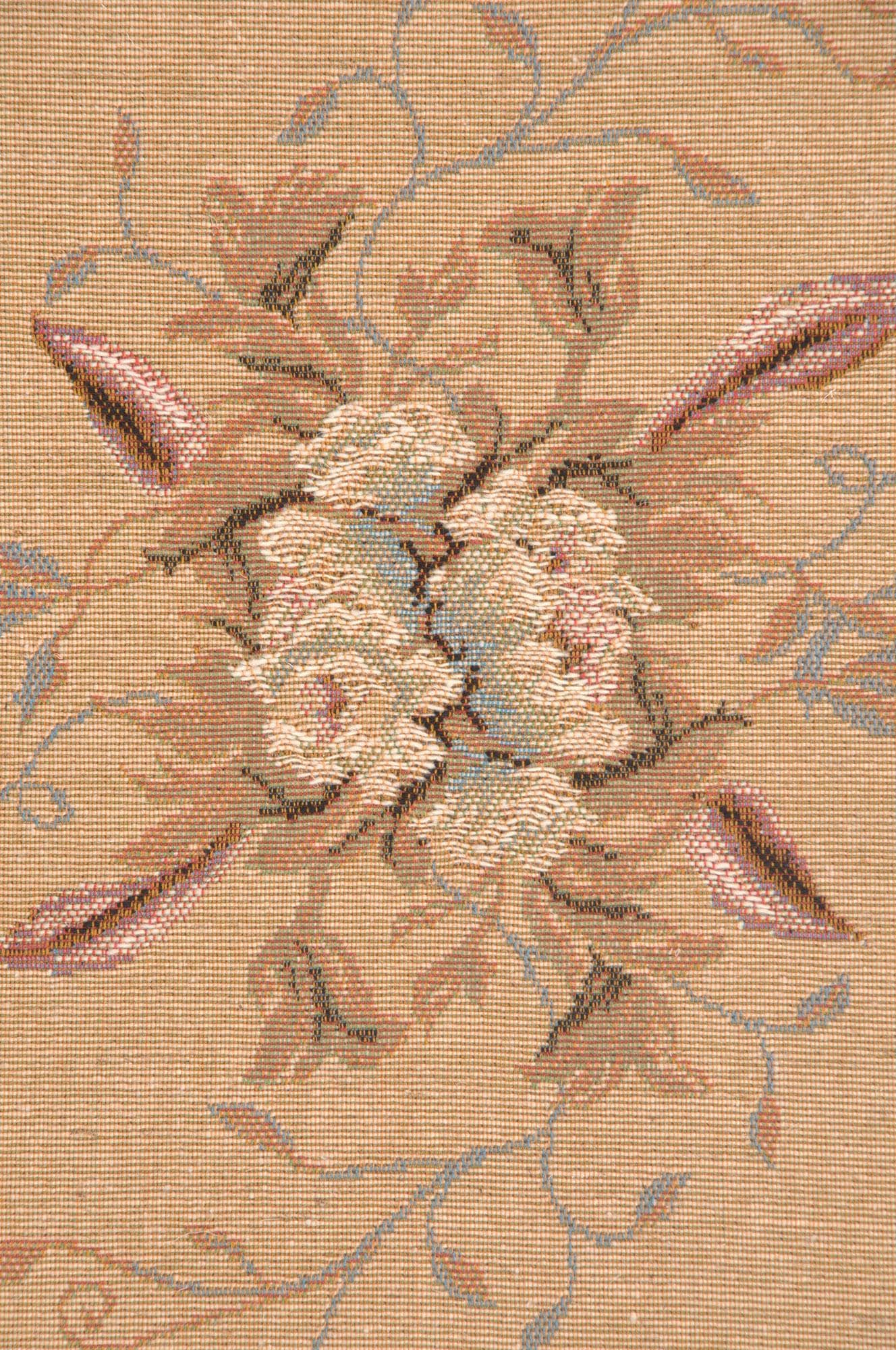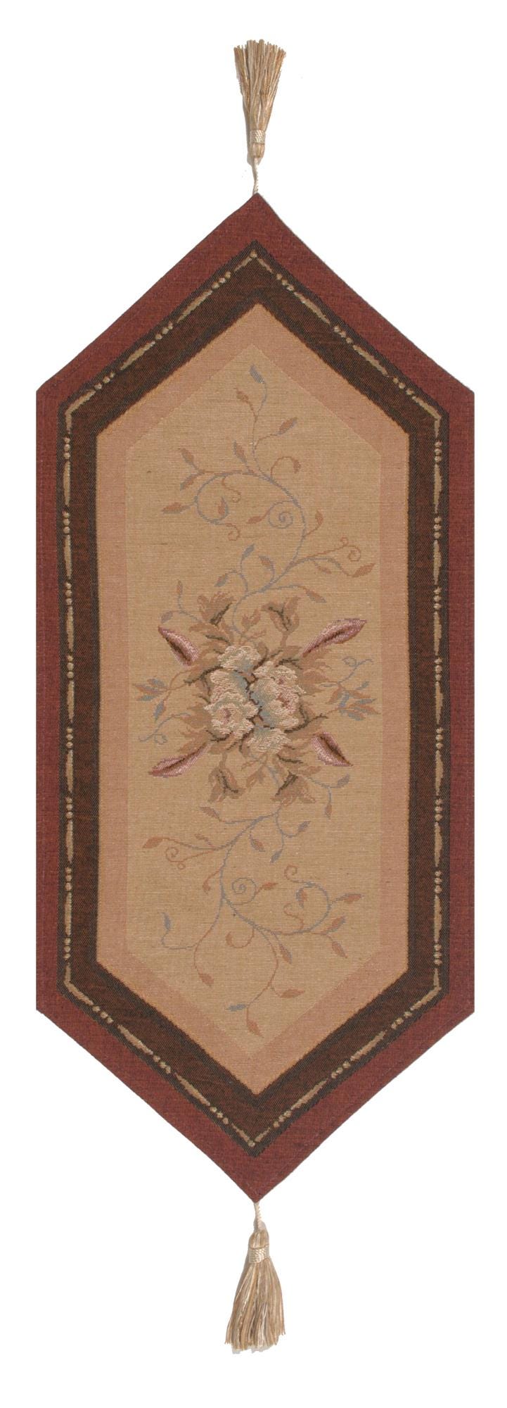 Orleans Floral : this table runner tapestry shows a dance between rose arabesques and small flowers, on a light background with a red border.