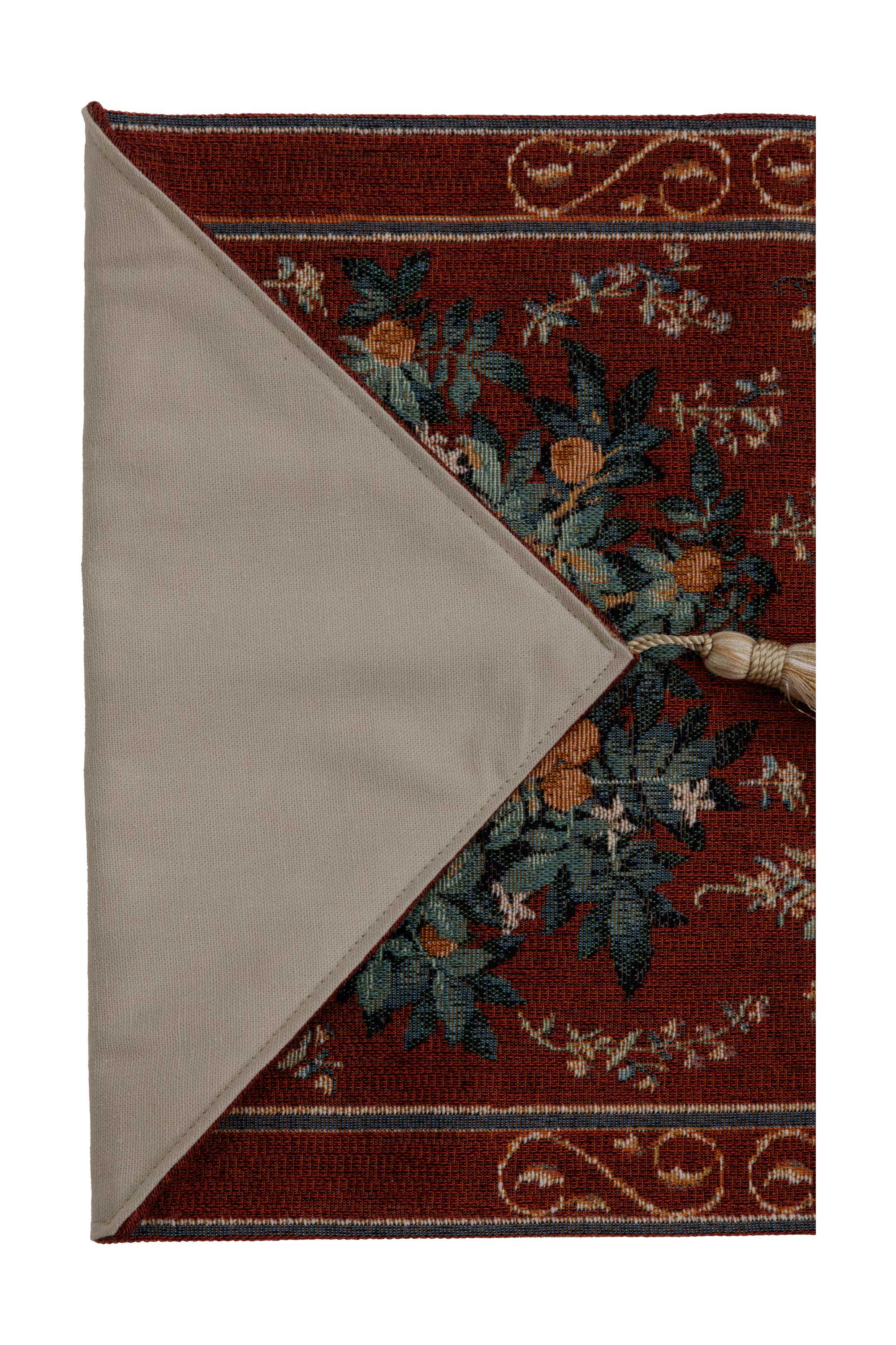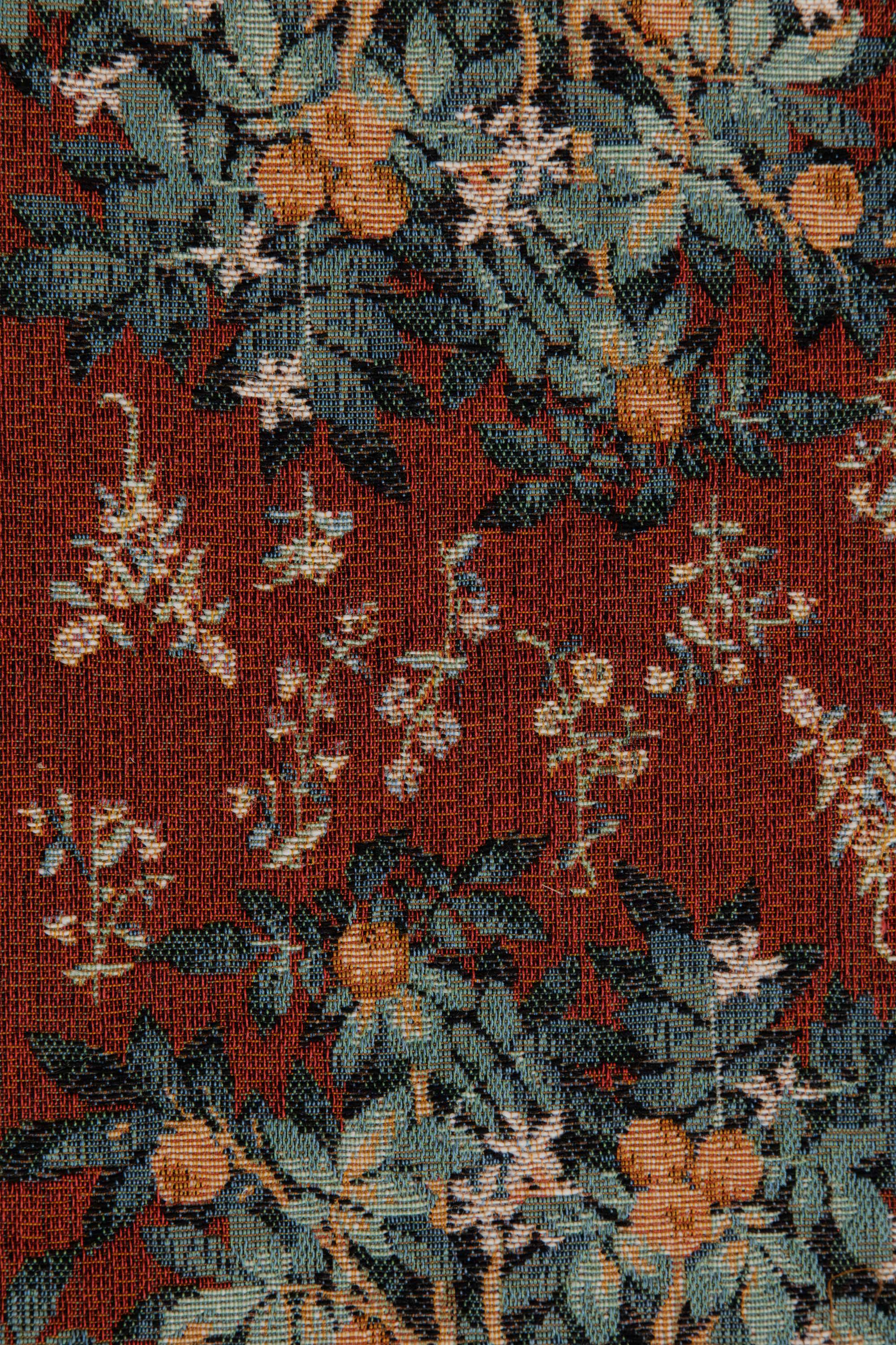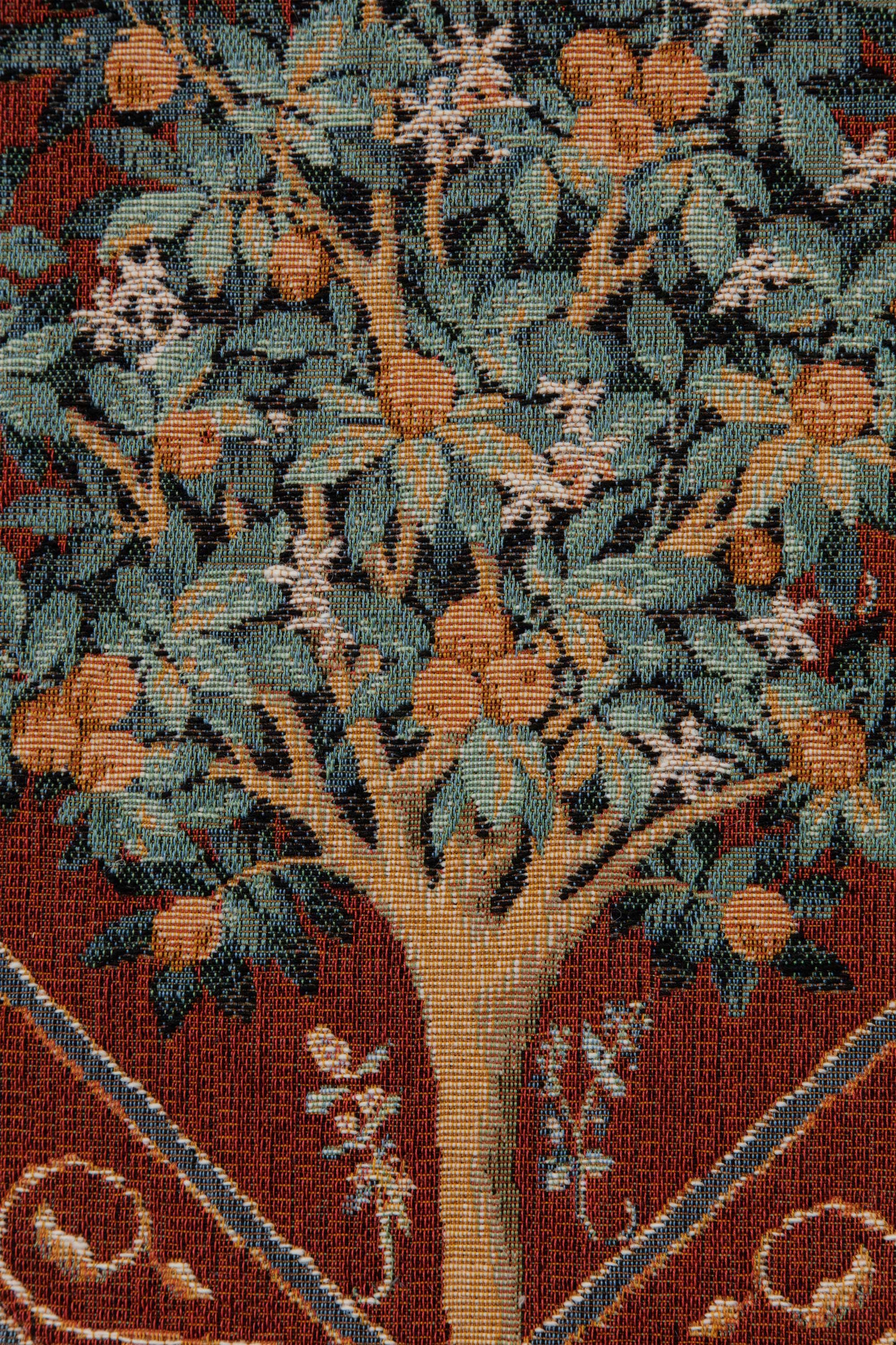 A stunning Jacquard tapestry runner table, Orange Tree II is a small extract from the famous 16th-century ""Lady and the Unicorn"" tapestries, housed in the Cluny Museum, Paris. Featuring a Mille-fleur style background, this historic-inspired piece adds a touch of medieval charm to your home.