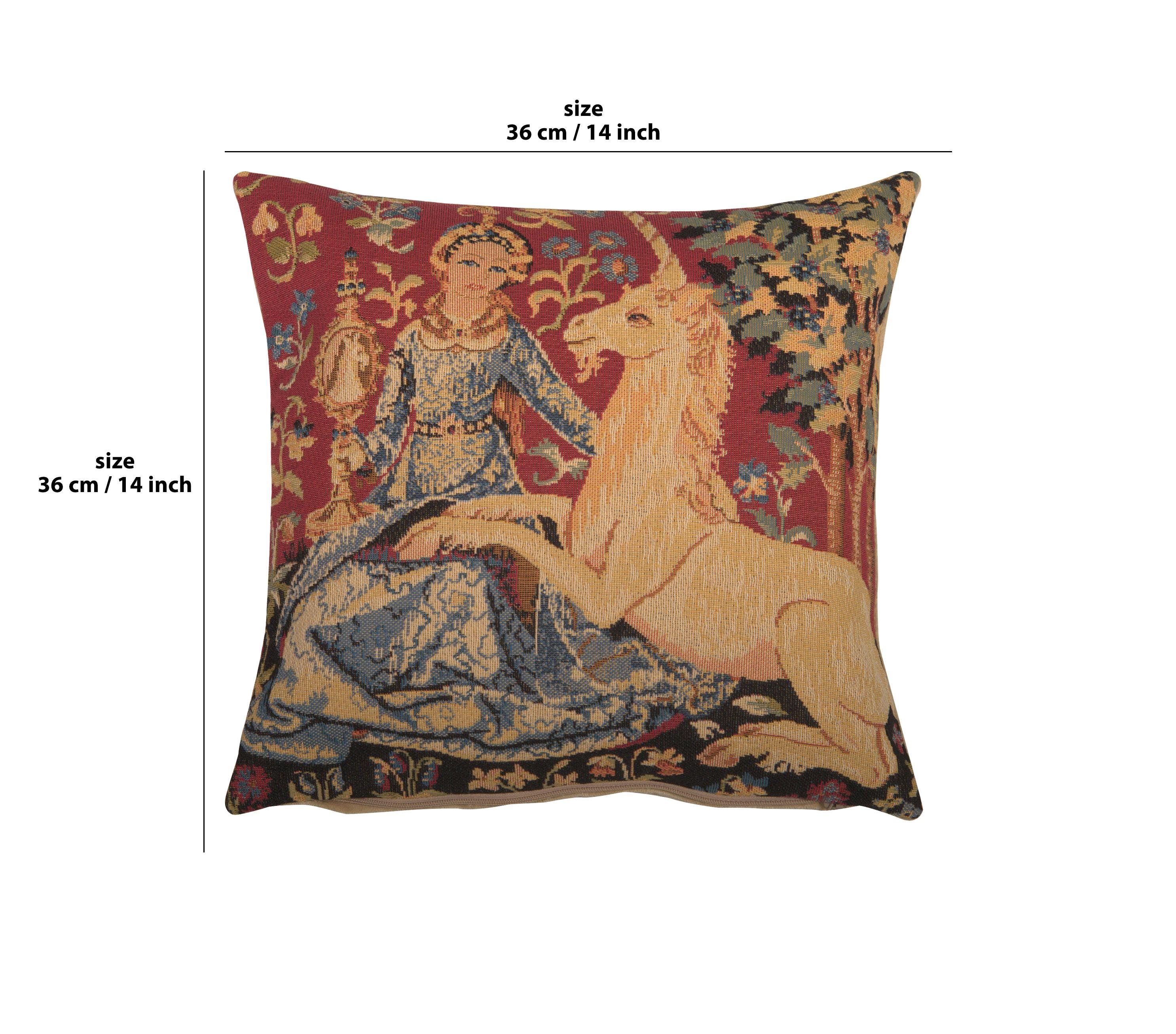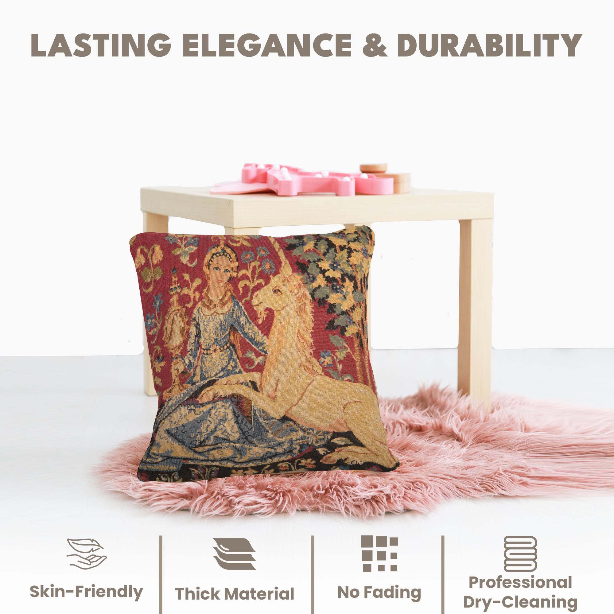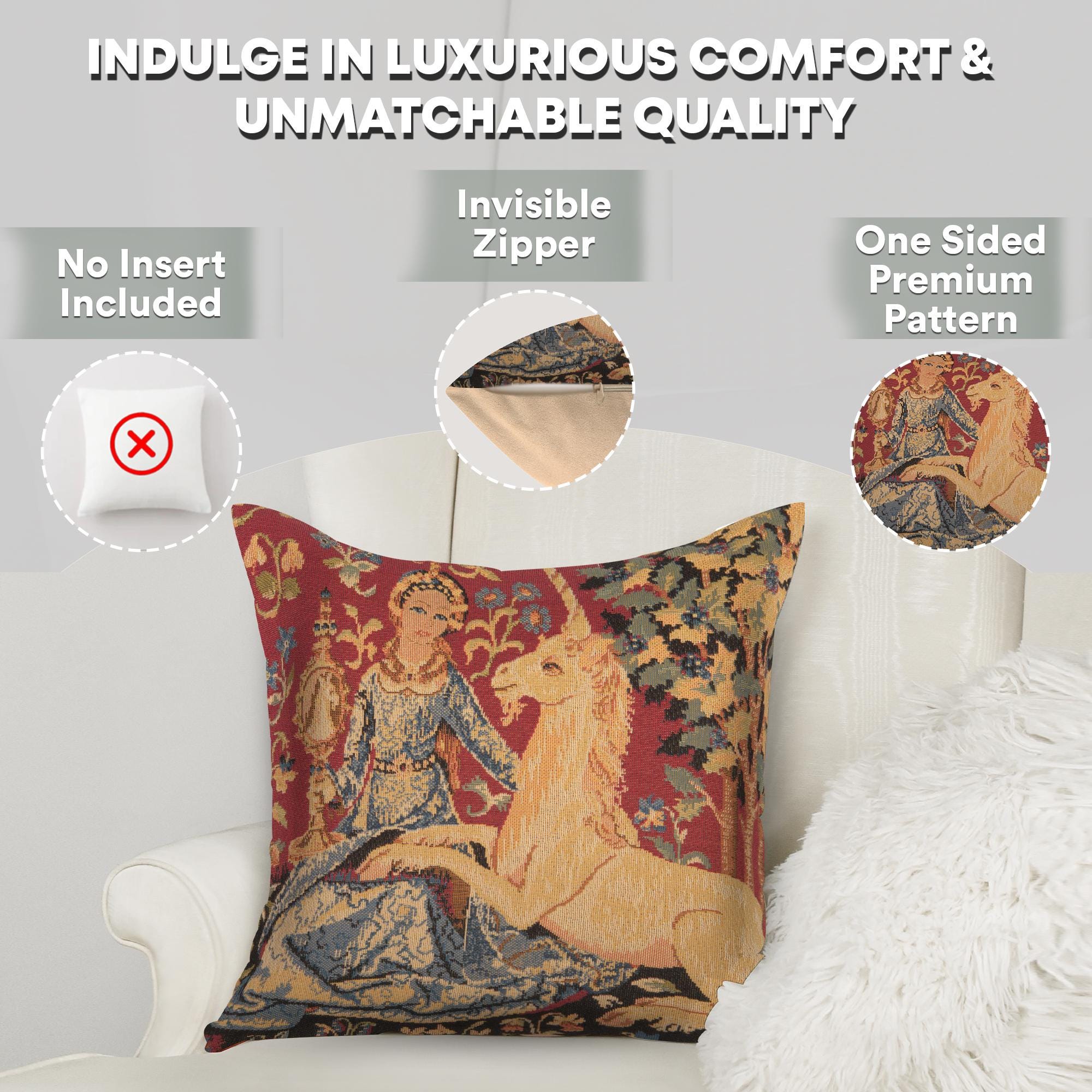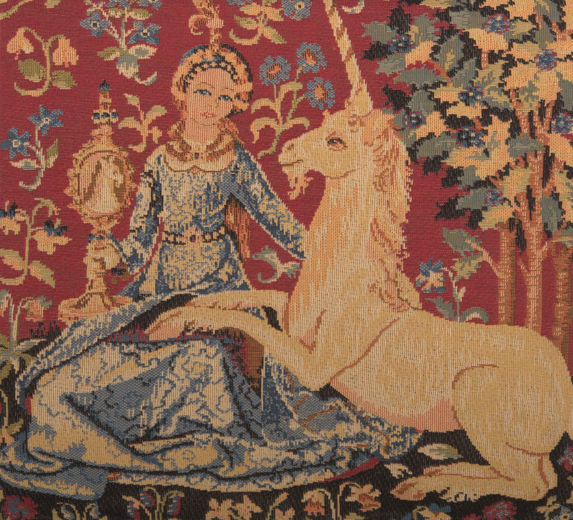 "Add timeless elegance to your home with this Lady and the Unicorn “Taste” cushion cover, inspired by the famous medieval tapestry series. This Belgian woven jacquard pillow cover features the symbolic scene of taste, with a noble lady and unicorn surrounded by rich floral details, bringing history and artistry into your decor.