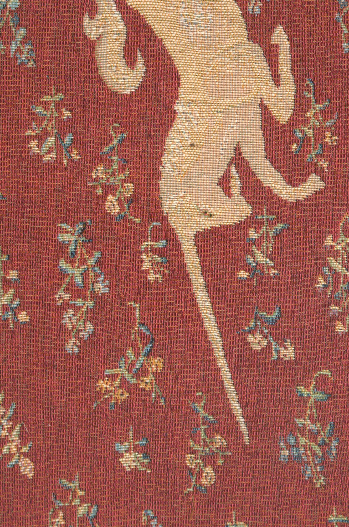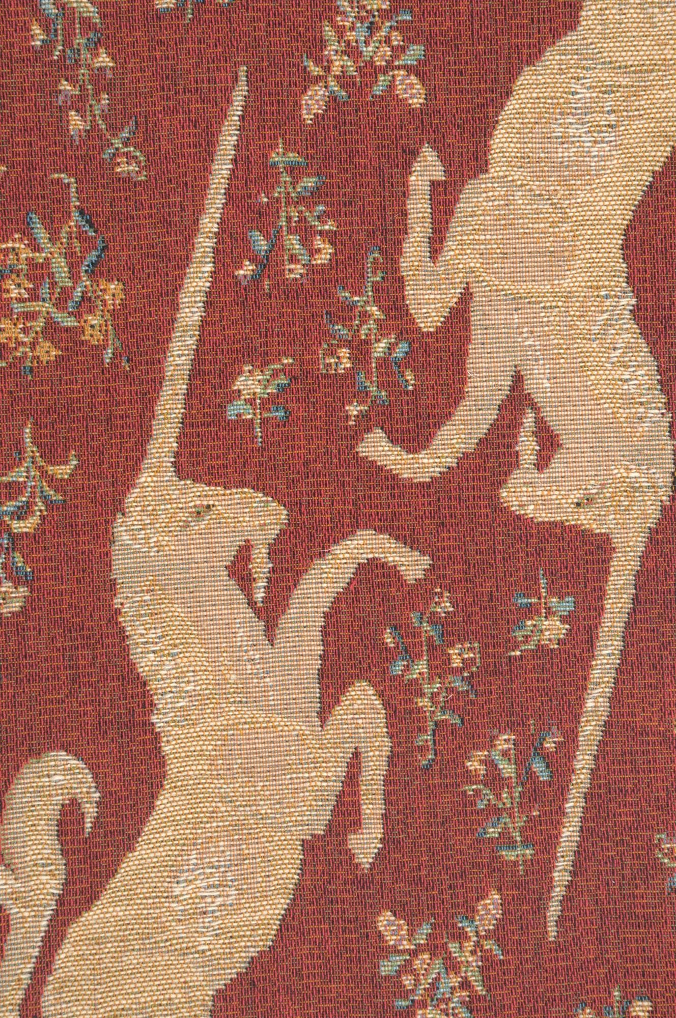 This European jacquard table runner tapestry, Licorne II, or Unicorns, is a small extract from the famous set of 6 medieval tapestries Lady and the Unicorn. Woven in about 1511 and now housed in the Cluny Museum, Paris. The background is done in the Mille-fleur style.