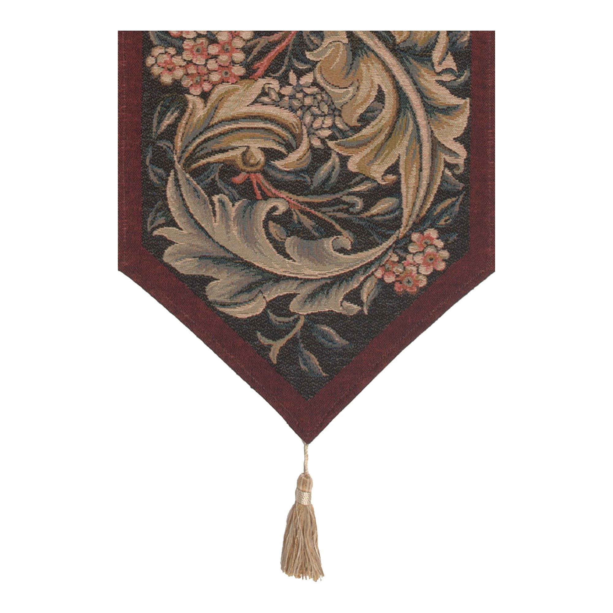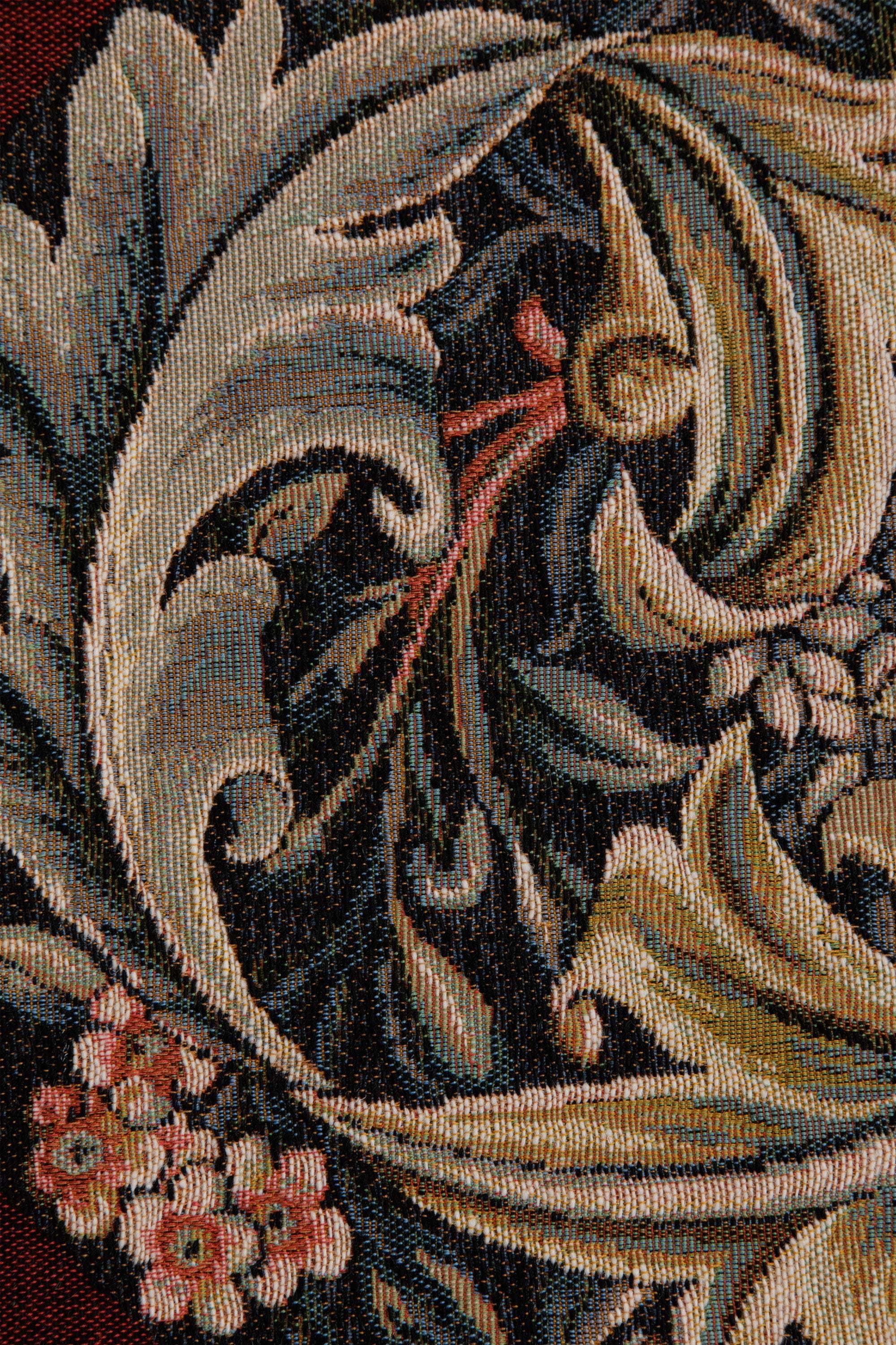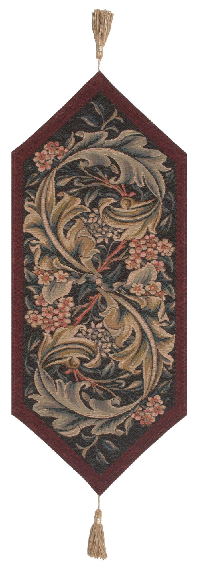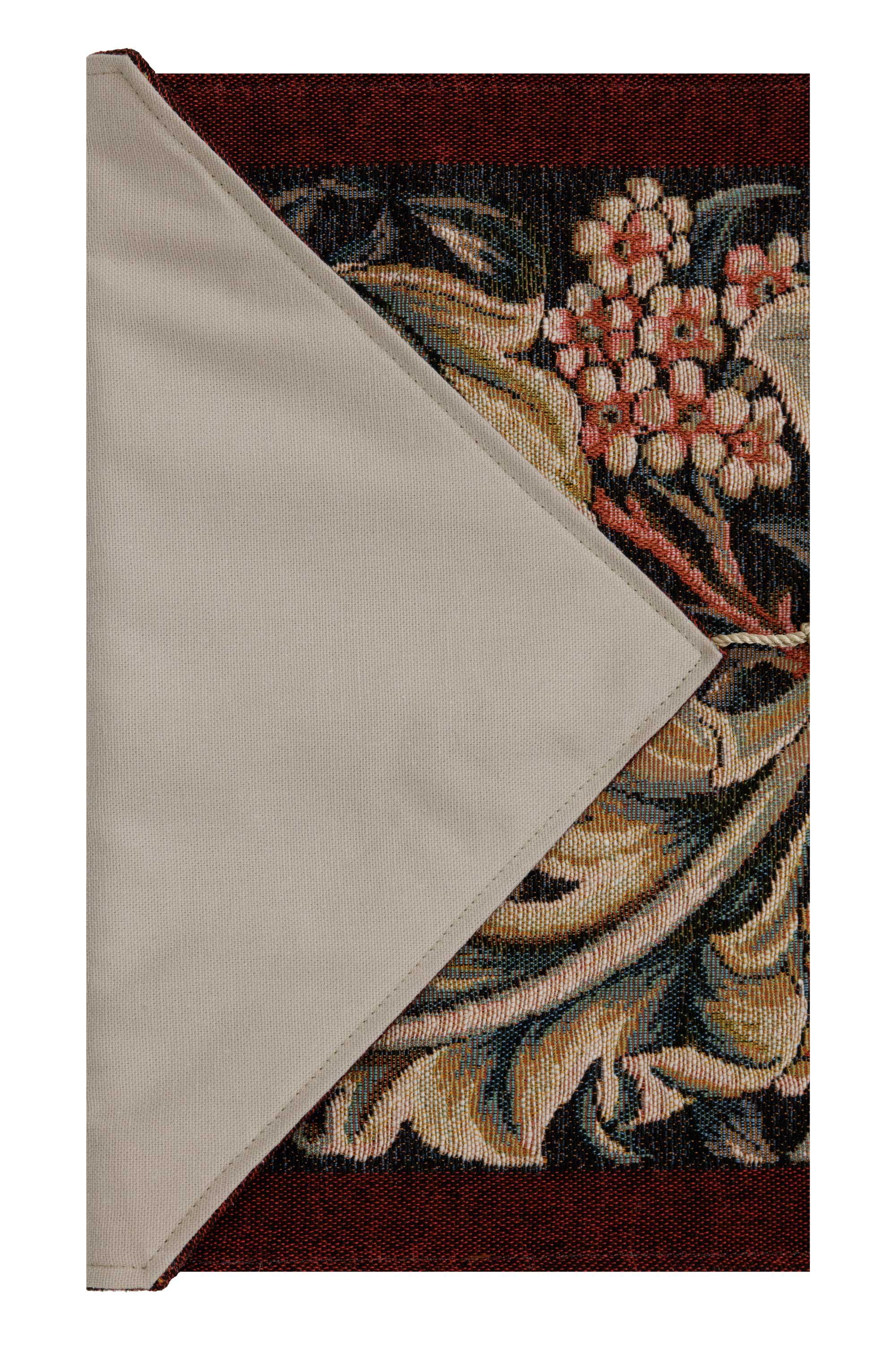 This jacquard table runner tapestry William Morris Red is woven on a red background. It is inspired from a William Morris embroidered panel done in 1898. This work portrays large acanthus leaves on a floral background.