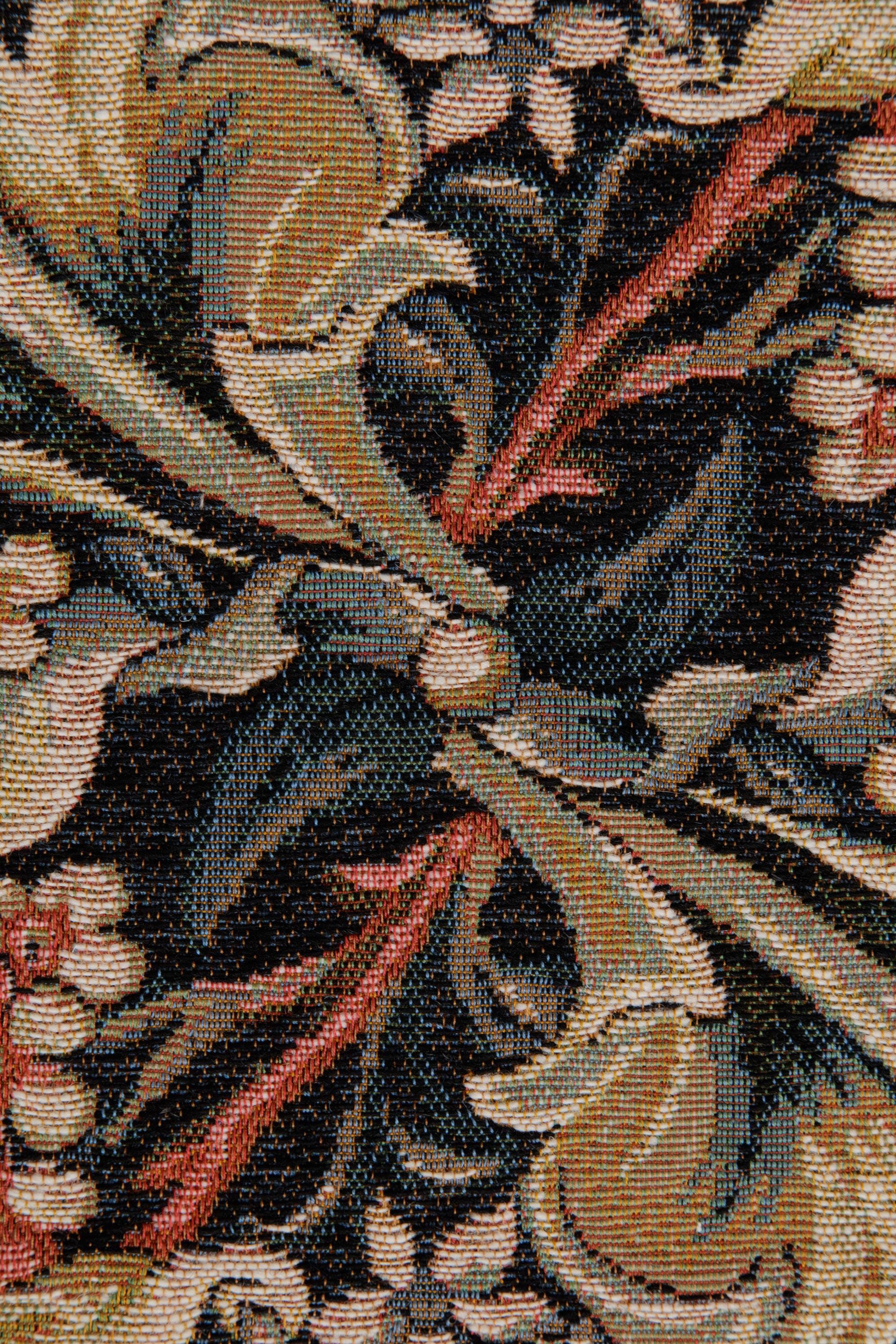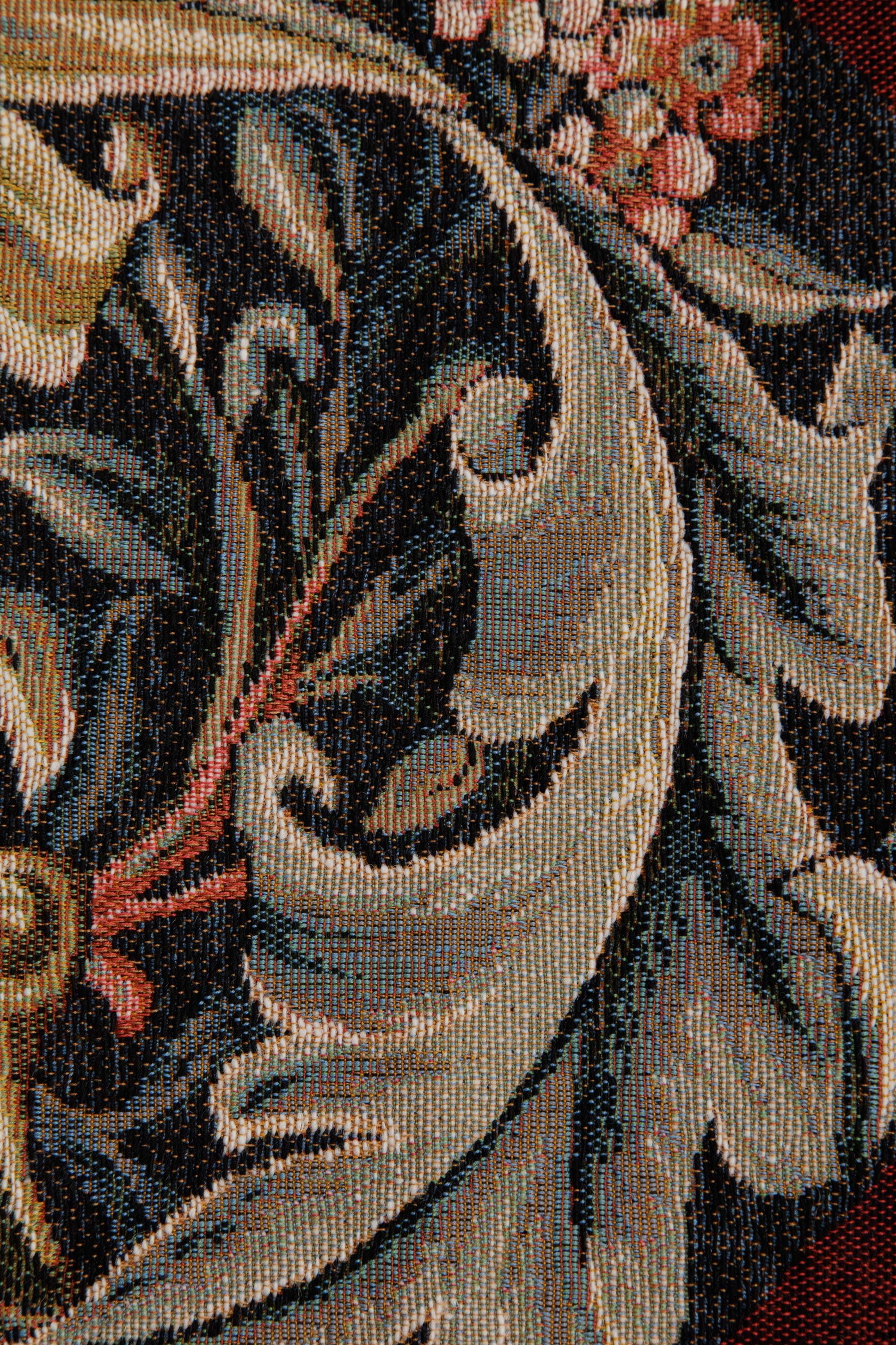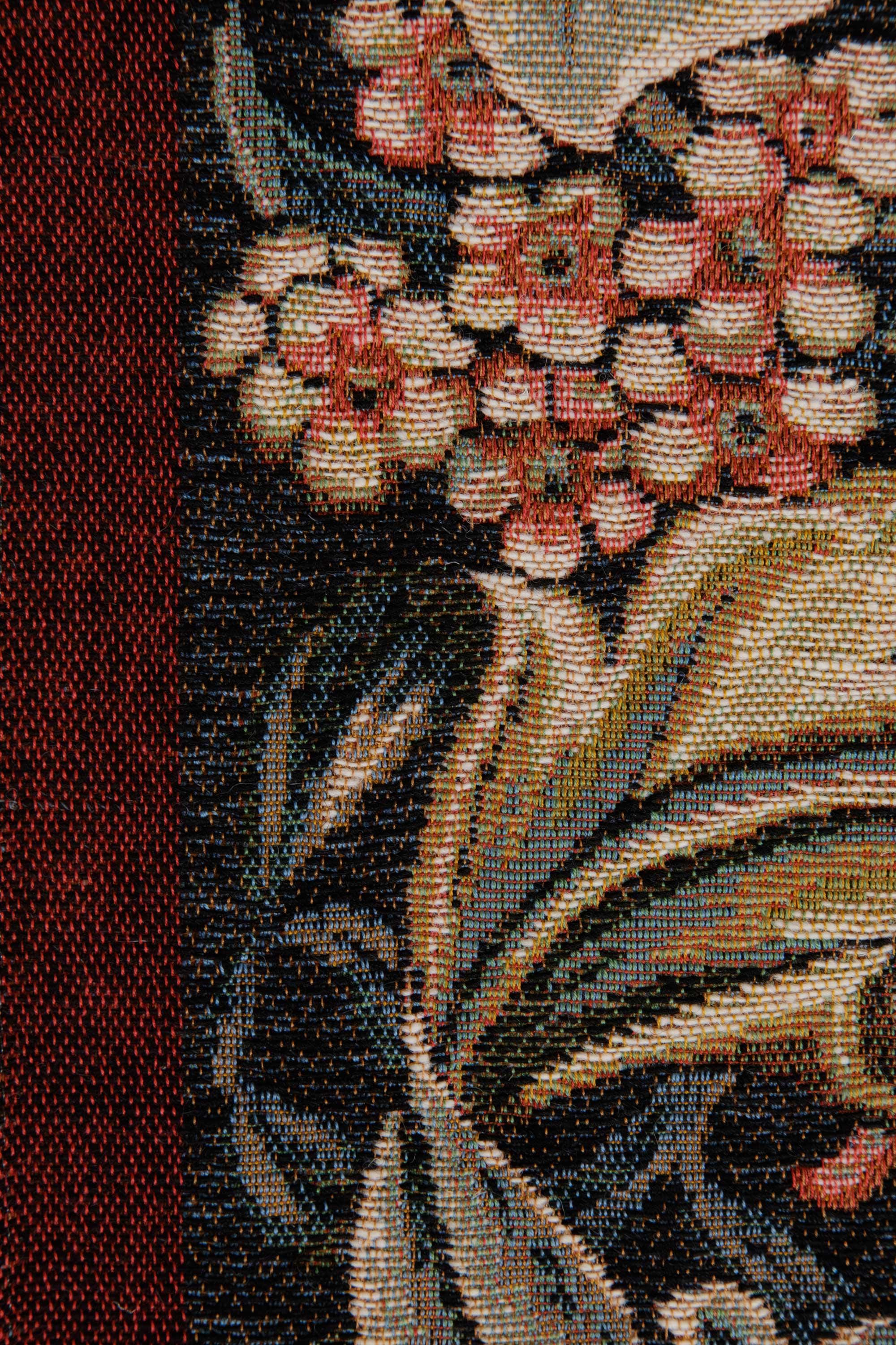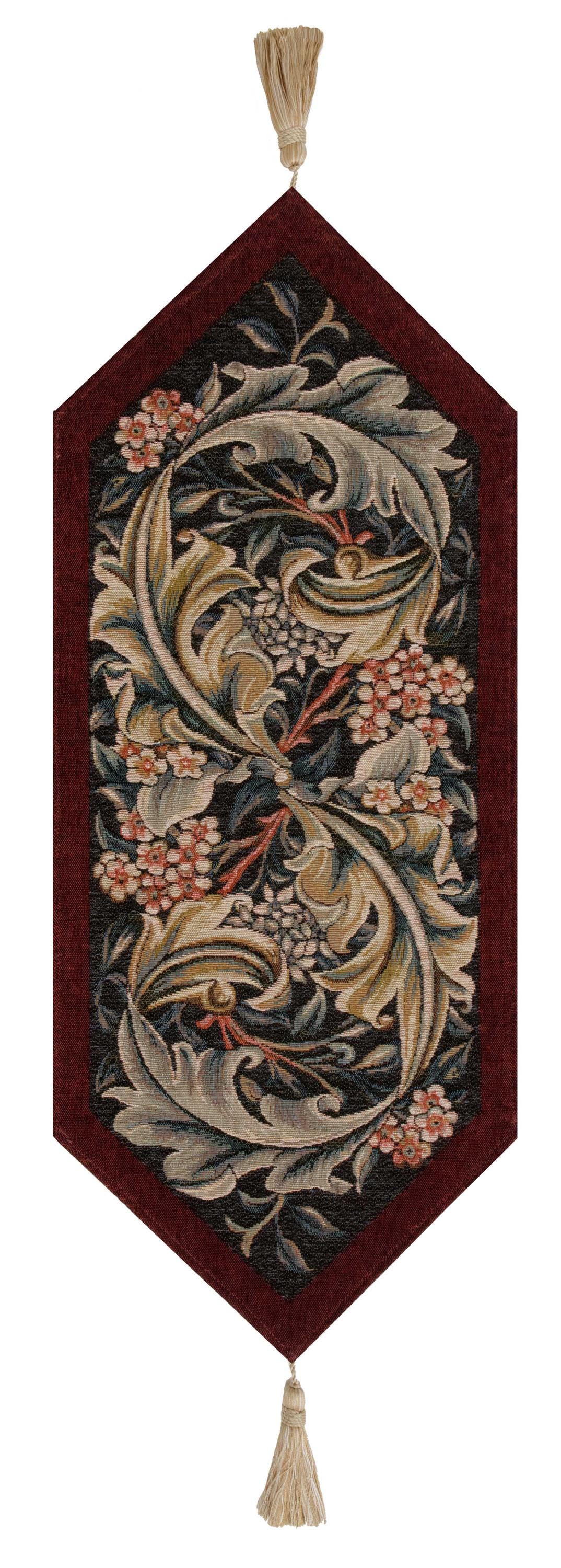 This jacquard table runner tapestry William Morris Red is woven on a red background. It is inspired from a William Morris embroidered panel done in 1898. This work portrays large acanthus leaves on a floral background.