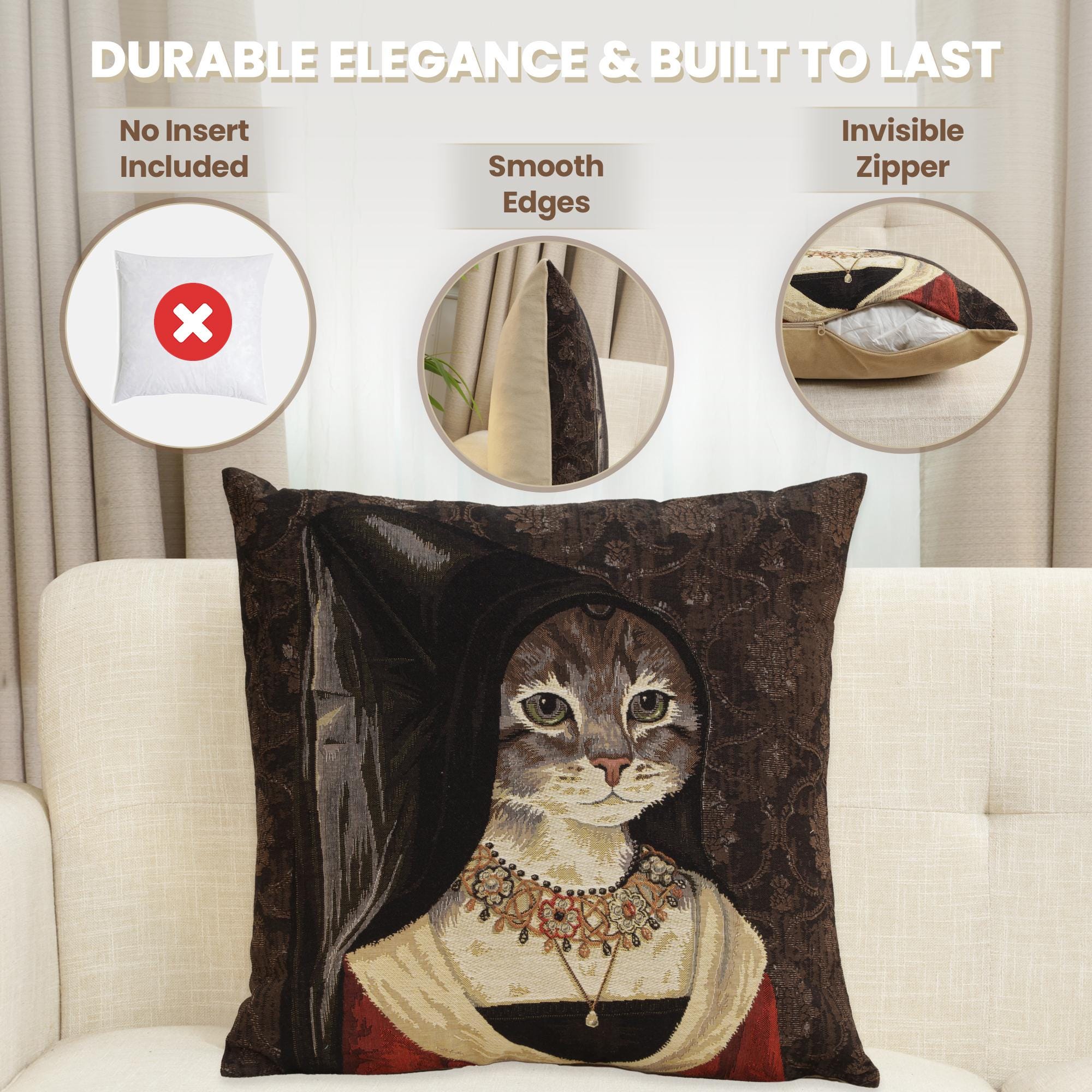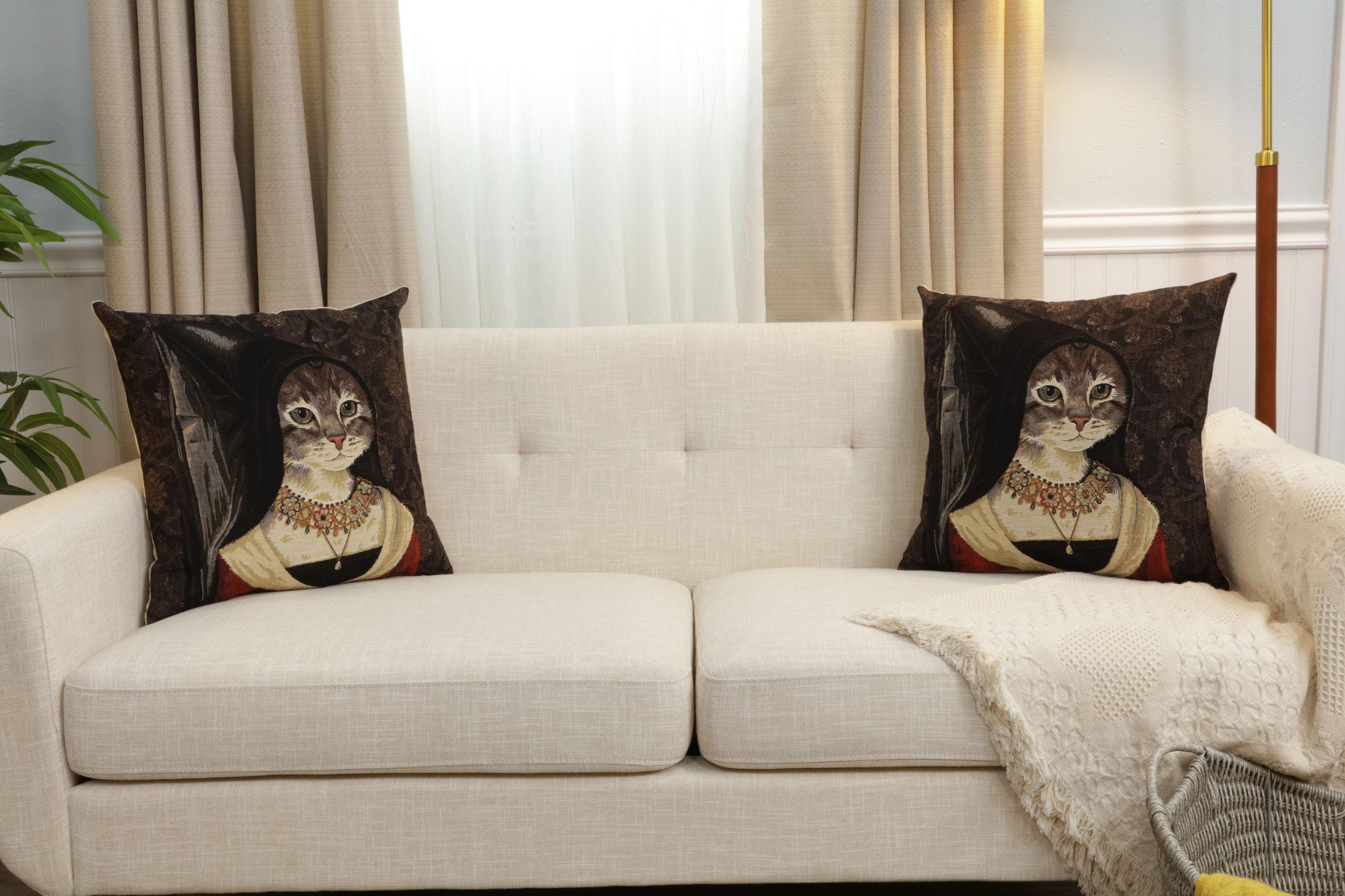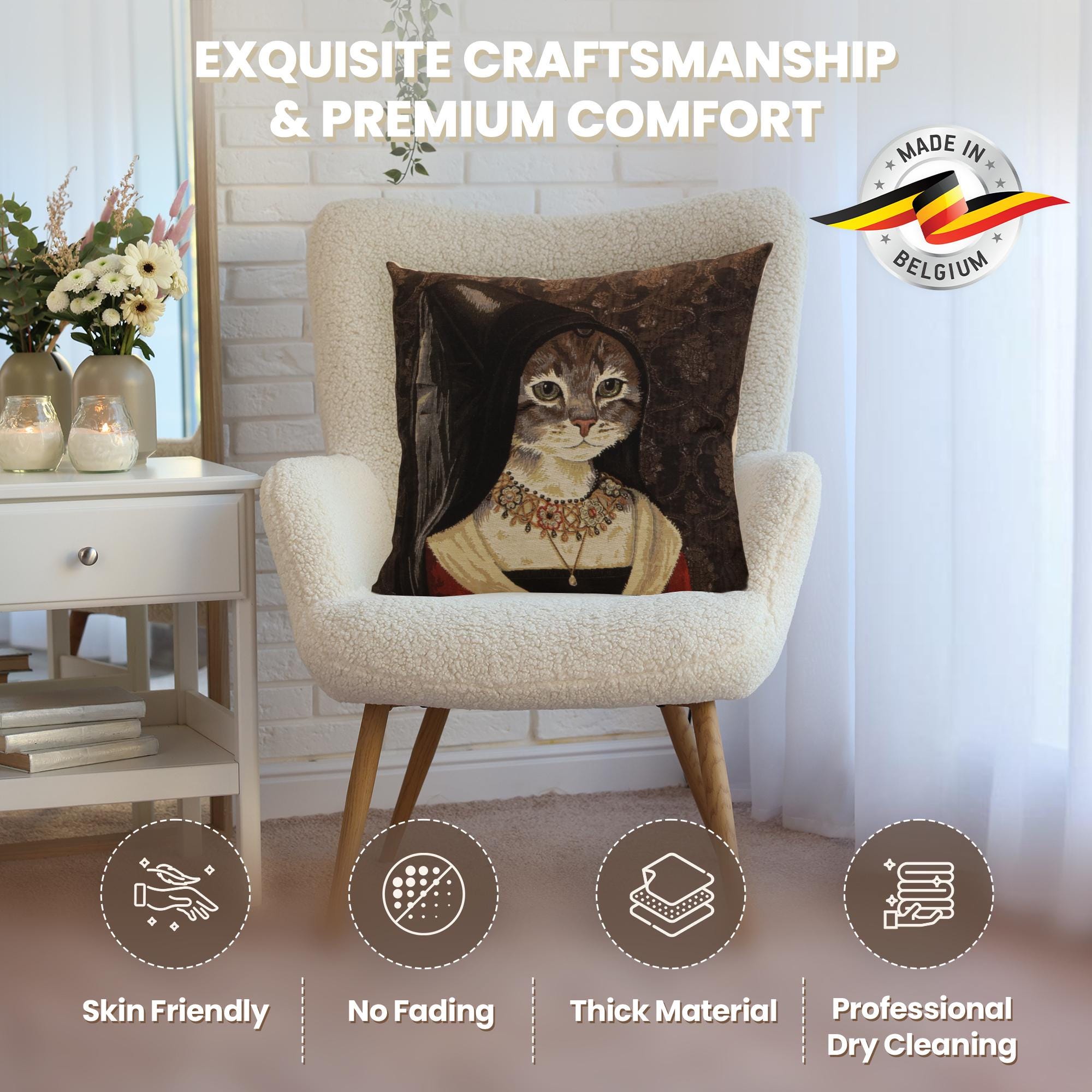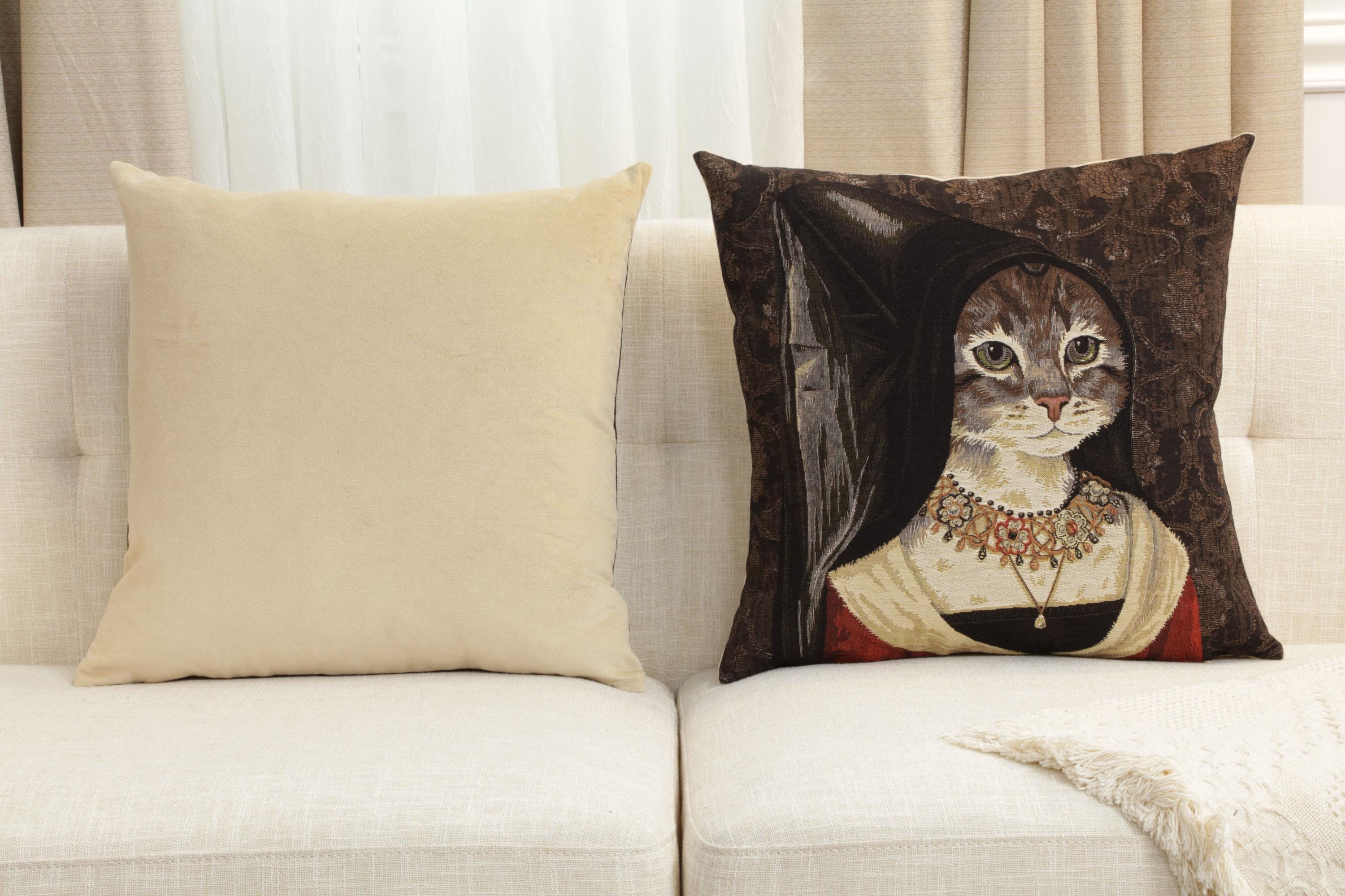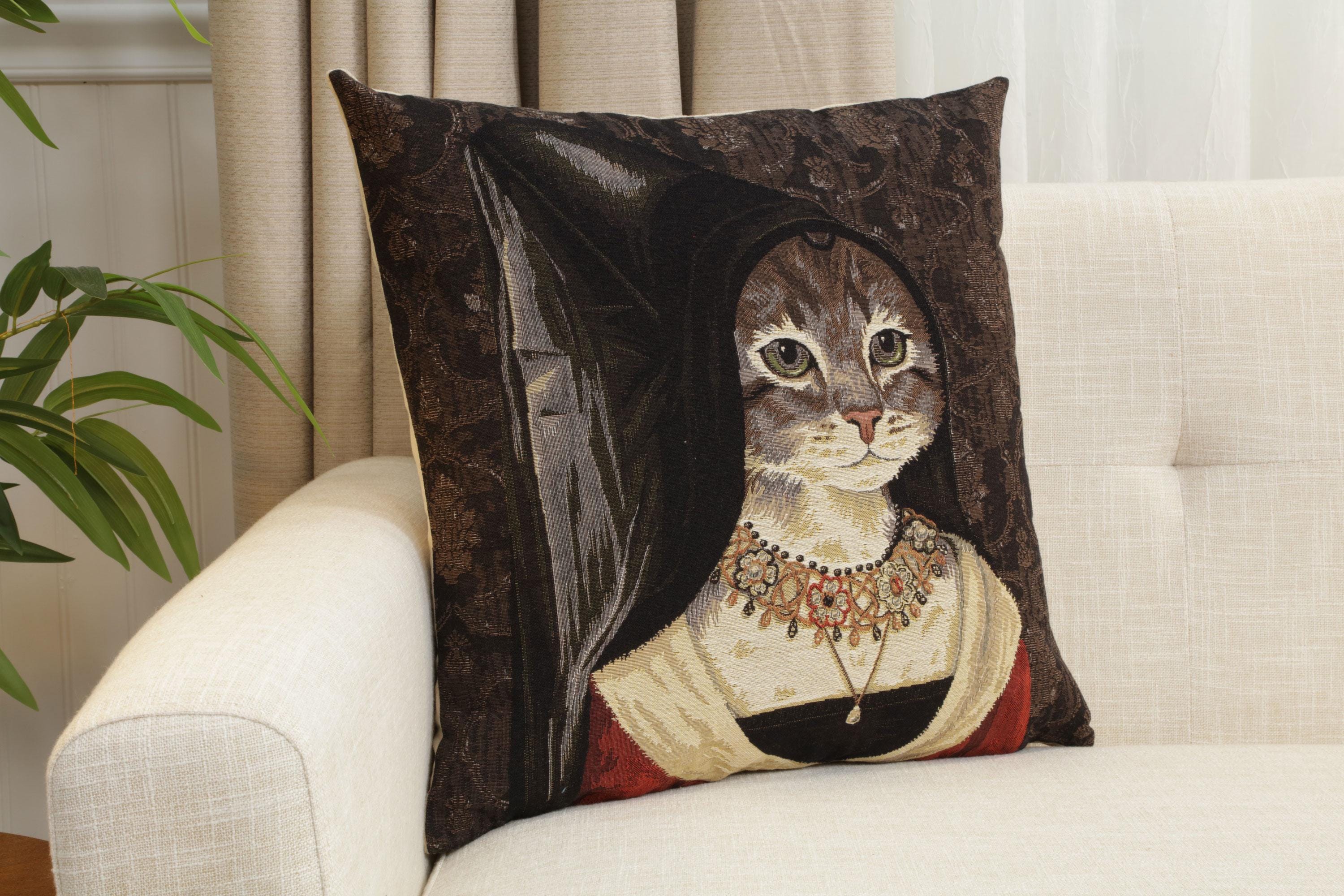 This beautifully woven Belgian cushion cover features a charming illustration of a "Cat With Hat". Measuring 18x18 inches, it's the perfect size for your sofa, chair or bed, adding a touch of whimsy and charm to any room. Crafted in Belgium, the rich texture and high-quality materials used ensure its long-lasting nature. This one-of-a-kind cushion cover is not just a piece of home decor, but a piece of art! Whether you're looking to jazz up your own living space or searching for the ideal gift for a cat lover, this captivating cushion cover is a perfect choice. The neutral tones will complement any decor style, and the unique cat design will attract many admiring glances. This versatile cushion cover is excellent for year-round use and can also be a delightful addition to your Christmas decor. Remember, it's not just a pillow. It's a statement!