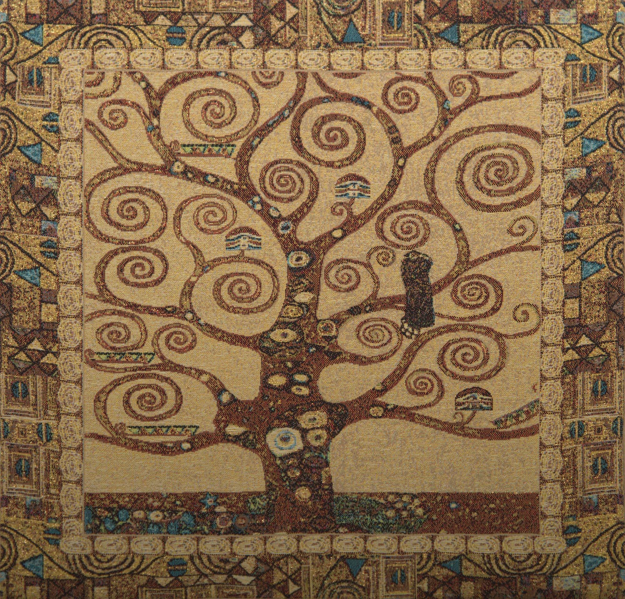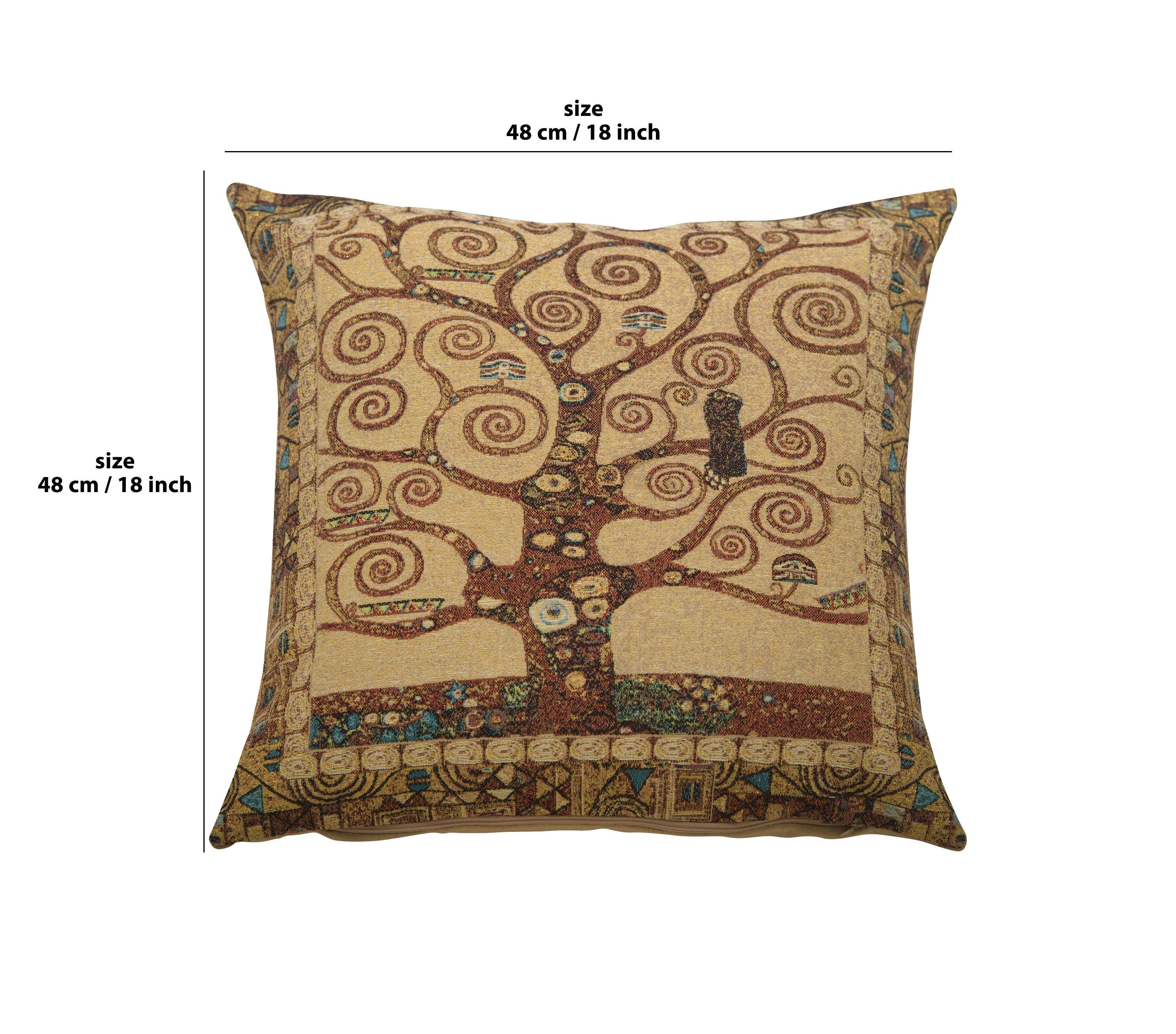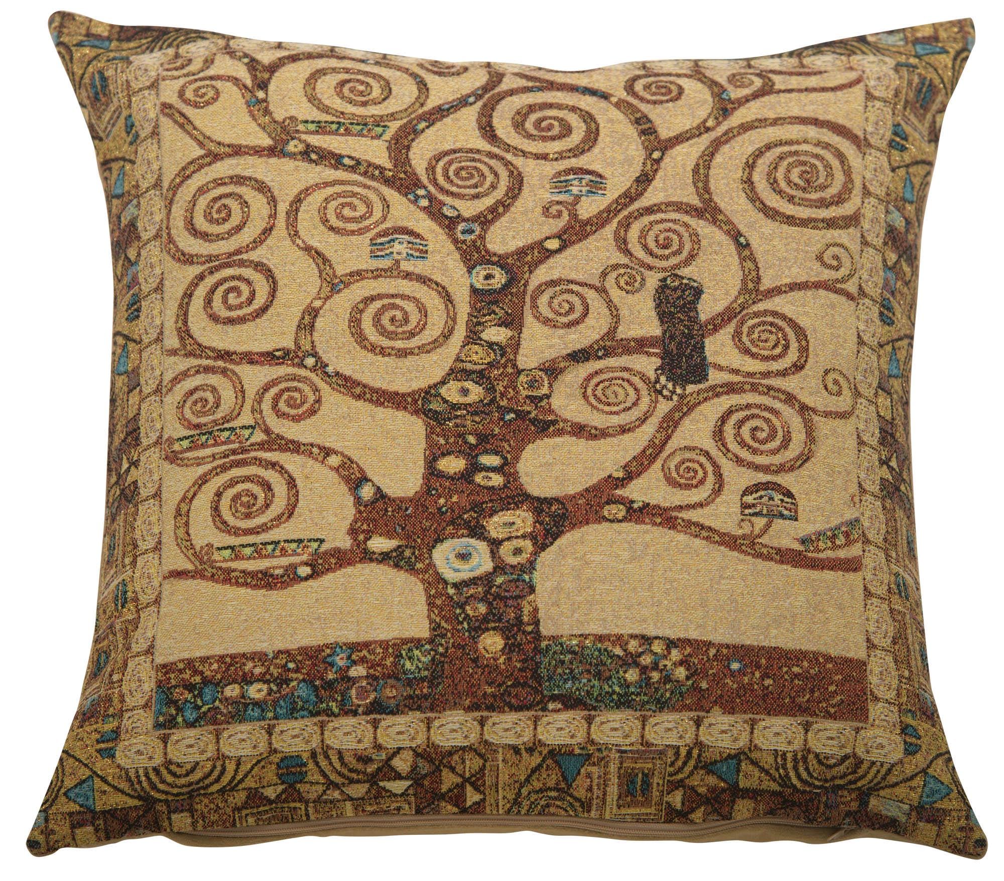 High quality Belgian-made woven pillow case with velvet backing inspired by Gustav Klimtโs Tree of Life