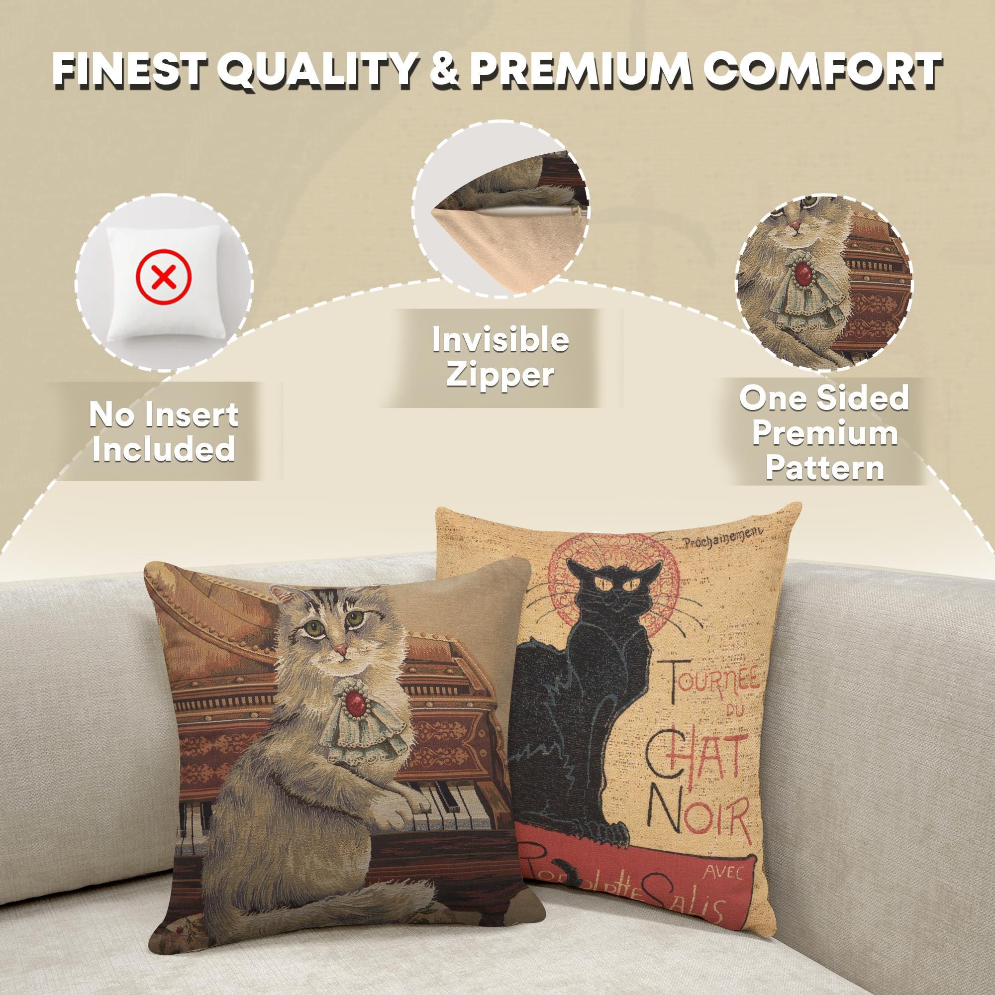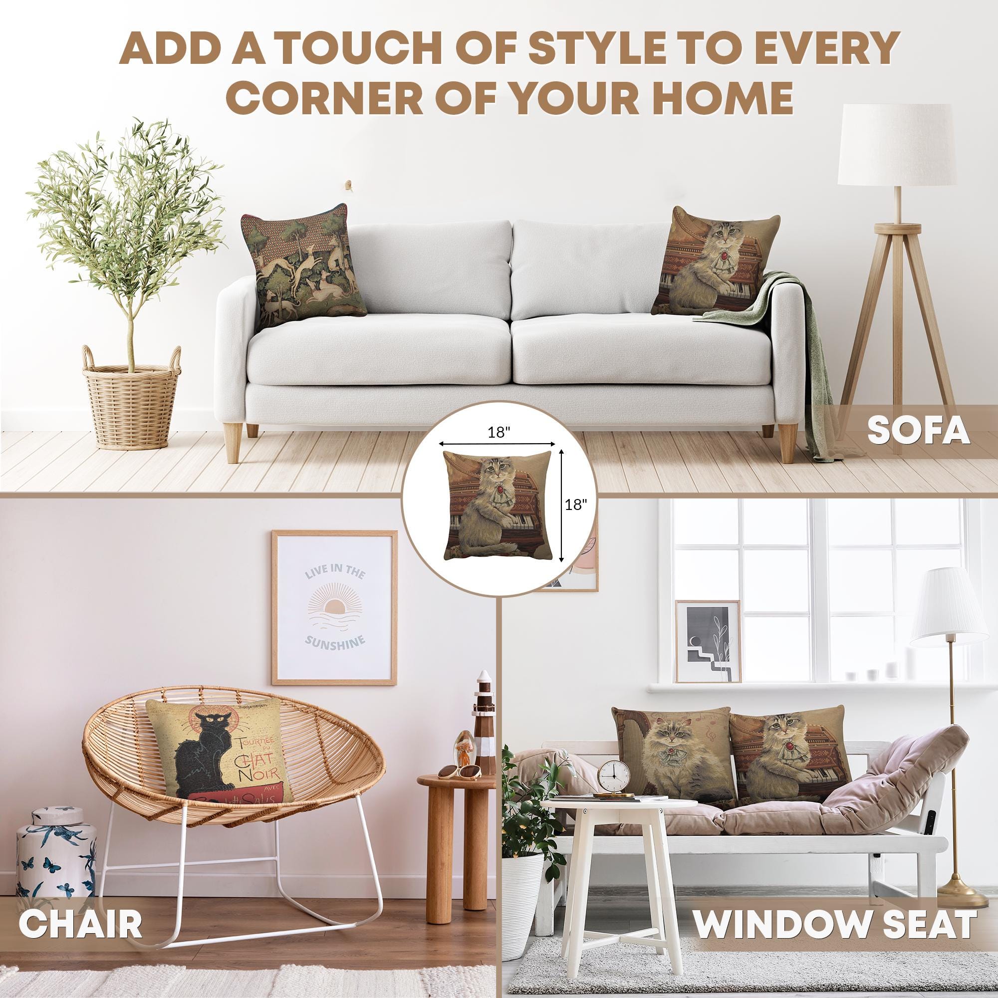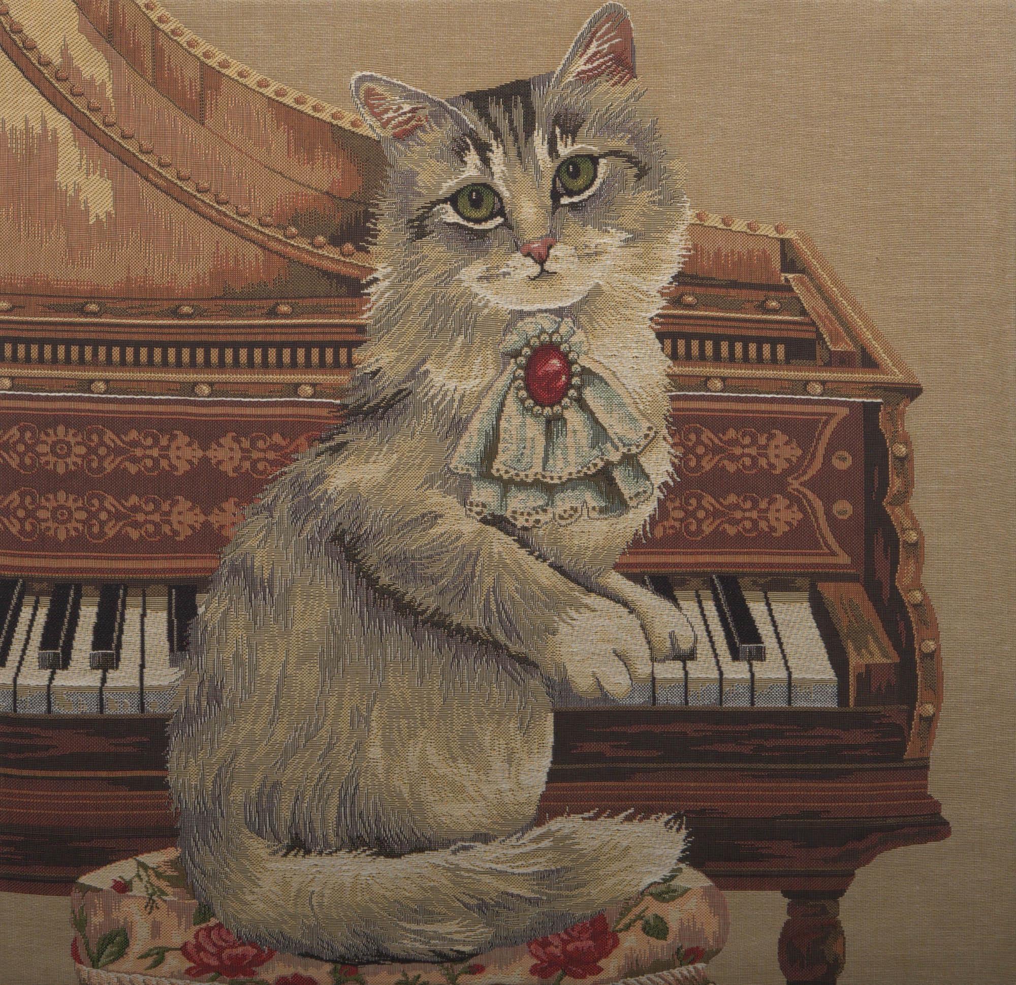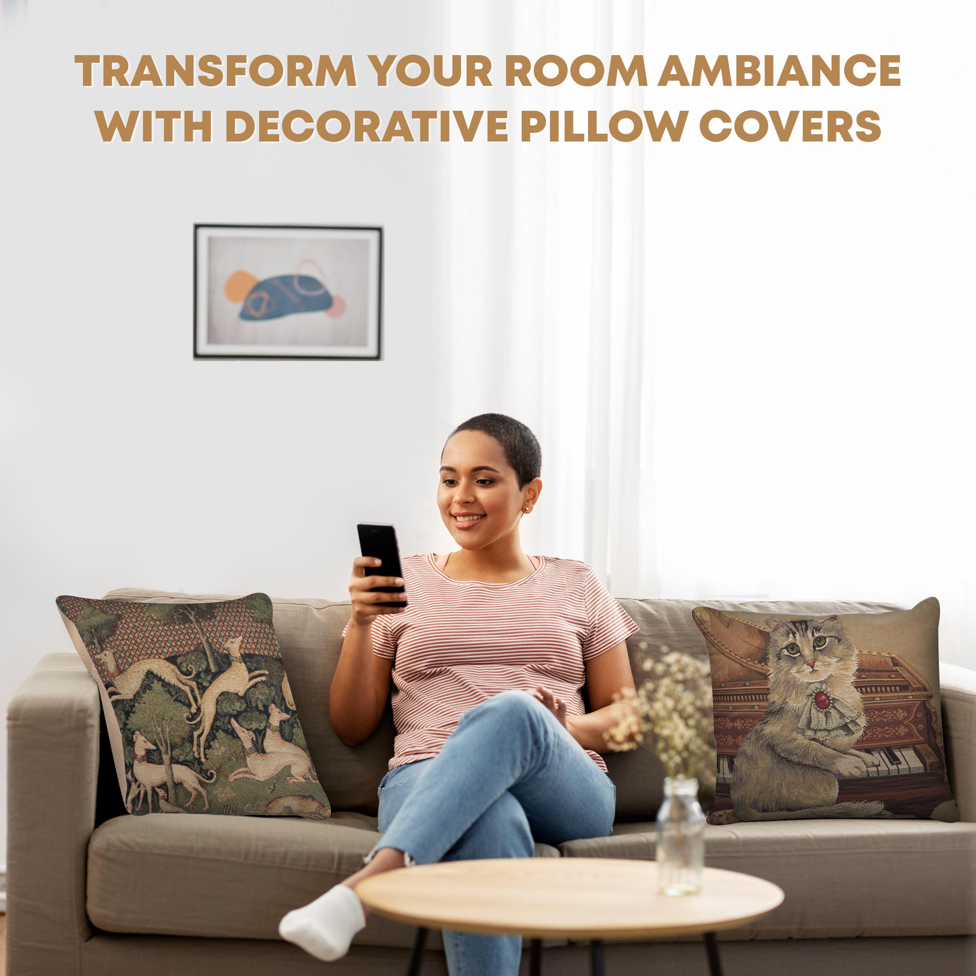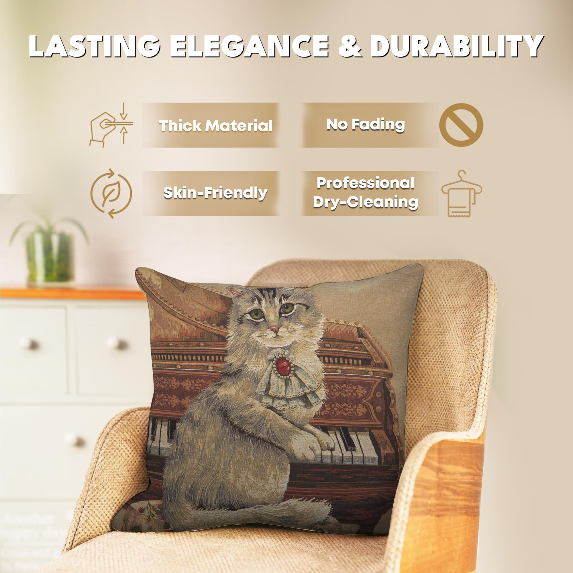Purrfection for your decor. Transform your home with the Musical Cat decorative pillow covers, a delightful blend of style and whimsy. This woven pillow cover features playful feline motifs, making it a thoughtful gift for cat enthusiasts. Square pillow covers durable Belgian craftsmanship ensures lasting beauty, whether placed on a sofa, rocking chair.