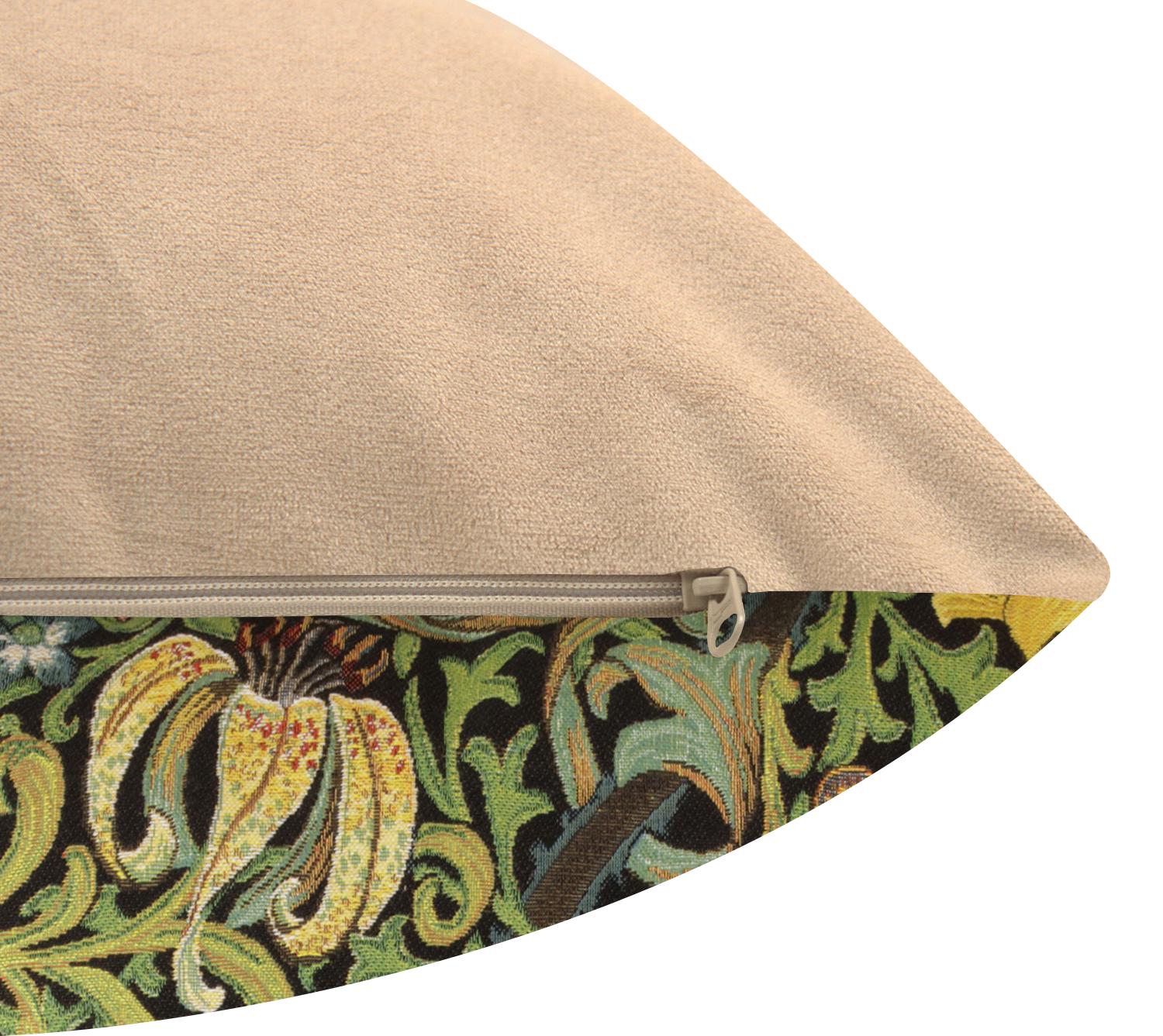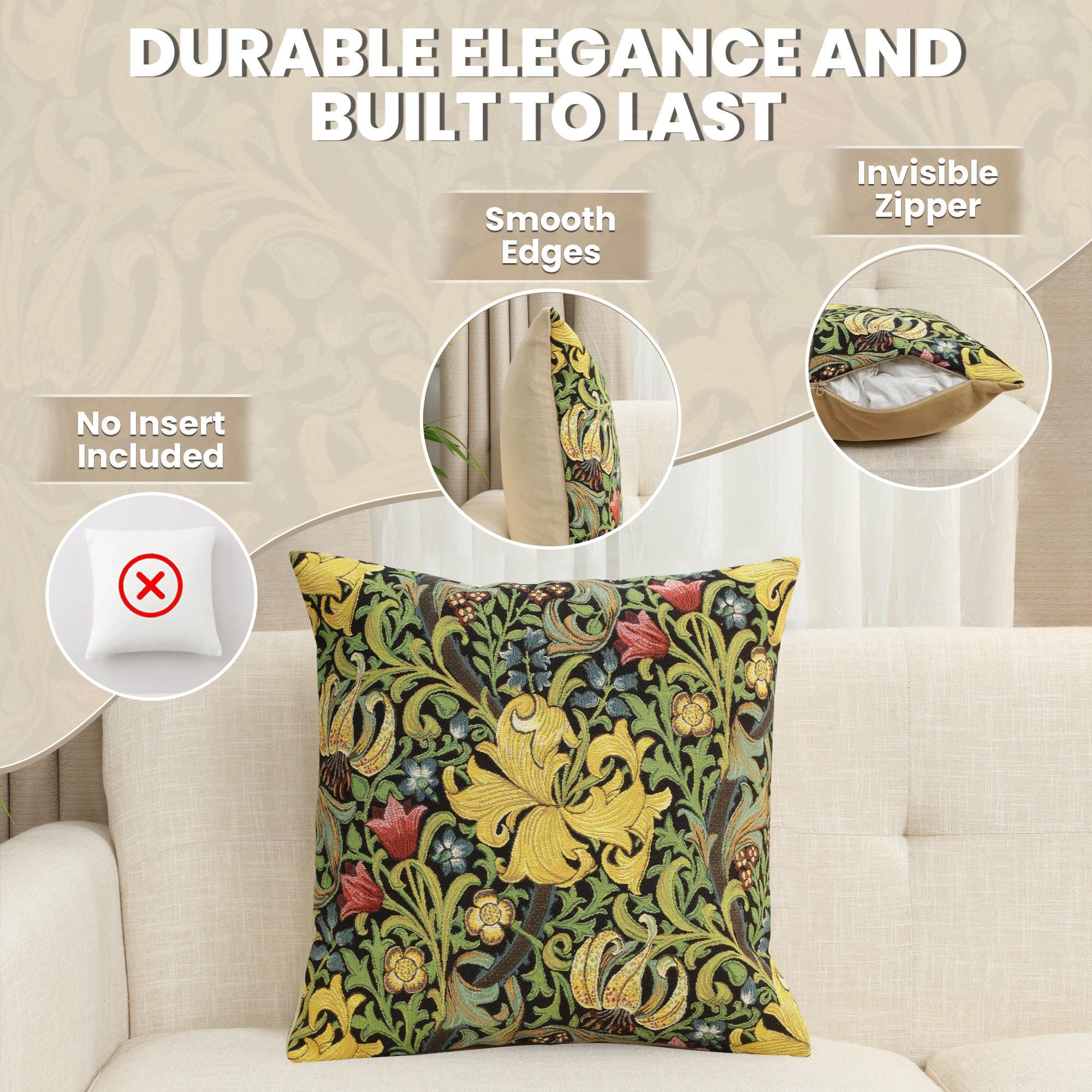 The woven William Morris design is gorgeous and well craft. There is one drawback. The zipper does is about 12.5 inches on the 18 inch pillow cover. Carefully stuffing the pillow insert into the cover caused steam at the end of the zipper to open up and needed mending. A better design would have the zipper run the complete 18 inches go thehcover.