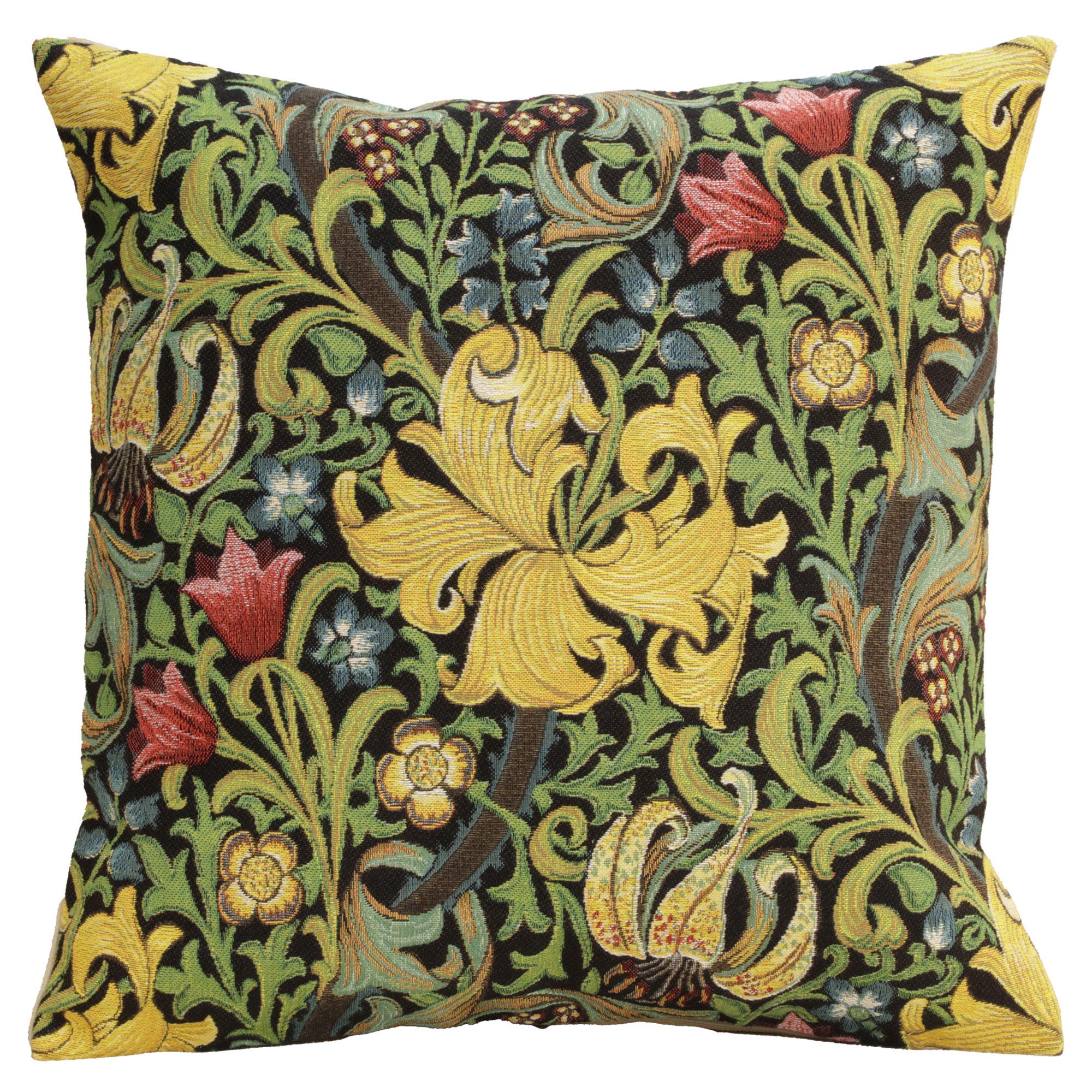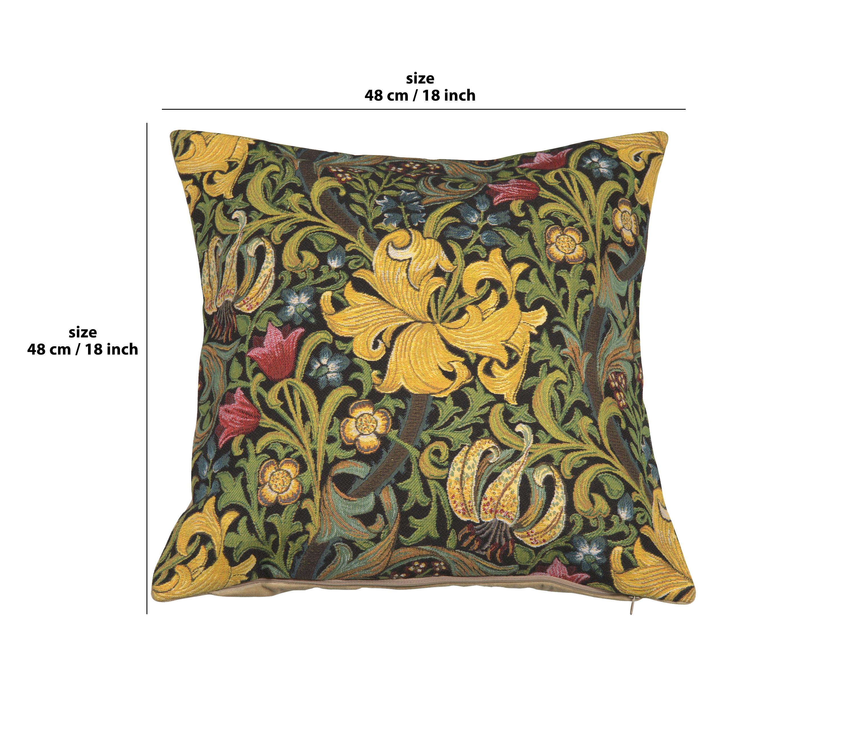 Elevate your home décor with this beautifully crafted Golden Lily Black William Morris Belgian Cushion Cover. Measuring a perfect 18x18 inches, it is an ideal addition to any couch, chair or bed. Brought to life by the legendary artist William Morris, the intricate design reflects the iconic, elegant style of the Arts and Crafts Movement. The key beauty of this piece lies in its high-quality Belgian weave, ensuring its durability and resilience. The combination of gold and black hues adds a timeless, sophisticated touch that can complement any home interior. A wonderful gift for grandma or any art enthusiast, this cushion cover is more than a regular throw pillow - it's a splendid piece of art. Spice up your home with this stunning decorative pillow, offering not just comfort but an aesthetic you would appreciate.