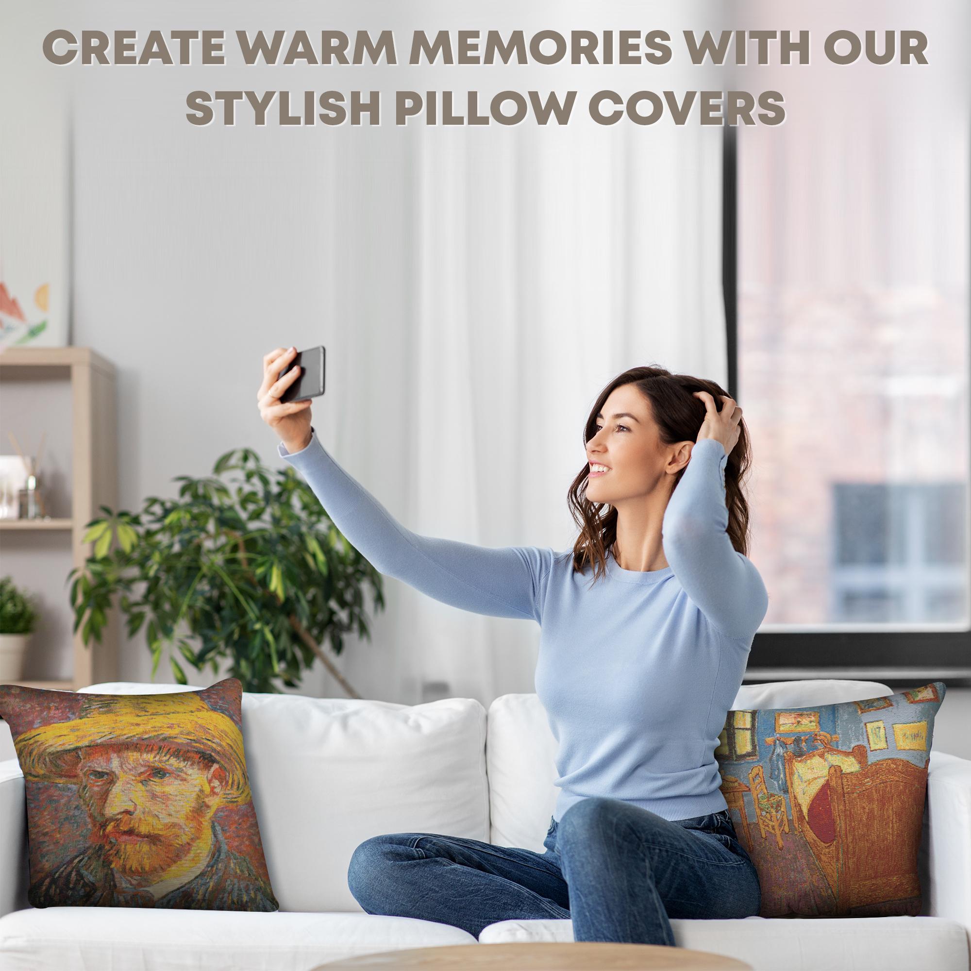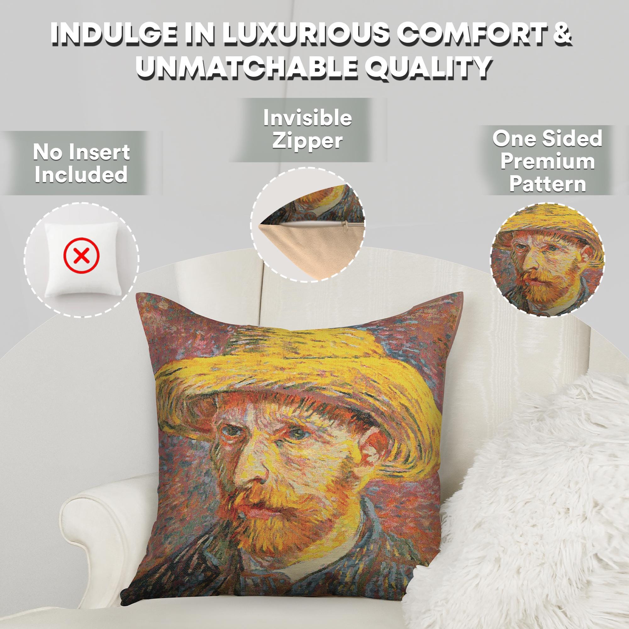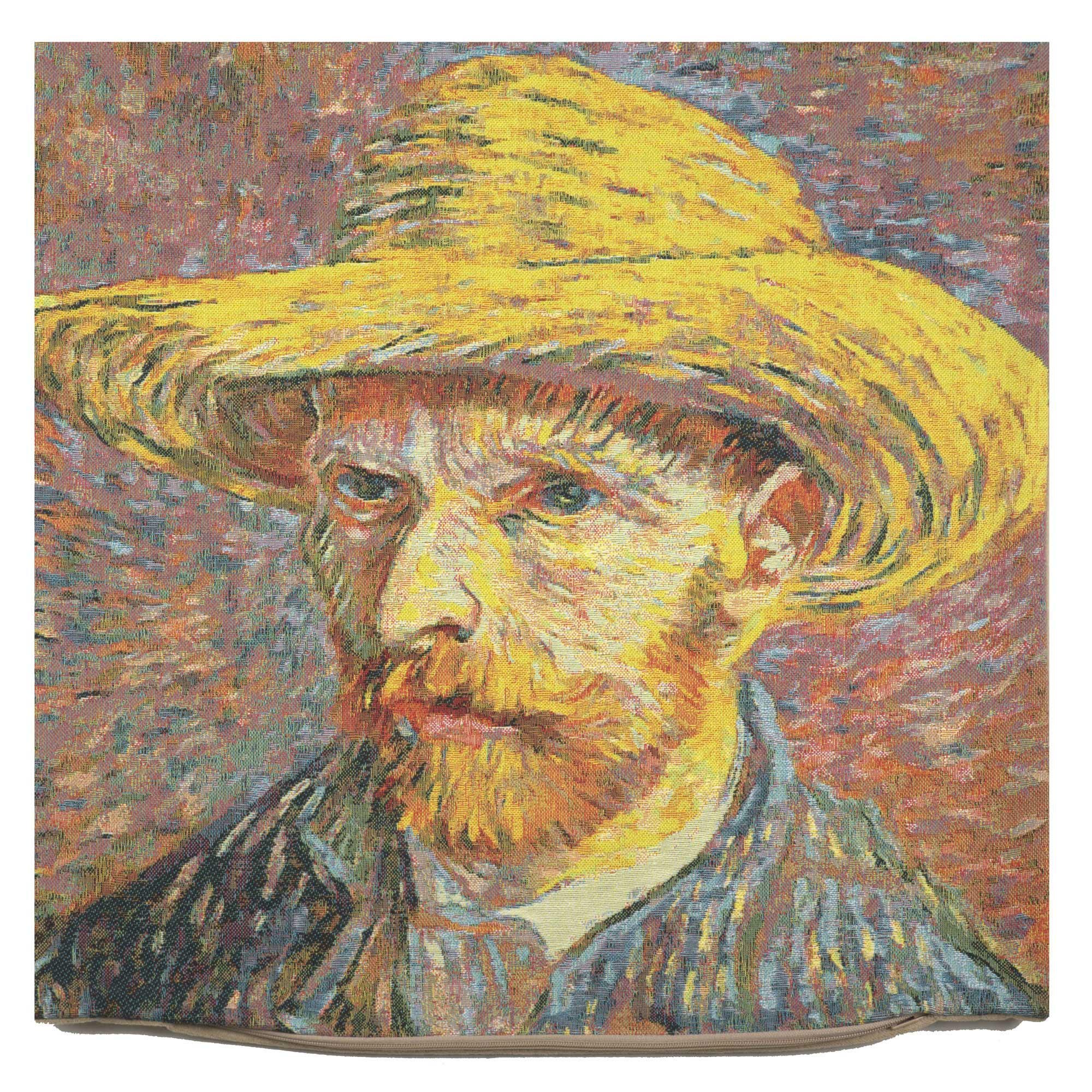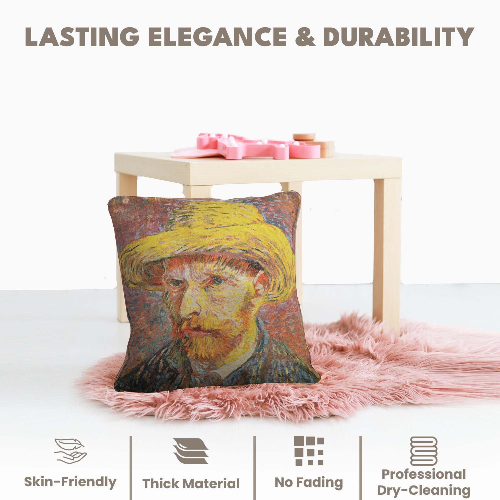 Immerse yourself in the world of classic art with this stunning 'Van Gogh's Self Portrait with Straw Hat' Belgian Cushion Cover. This cover measures 18x18 inches, a perfect size for decorating any area of your home. Crafted with care in Belgium, the detail in this woven tapestry cushion is truly impressive, mirroring the mastery of famed artist Vincent Van Gogh. Its art nouveau style guarantees to elicit admiration and conversation amongst guests. The predominant shades can harmonize with a wide range of color schemes, making this cover a versatile piece for any home or office decor. This product is not just a decorative item, but a piece of art that brings history to life. Wrap your everyday pillow with this cover and instantly elevate the aesthetics of your space. The charm and depth of Van Gogh's work are embodied in a pillow cover - it's décor that tells a story. This is the perfect addition for art lovers and fans of Van Gogh's exceptional work.