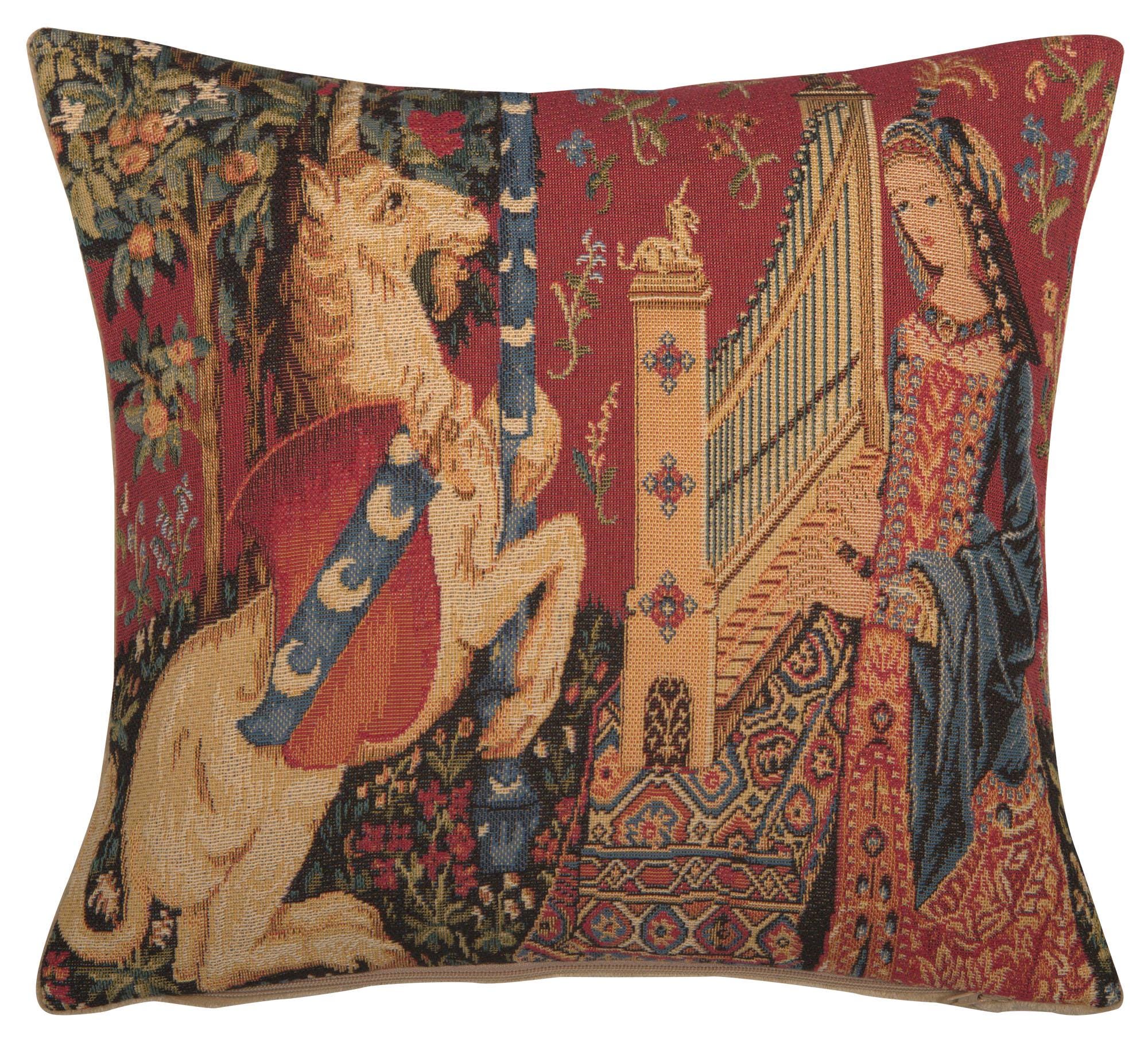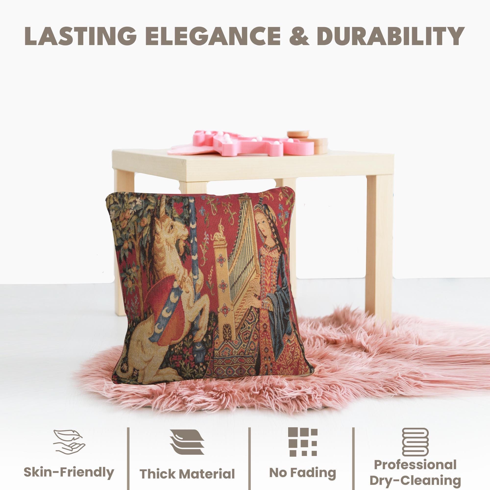 "Add timeless elegance to your home with this Lady and the Unicorn “Taste” cushion cover, inspired by the famous medieval tapestry series. This Belgian woven jacquard pillow cover features the symbolic scene of taste, with a noble lady and unicorn surrounded by rich floral details, bringing history and artistry into your decor.