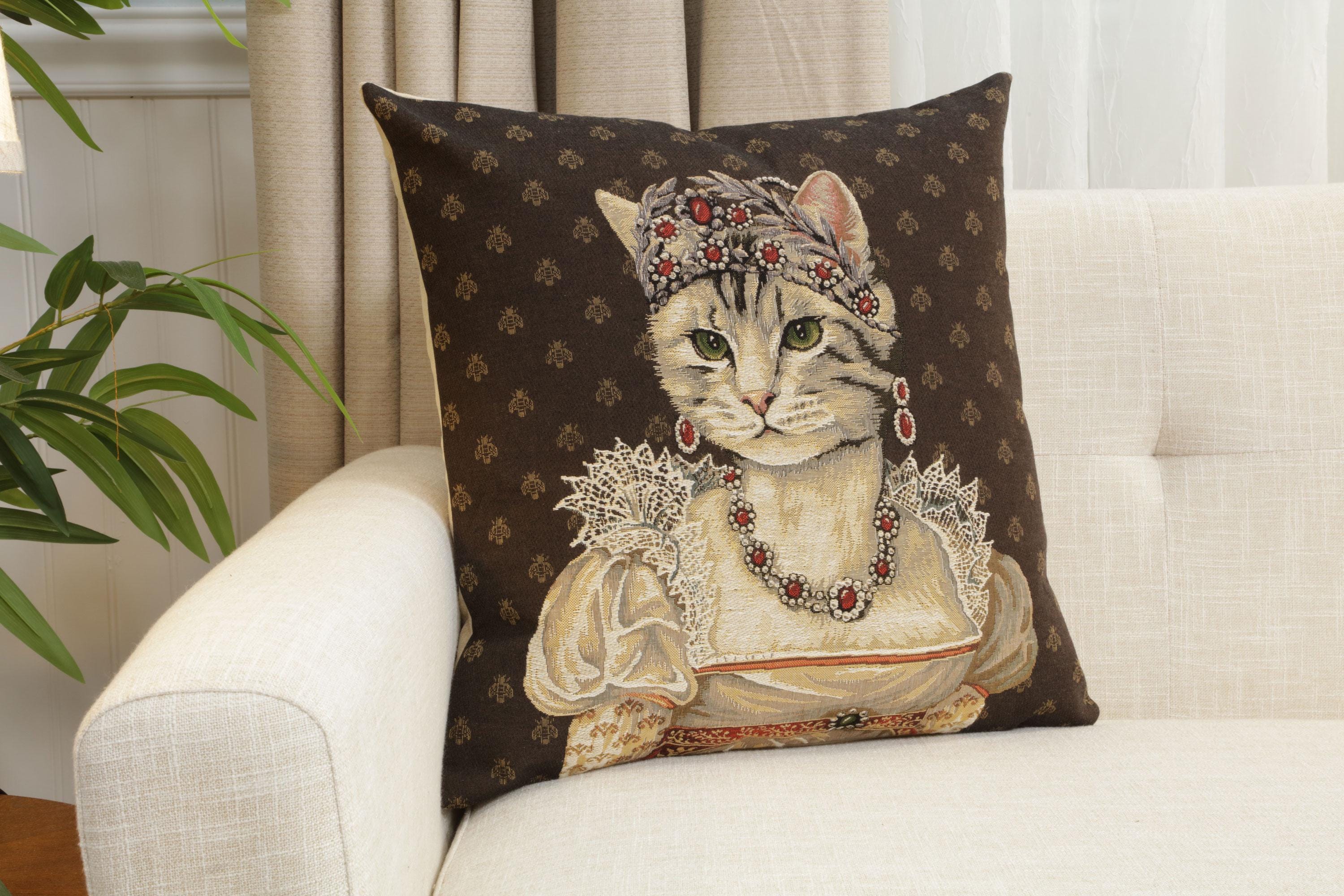 🐾 Add a touch of royal charm to your home with the Chat Josephine tapestry cushion cover. This woven pillow cover features a majestic white cat wearing a crown, inspired by classic Gobelin tapestry art—a true statement piece for cat lovers and vintage-style interiors.