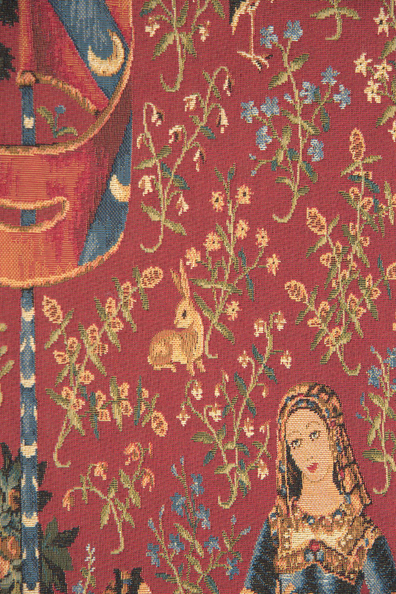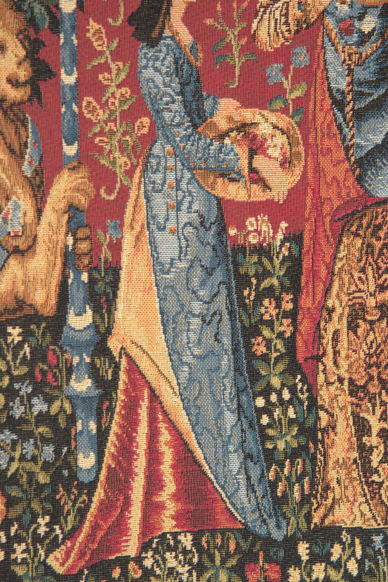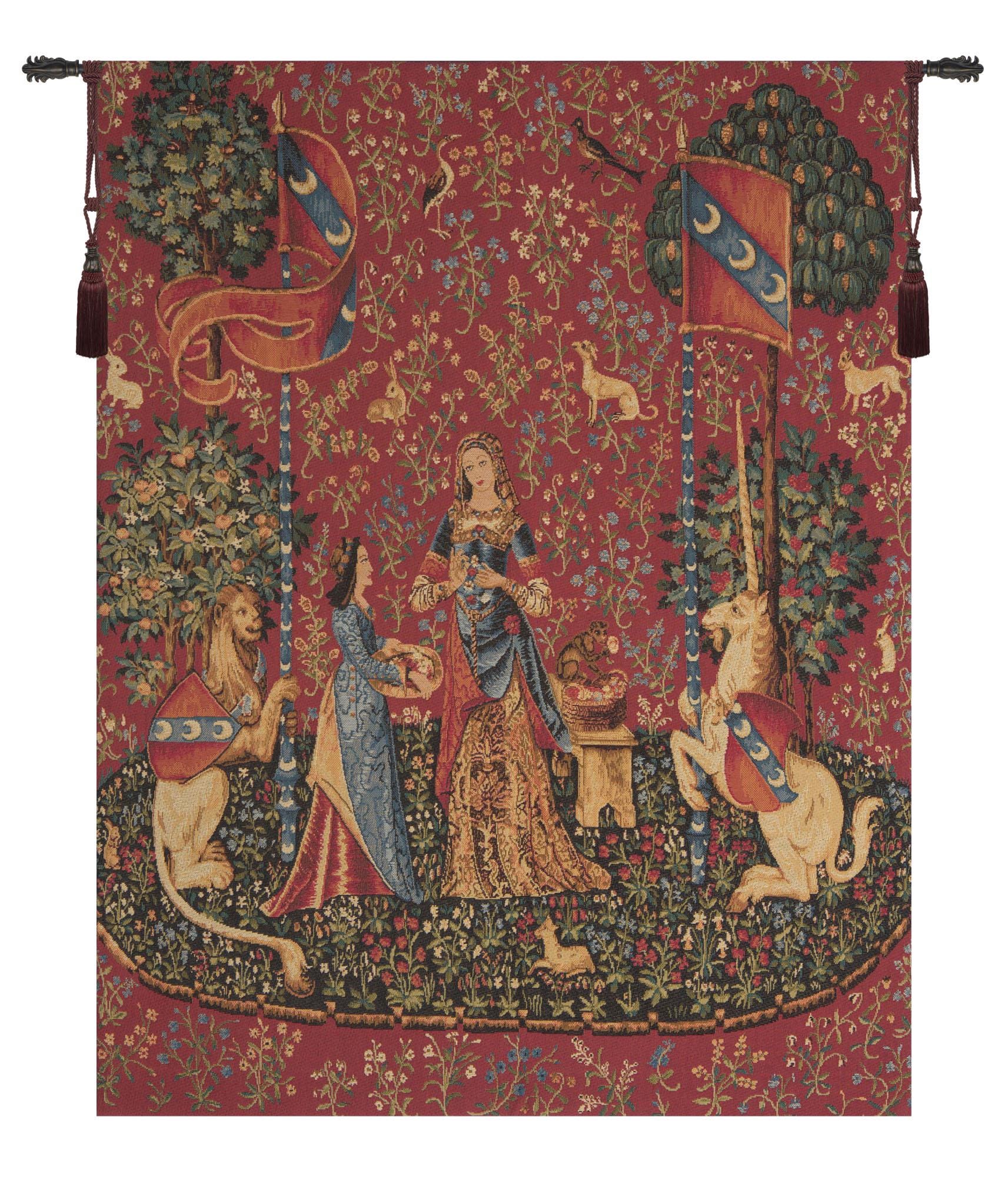 This Lady and Unicorn Wall Art showcases a lady holding and smelling a fragrant perfume brought to her by the maidservant. The lion and unicorn hold pennants on each side of the lady.