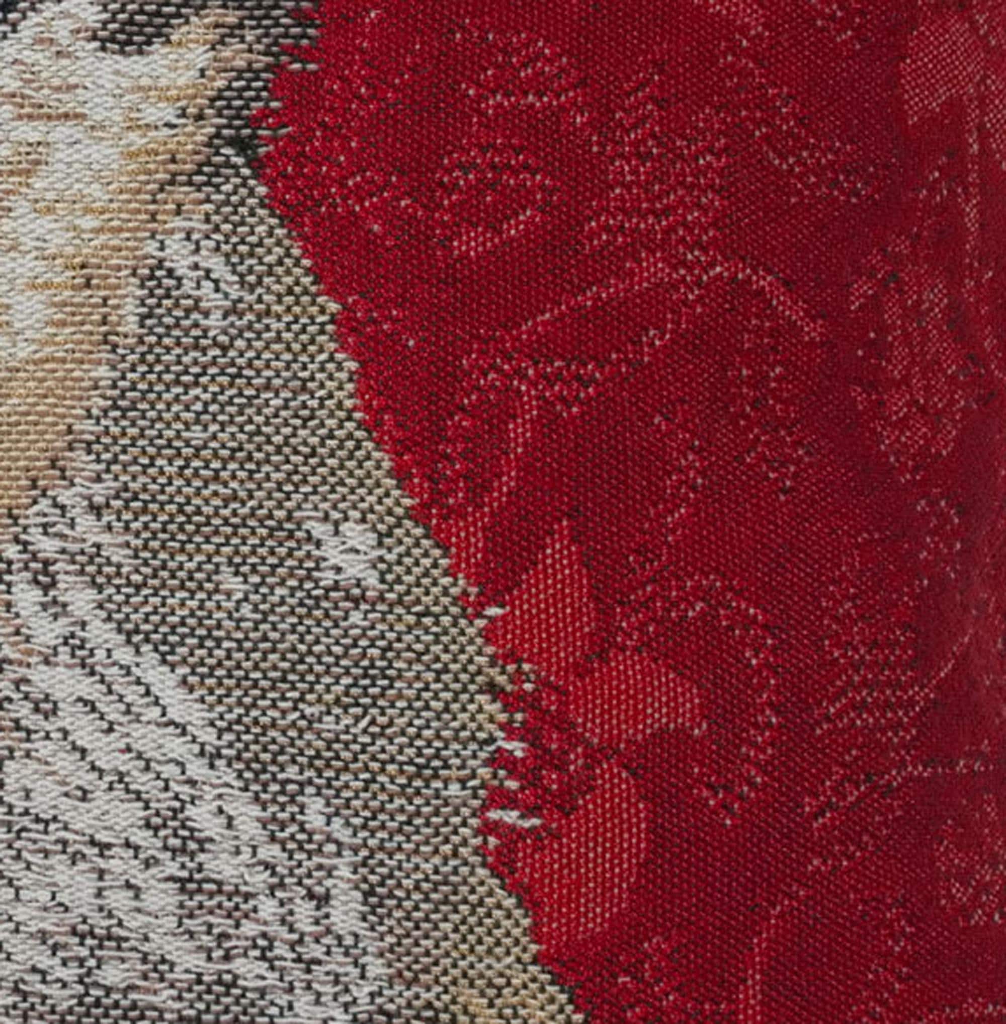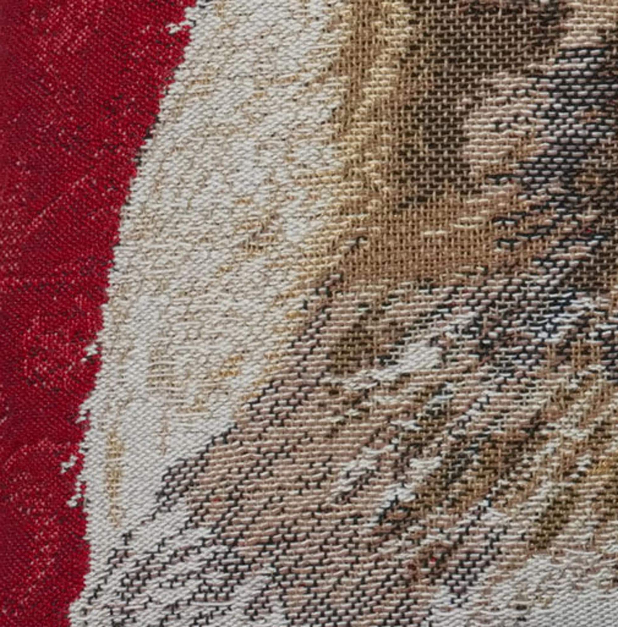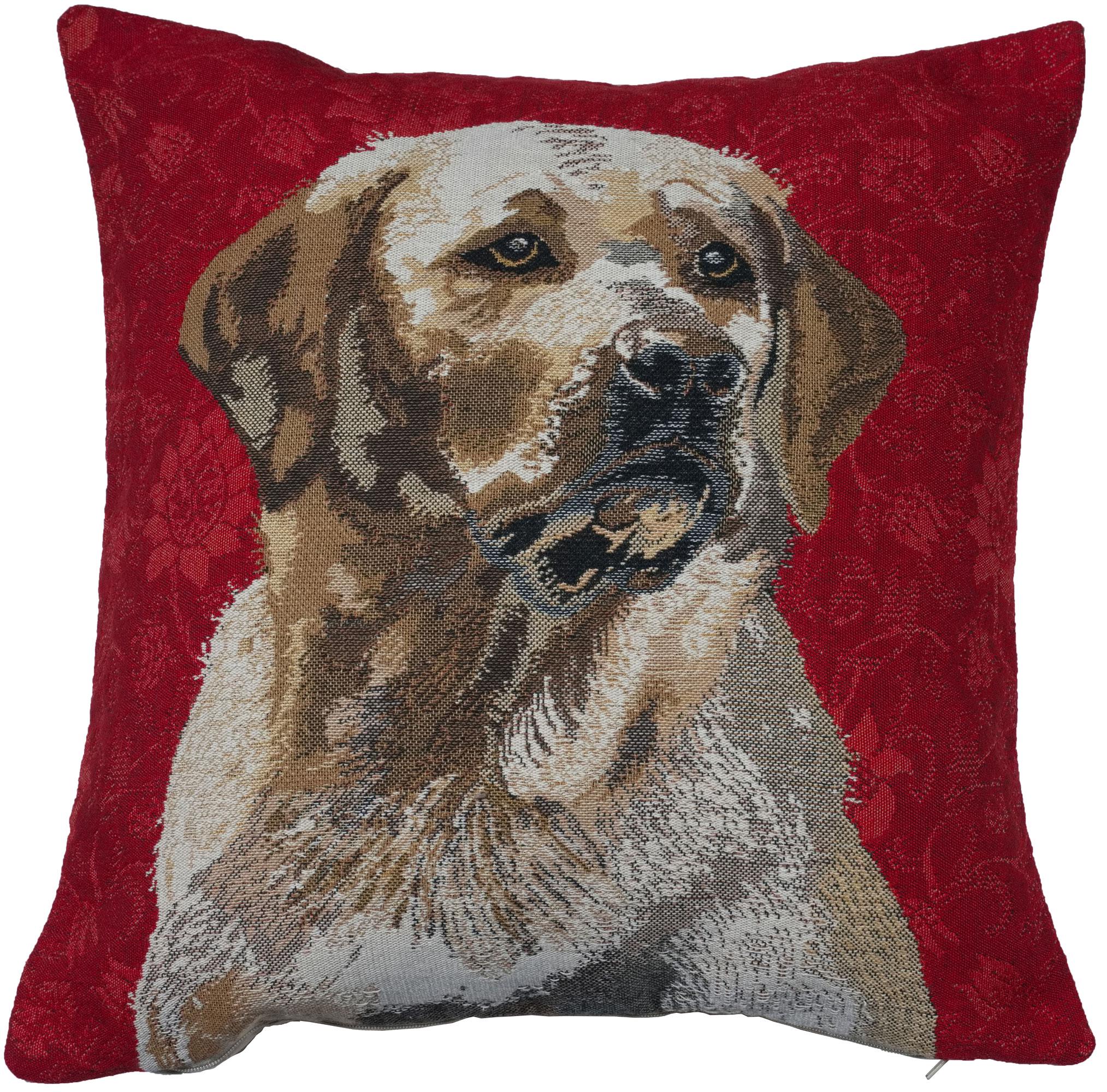 Crafted with precision, this Belgian cushion exemplifies the art of jacquard weaving, showcasing the country's longstanding tradition of textile excellence. Measuring a generous 16 by 16 inches, it serves as a versatile toss pillow, effortlessly elevating the aesthetic of your surroundings. The combination of the Labrador's charm and the intricate floral details woven into the red background creates a harmonious blend of nature and companionship.
