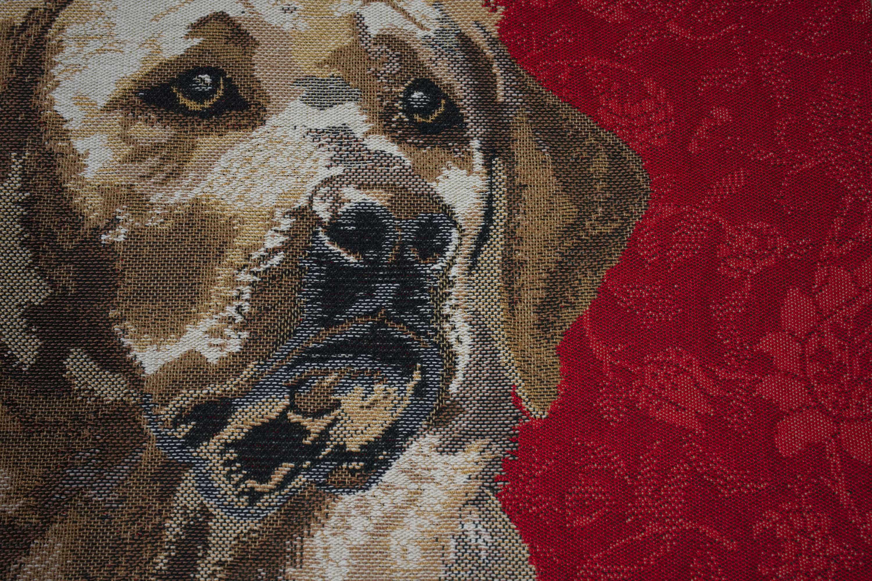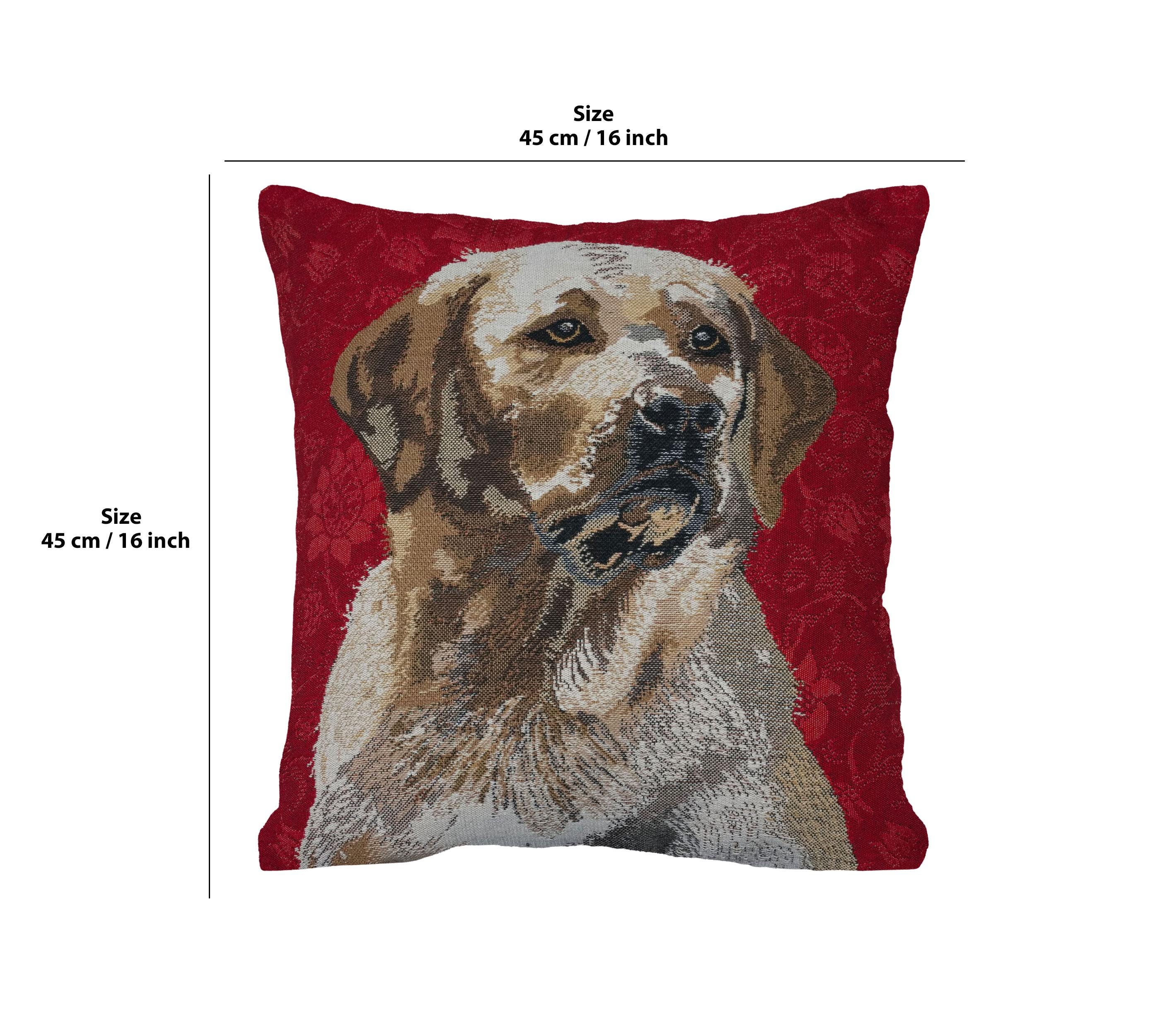 Behold the exquisite beauty of this Jacquard-woven cushion cover featuring a serene yellow Labrador against a backdrop of deep red intricately adorned with subtle flowers and vines. This tapestry pillow cover is not merely an accessory but a masterpiece that captures the essence of artistry and comfort. The Labrador's soft eyes and gentle expression add a touch of warmth to the design, making it a perfect addition to any living space.