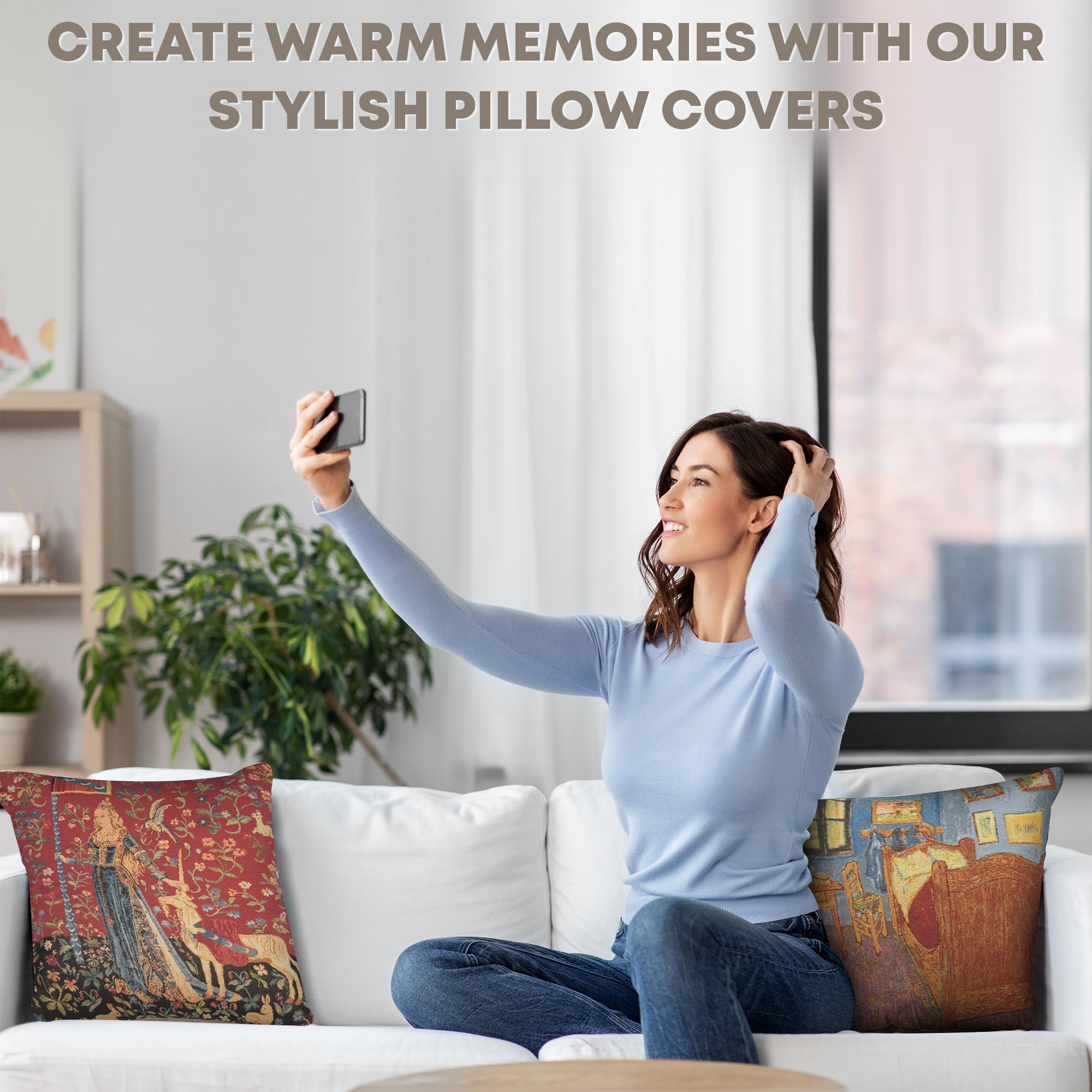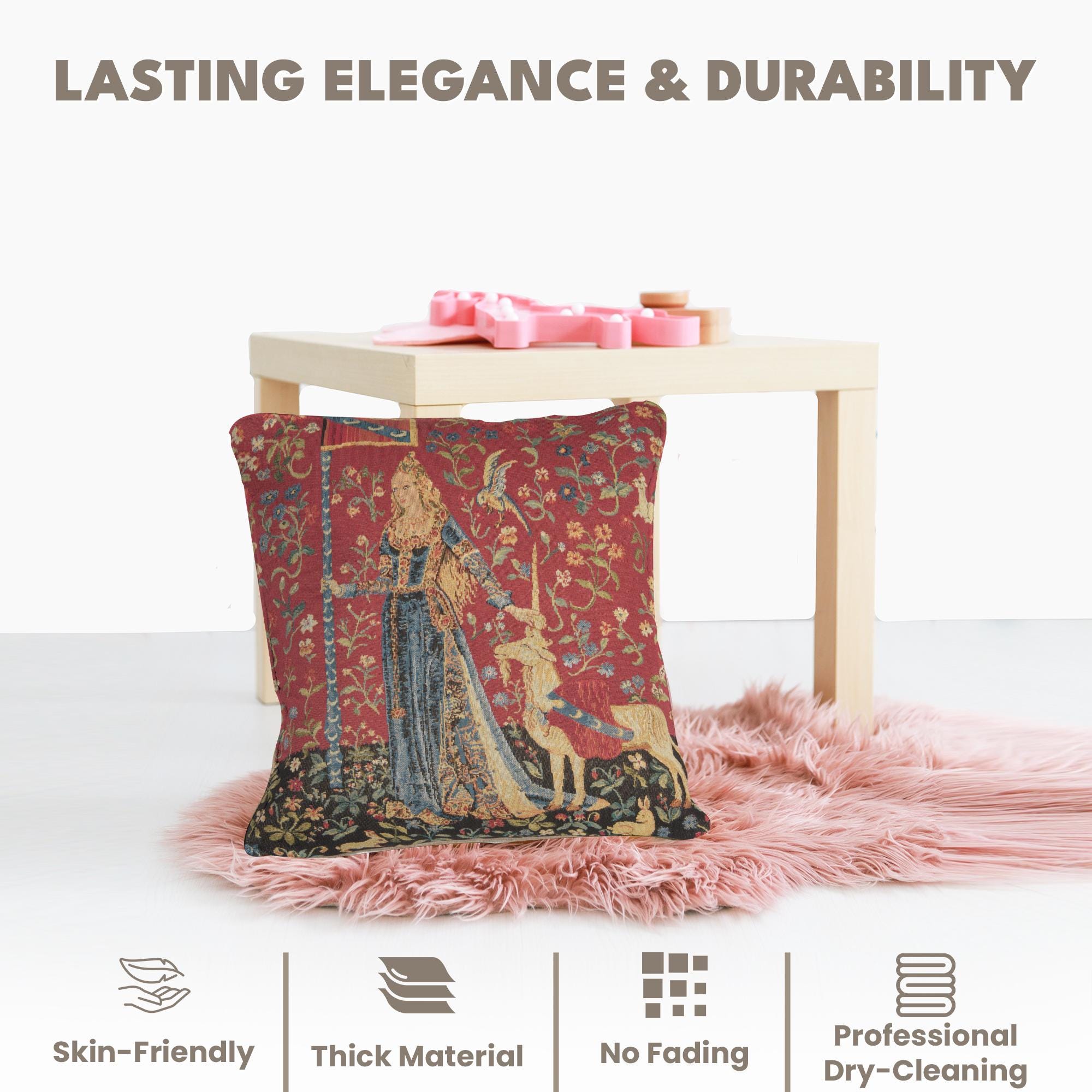 Inspired by medieval European art, the Lady Unicorn tapestry cushion cover features a timeless, mythical design woven in rich Belgian jacquard style. This 18x18-inch decorative pillow cover adds storybook elegance and historical charm to bohemian, vintage, or artistic interiors.