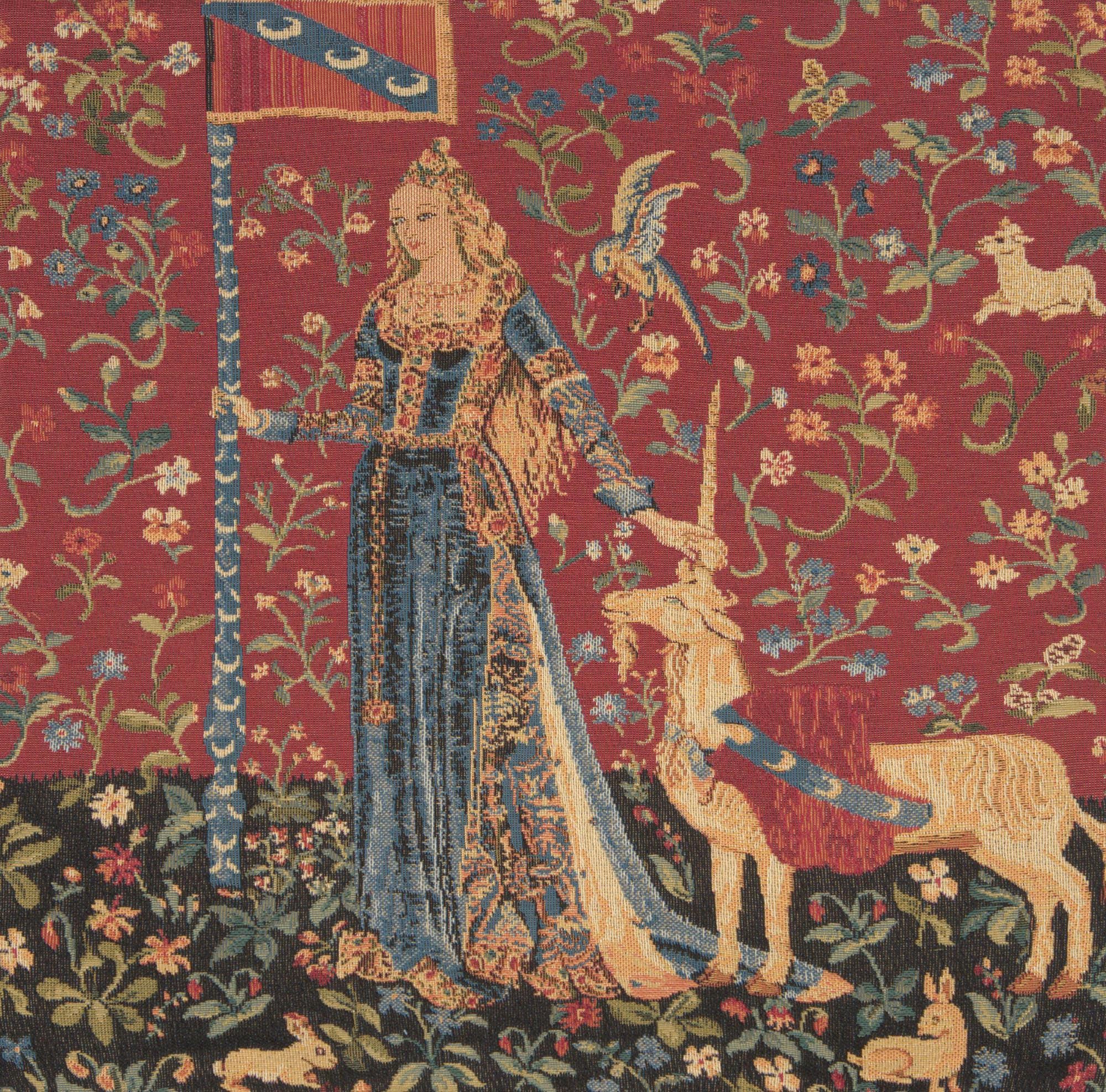 Belgian woven tapestry with medieval Lady Unicorn motif
