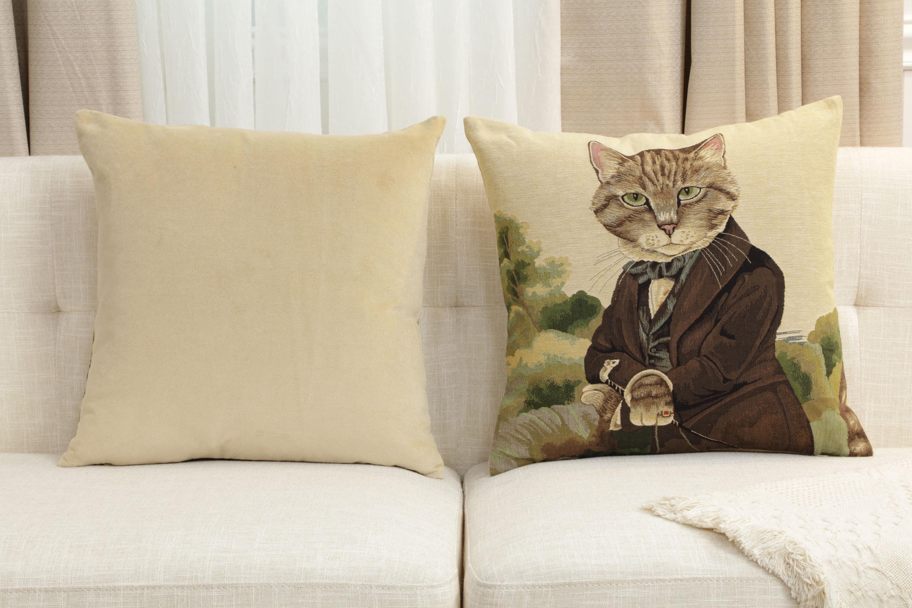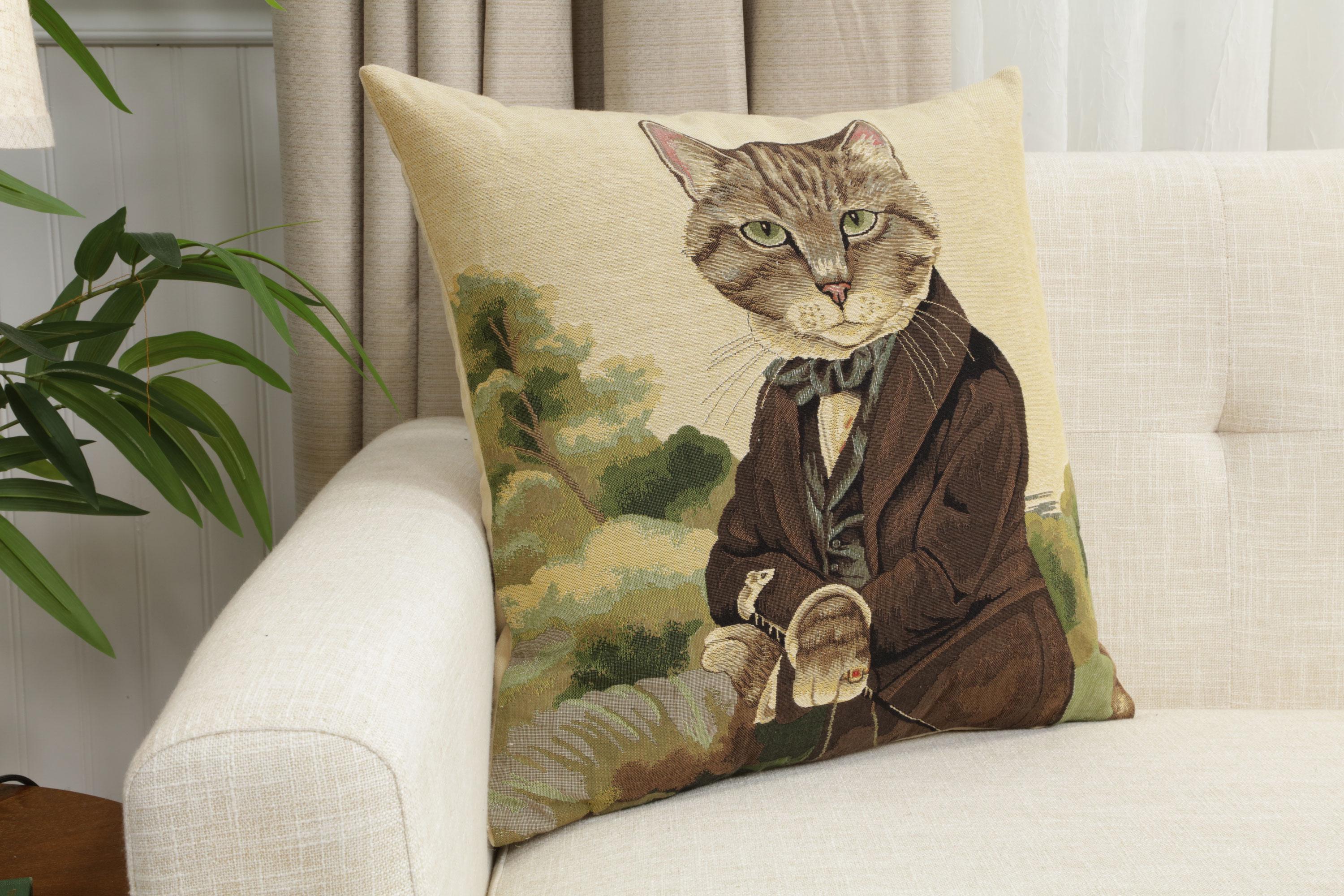 Adorning this decorative tapestry is the renowned artwork of Susan Herbert, a celebrated artist known for her whimsical feline portraits. In this rendition, a cat takes center stage, elegantly dressed in human attire. With debonair charm, the green-eyed tabby sits poised, crossing its paws, while sporting a distinguished brown suit and a ruffled collar. Adding a touch of sophistication, a ruby ring adorns its paw, hinting at a refined taste and style.