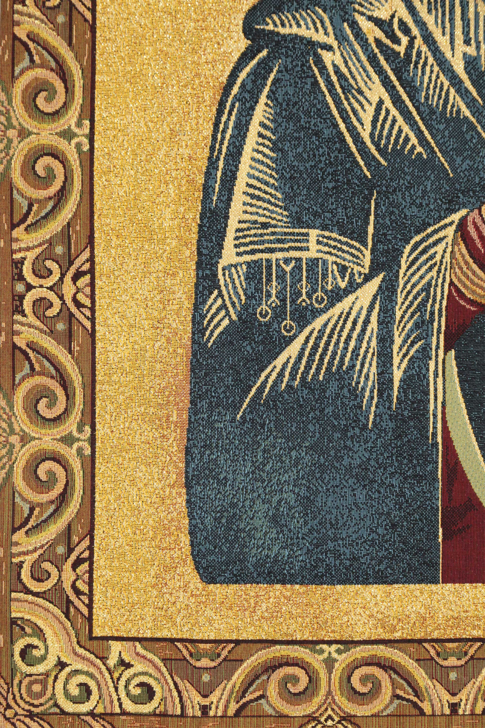 Honor timeless devotion and heavenly protection with this stunning Madonna Perpetuo Soccorso Wall Hanging. Woven in Italy with exquisite craftsmanship, this Virgin Mary tapestry beautifully depicts the Madonna gently cradling the infant Jesus, enveloped in a flowing blue robe that symbolizes purity and maternal love.