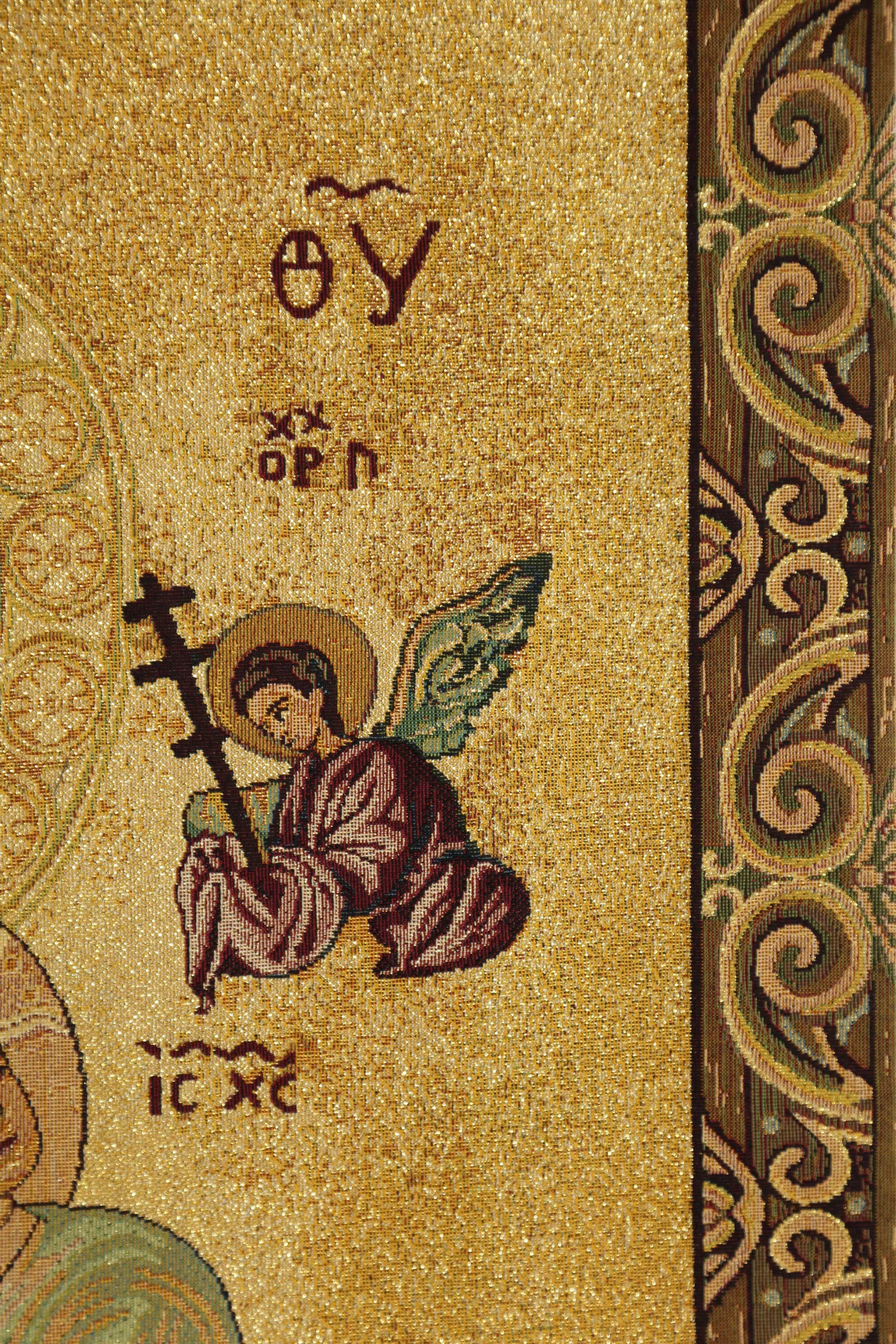 Graceful angelic figures surround them, radiating divine light, protection, and blessings โ creating a sacred focal point for your Catholic home decor or prayer space. Subtle gold thread accents bring a touch of shimmer and elevate this religious wall art into a breathtaking spiritual statement piece