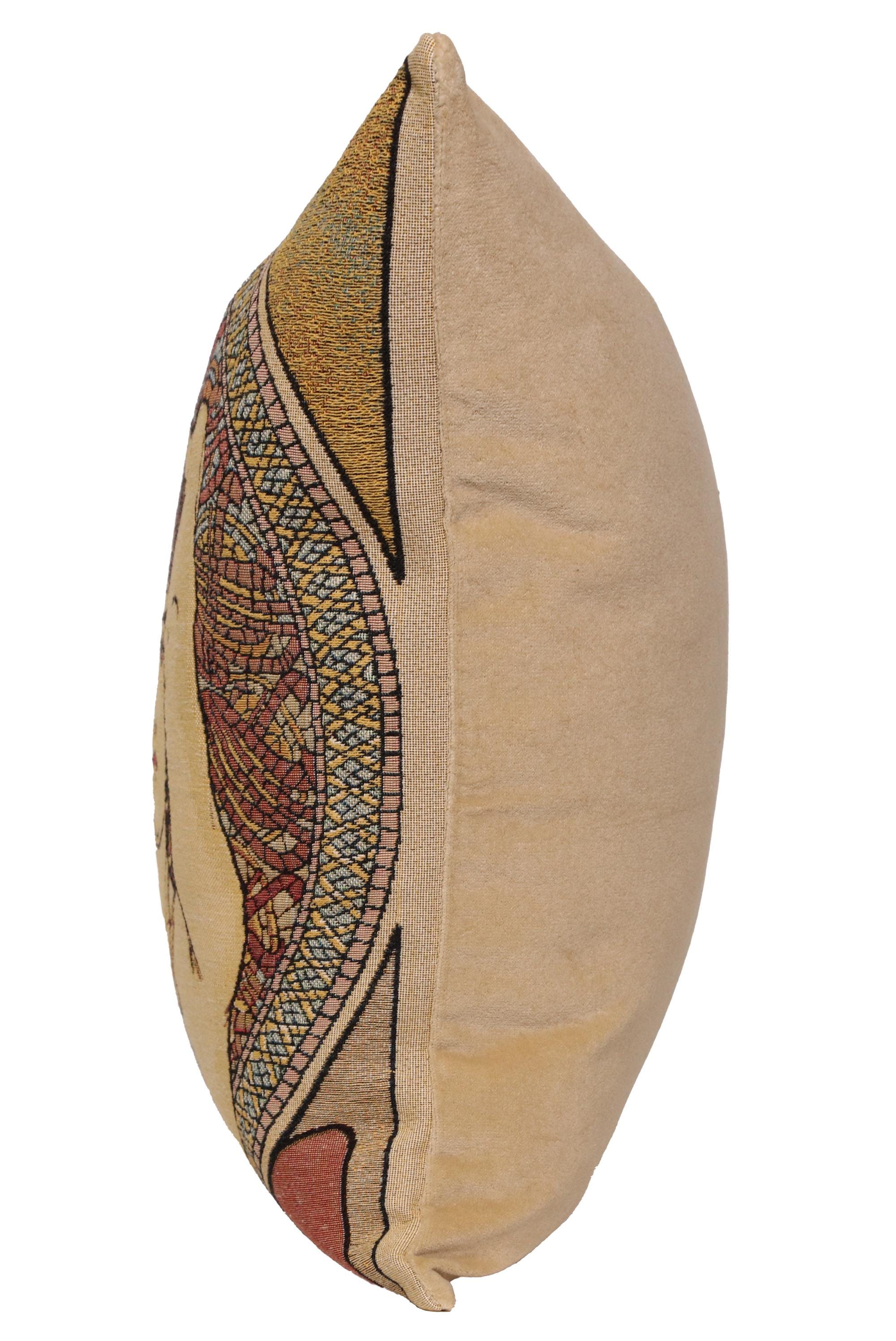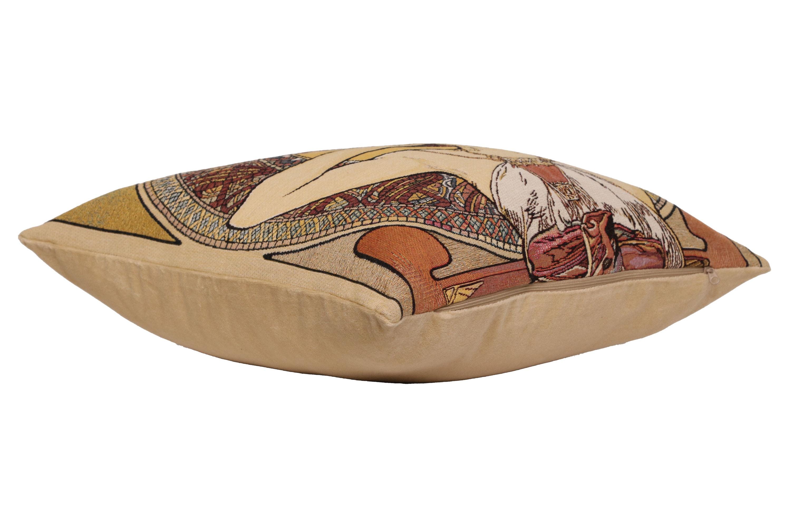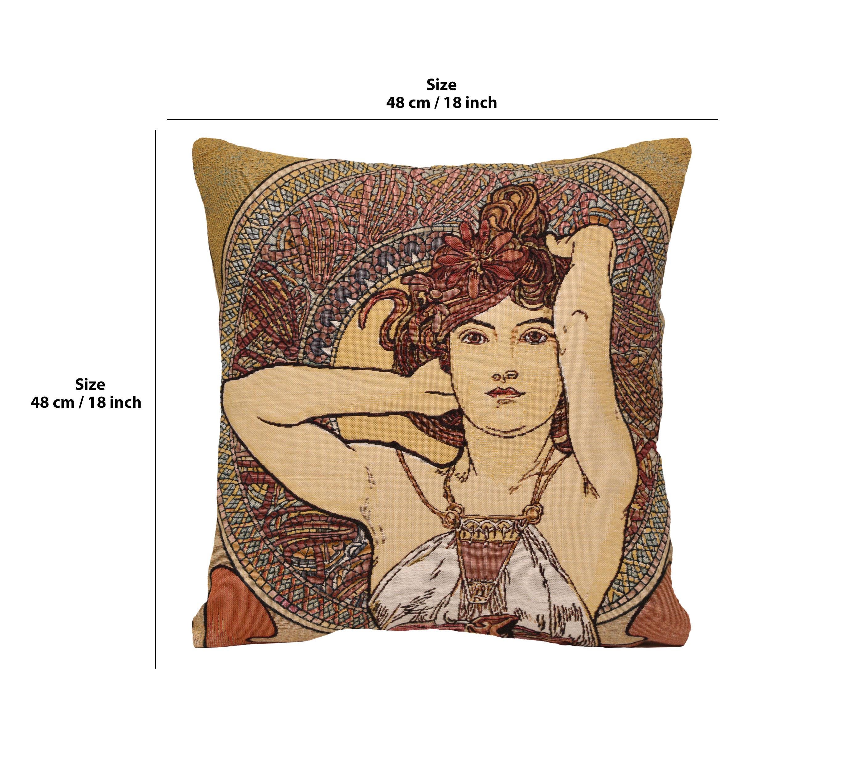 "Add timeless elegance to your space with this Mucha Amethyst cushion cover, an Art Nouveau inspired Belgian woven tapestry featuring a graceful portrait design, vintage European style, and intricate jacquard detailing perfect for classic and artistic home decor.