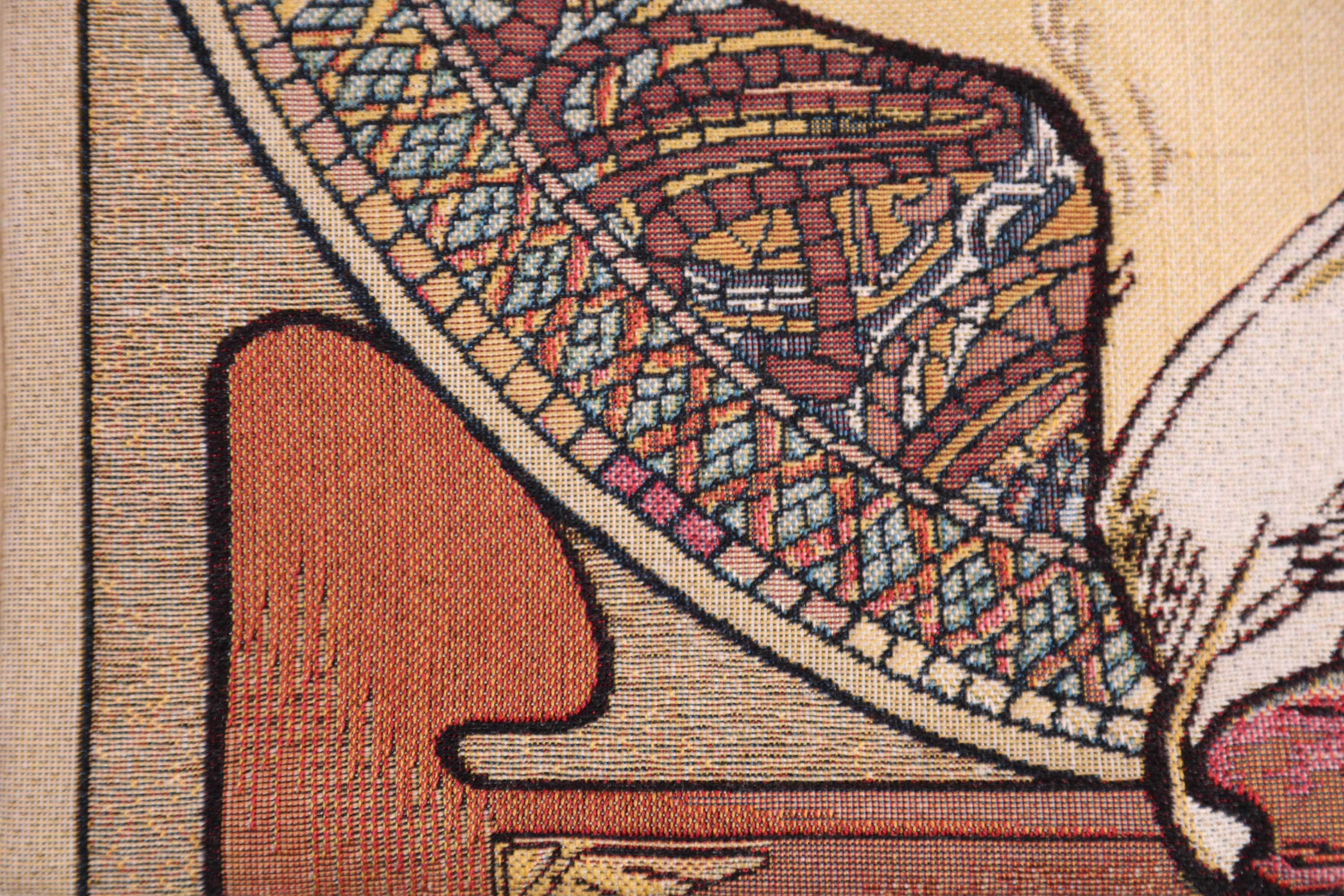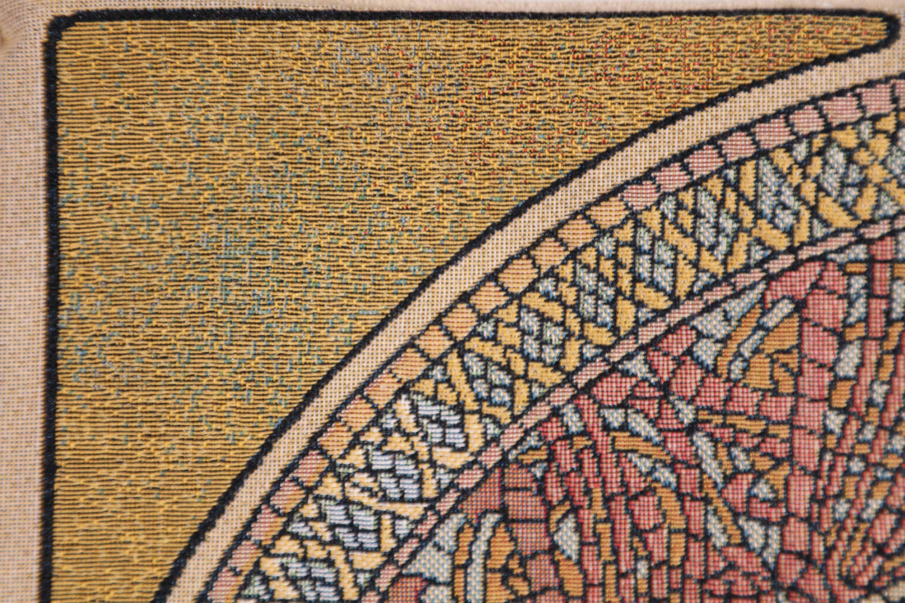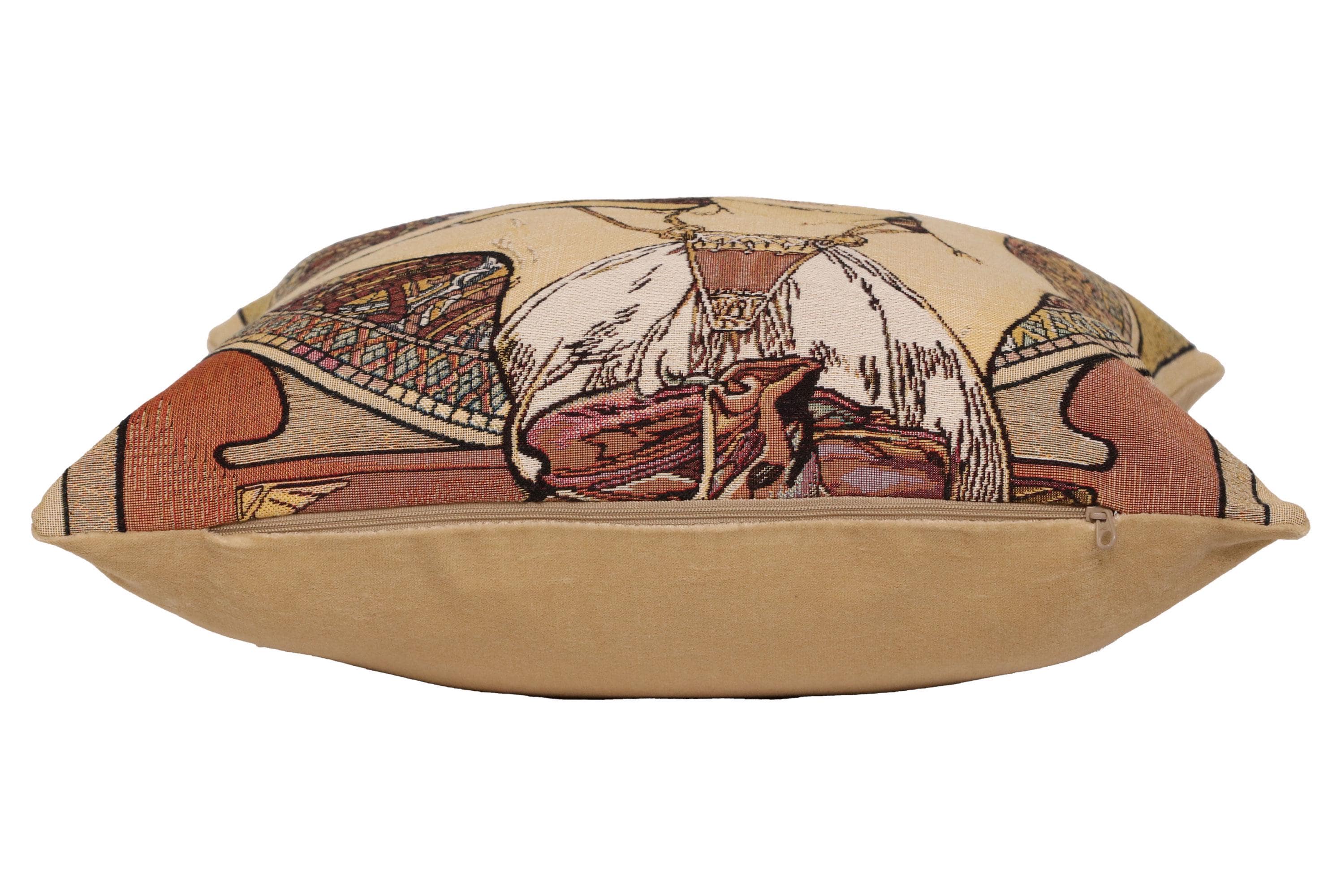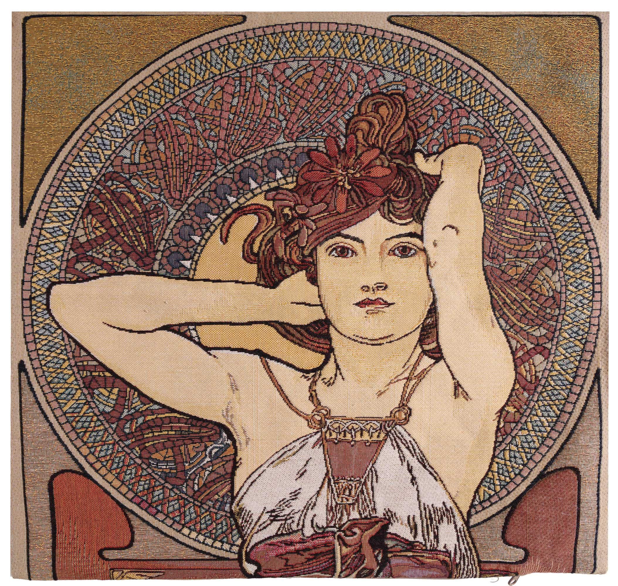 "Add timeless elegance to your space with this Mucha Amethyst cushion cover, an Art Nouveau inspired Belgian woven tapestry featuring a graceful portrait design, vintage European style, and intricate jacquard detailing perfect for classic and artistic home decor.