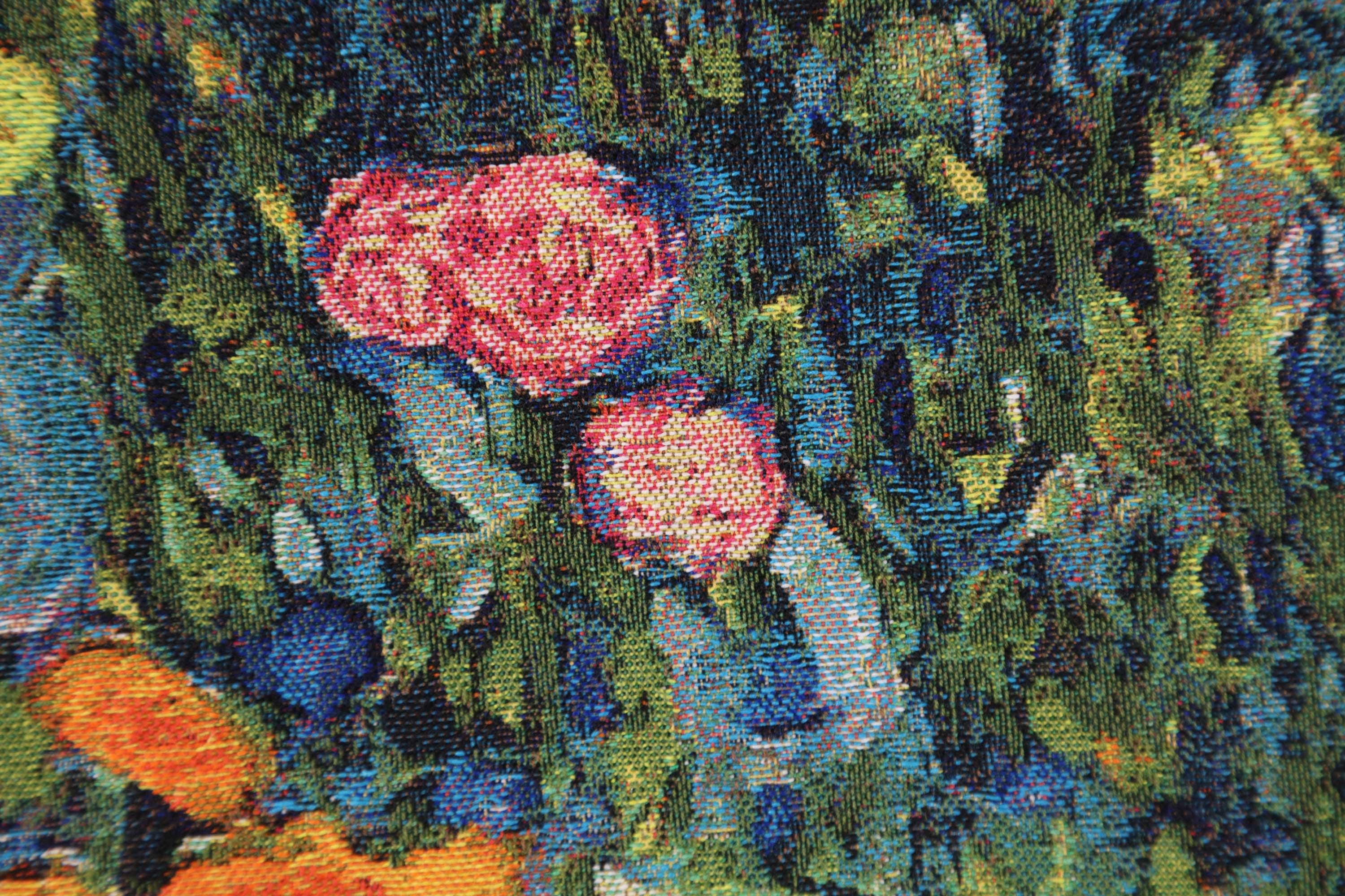 Adding to its allure, the cushion cover is backed with Belgian velvet, providing a plush and inviting feel. This fusion of elegance and comfort makes it not only a striking decorative tapestry but also a cozy accent piece, perfect for enhancing the ambiance of any room.