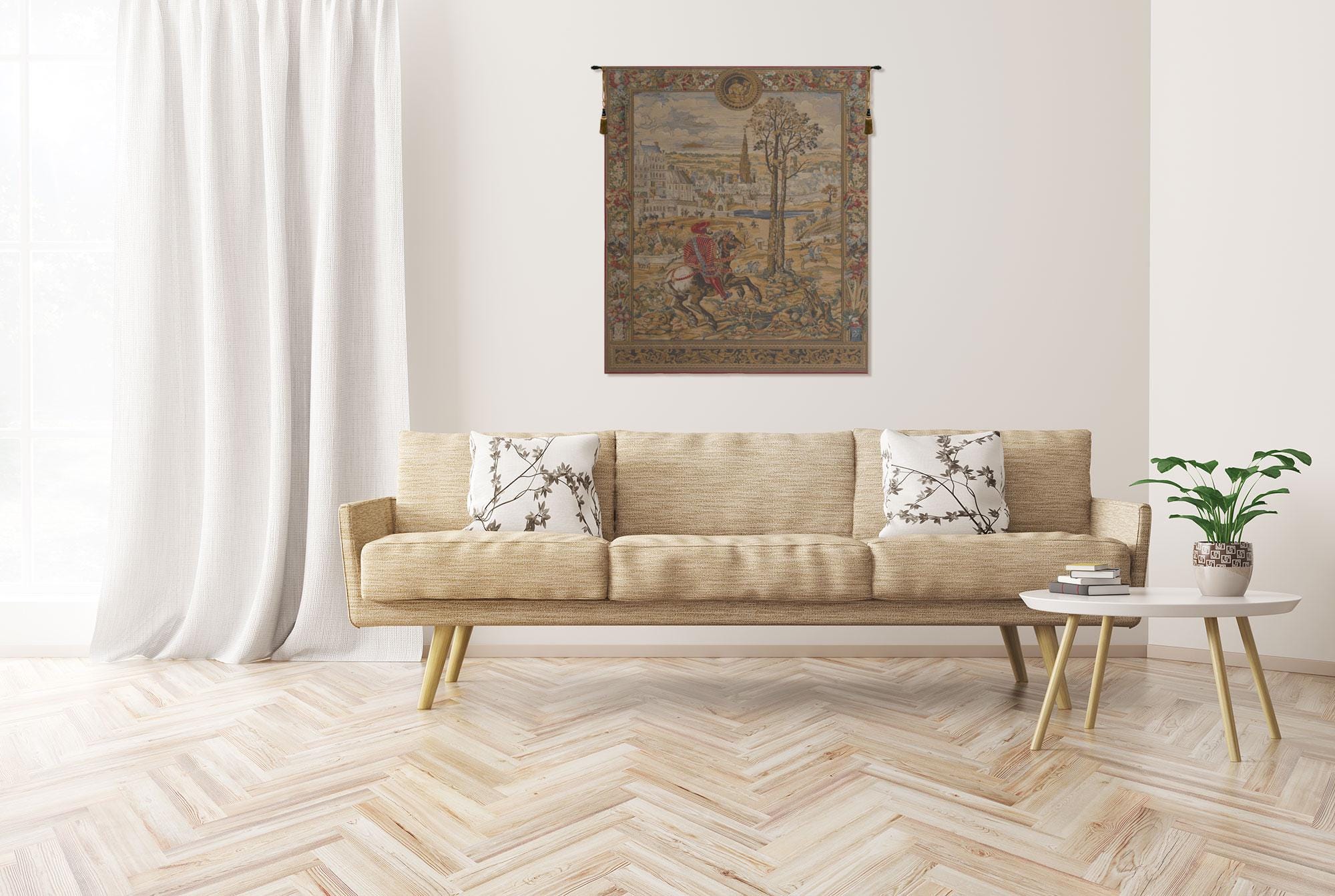 Maximilien is a Belgian made jacquard woven wall tapestry. The red horseman represents the Archduke Maximilien. This scene represents the month of March; the design was originally one in a series of twelve tapestries woven in Brussels during the Renaissance. Designed by Bernard van Orley (1488 - 1541).