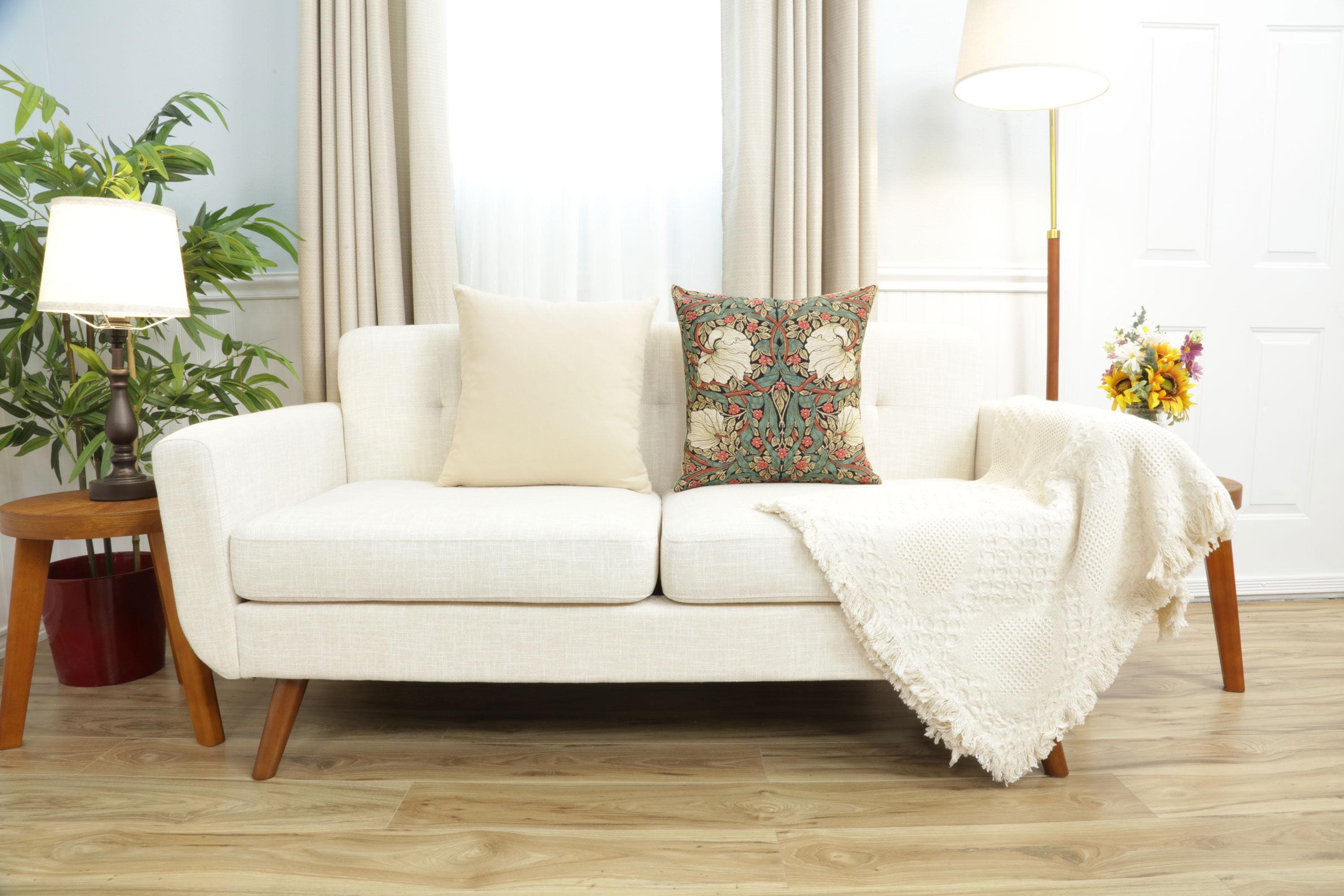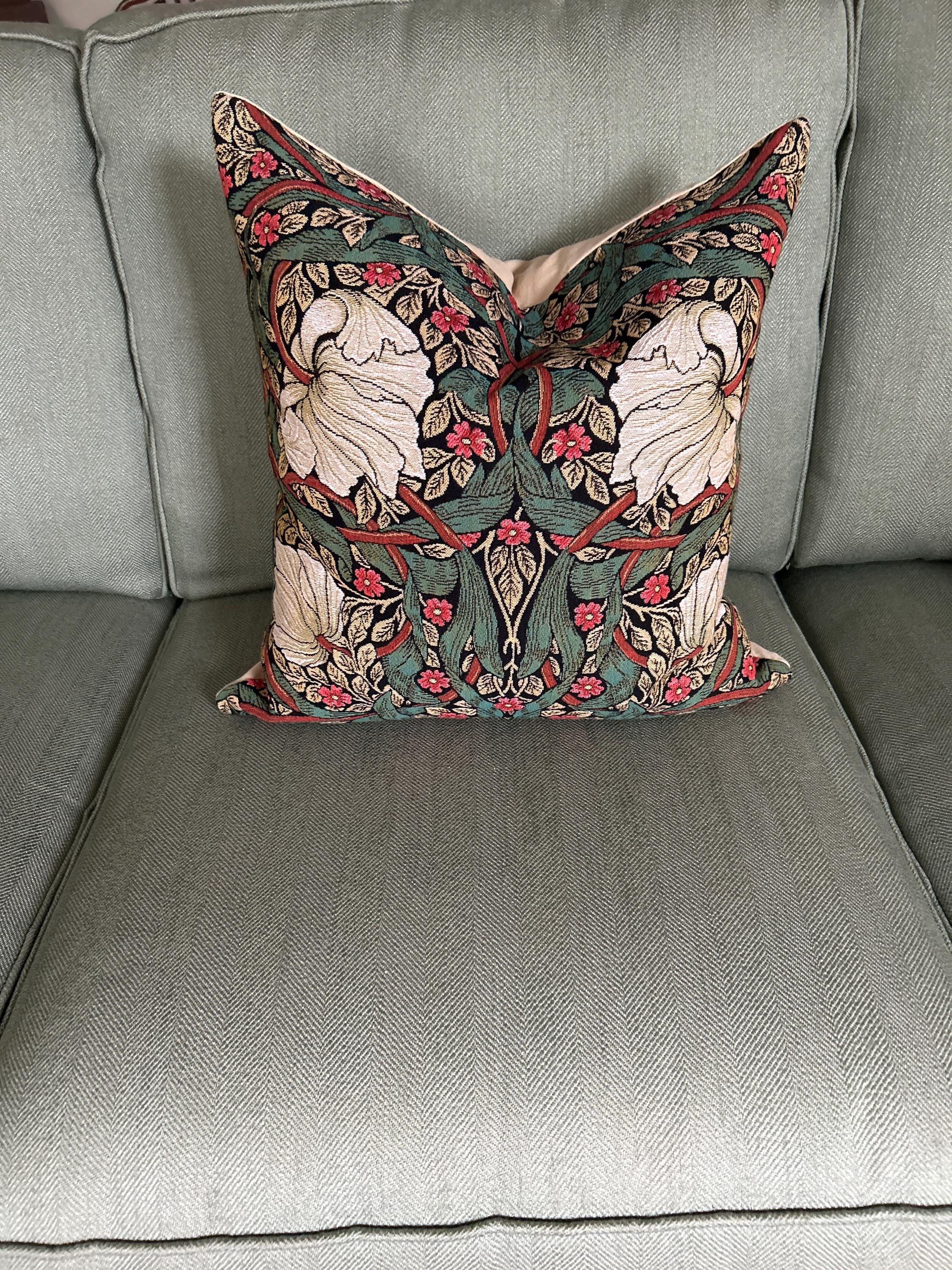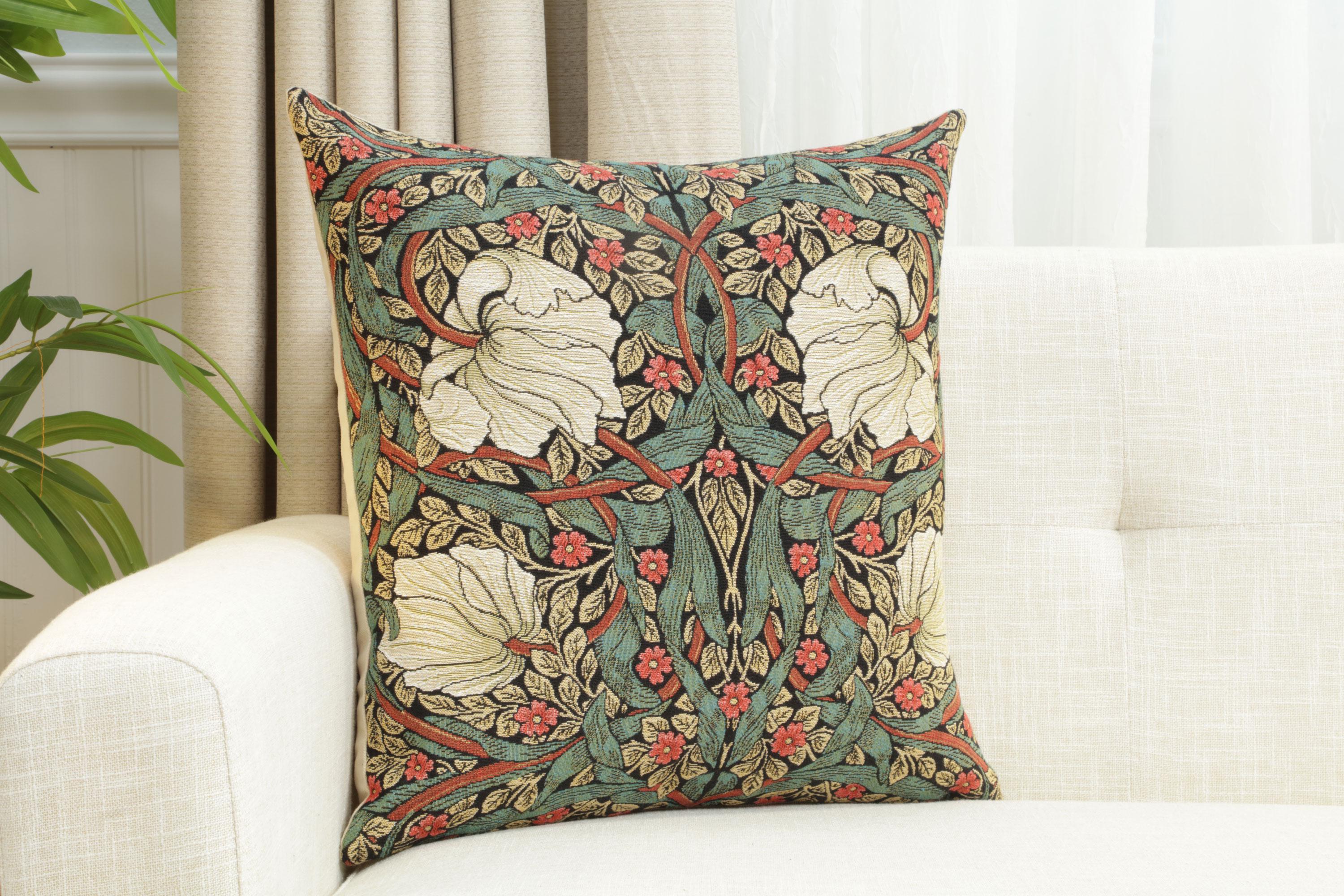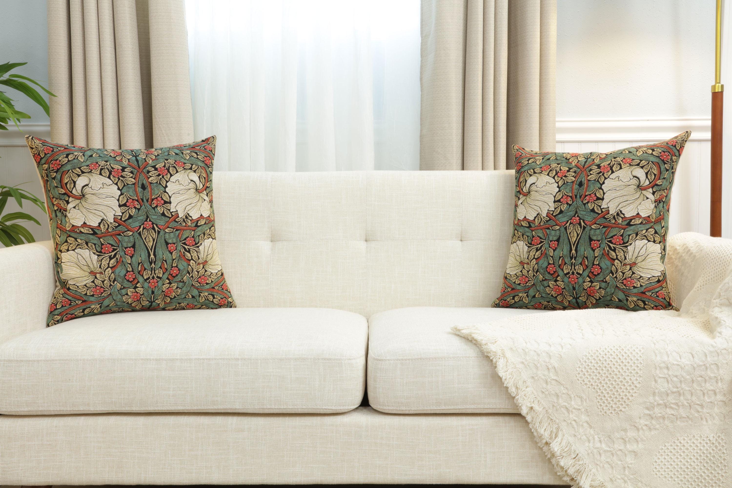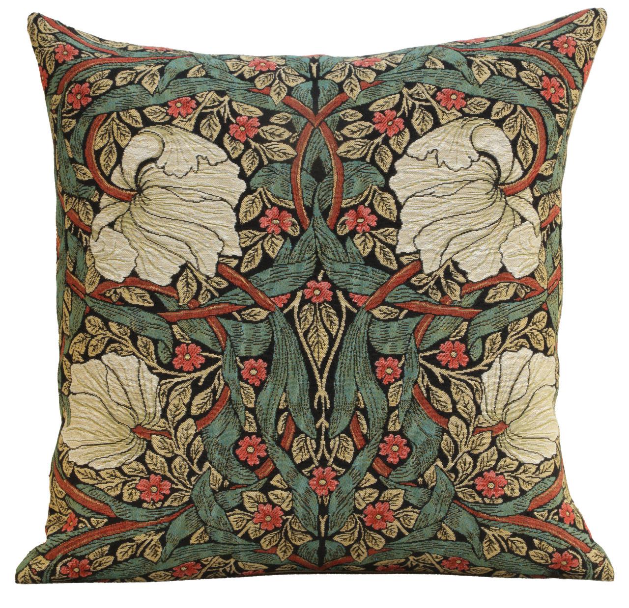 Add a vibrant touch to your decor with the Pimpernel Green/Red square pillow cover. This 18x18 inch inch tapestry pillow case showcases a lively design of intertwining greens and reds, inspired by the timeless artistry of William Morris. Meticulously woven in Belgium, this piece combines elegance and durability, making it perfect for couches, beds, or accent chairs. Infuse your space with sophistication and charm, and create a cozy ambiance with this versatile decorative pillow cover.