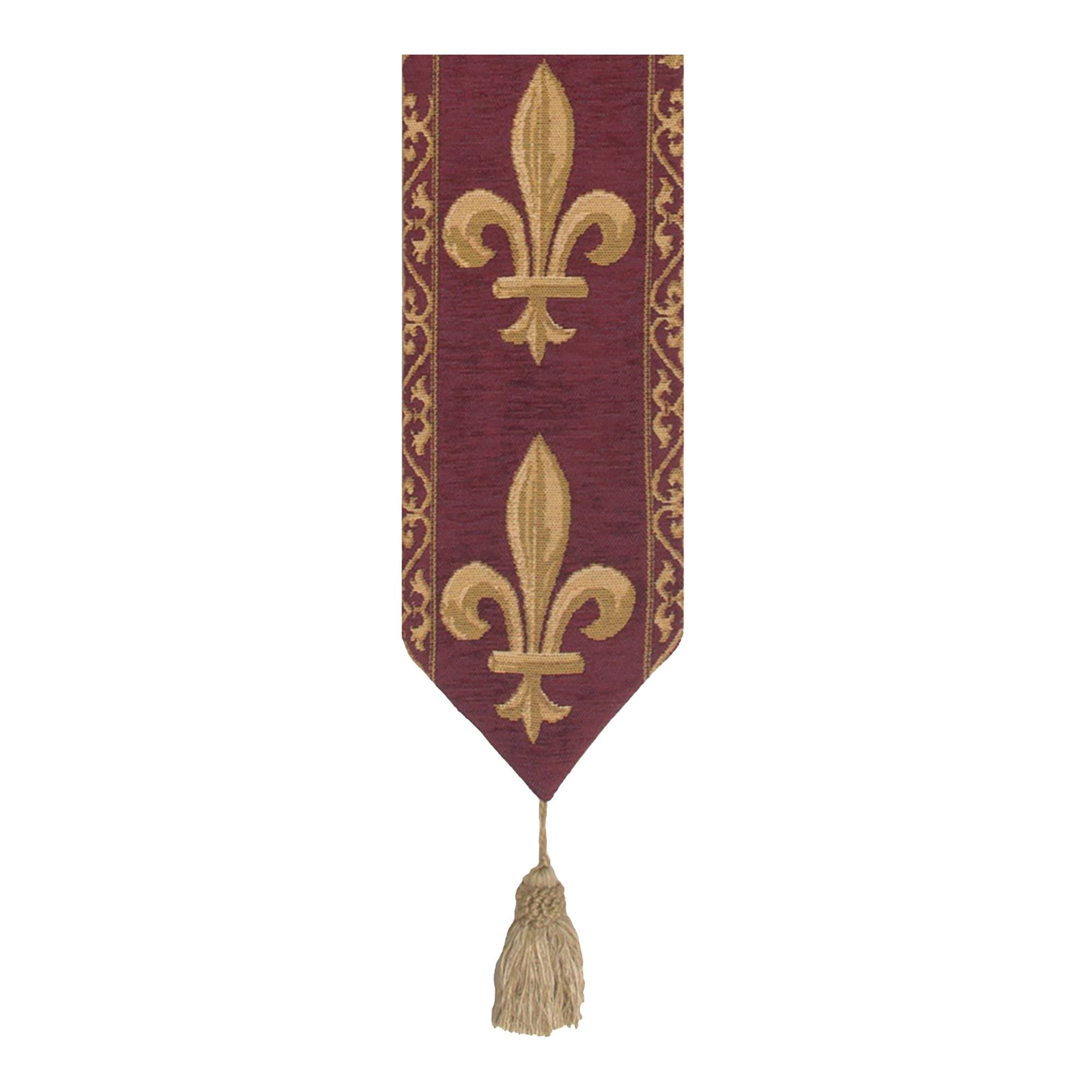 Featuring four gold Fleur de Lys symbols arranged against a deep red background, this exquisite woven Belgian bell pull adds a regal touch to your interior decor. Whether displayed in a hallway, entryway, or living space, this classic French wall tapestry enhances your home with sophisticated European craftsmanship.