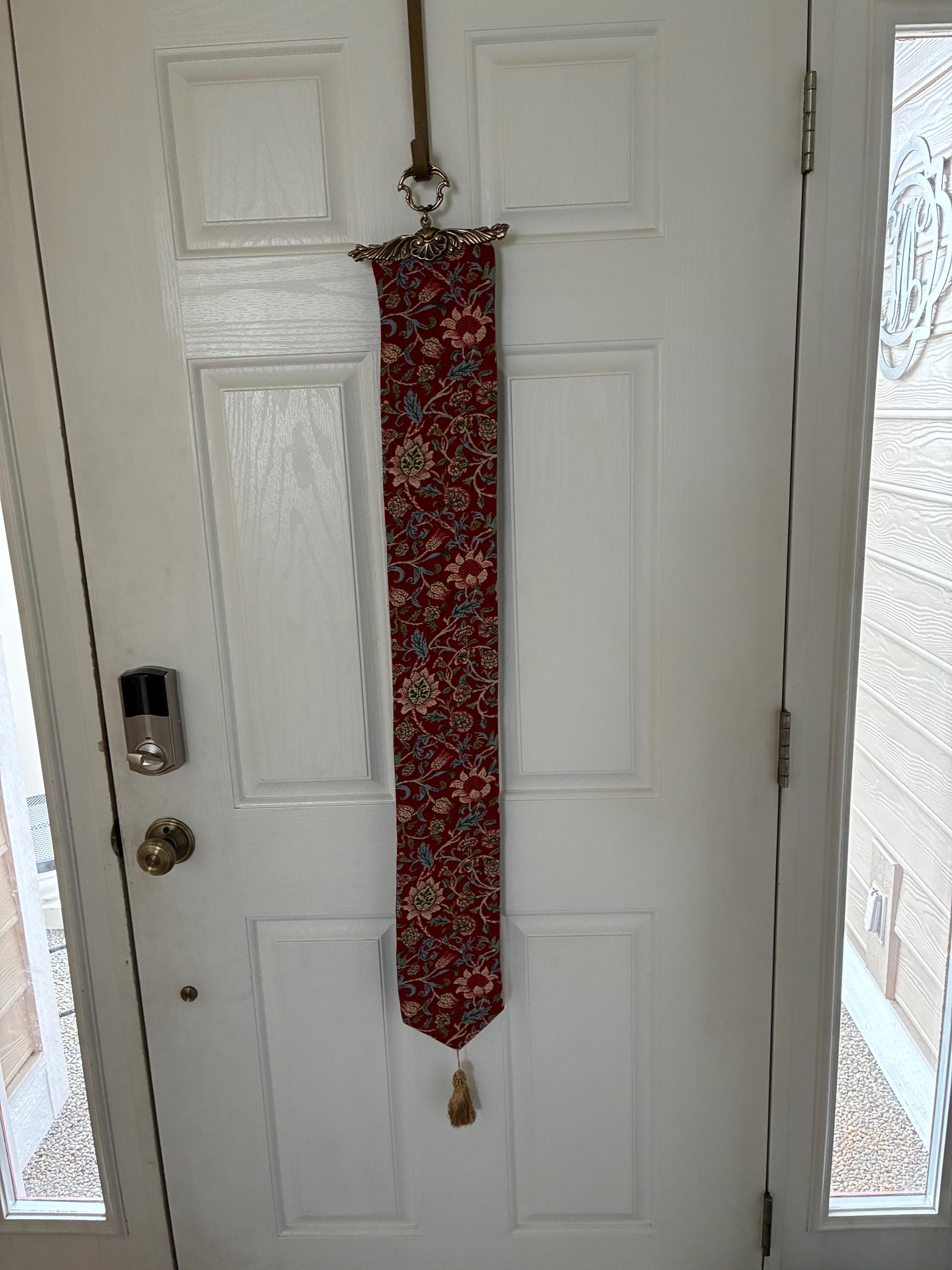 This is a lovely bell pull, but it hangs a bit crooked (the way is loops the top bar) as well as not being straight, but curving slightly as it hangs. Wanted to give 5 stars, but it is uneven and slightly slithers down the door rather than hanging straight and true.