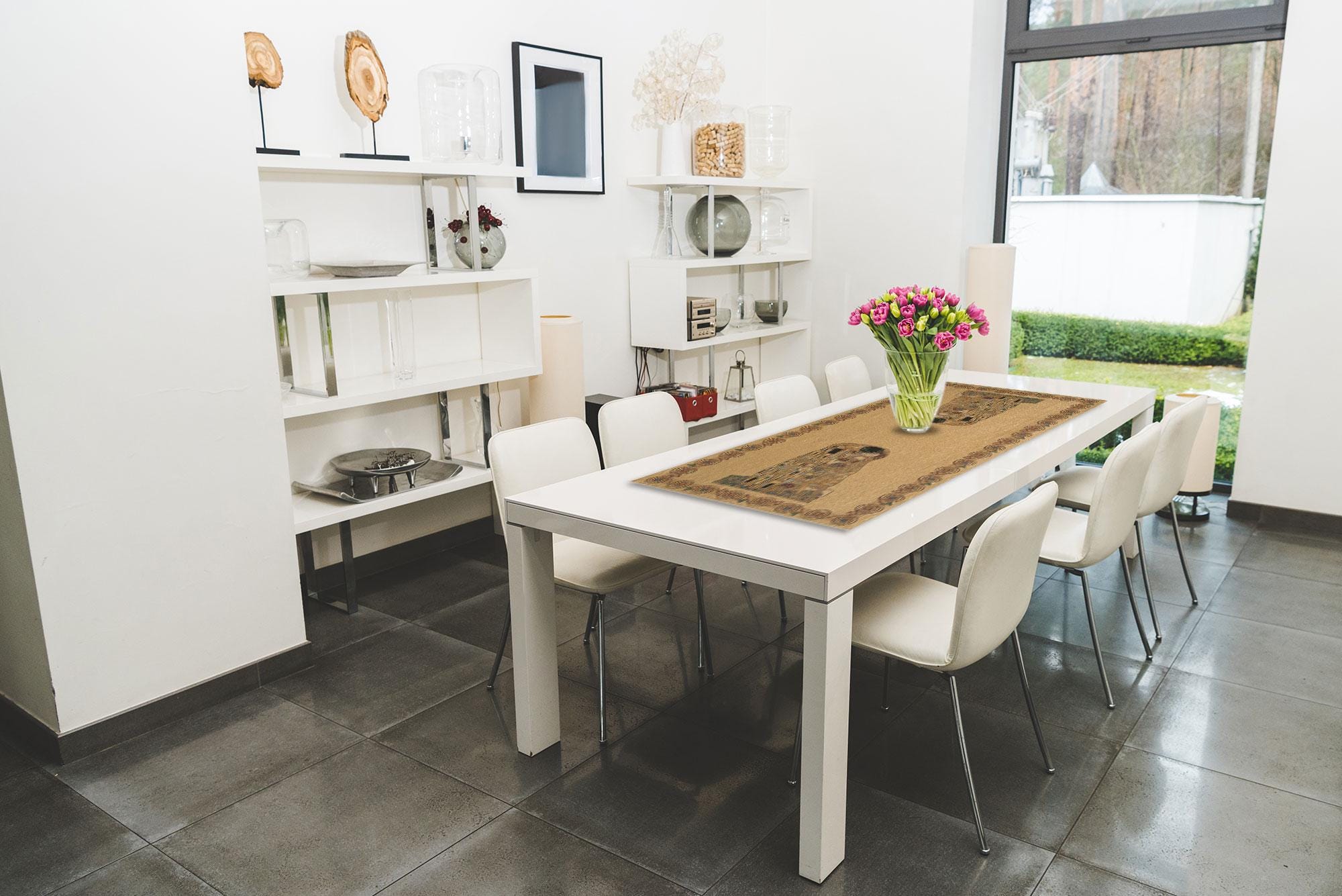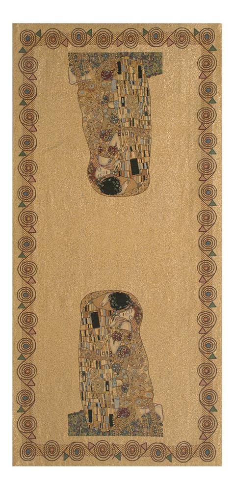 Celebrate art and romance with the Il Bacio II Tapestry Runner Table, inspired by Gustav Klimtโs masterpiece ""The Kiss"". This luxurious tapestry runner features vibrant gold accents, rich patterns, and romantic imagery, making it a striking addition to your home decor.