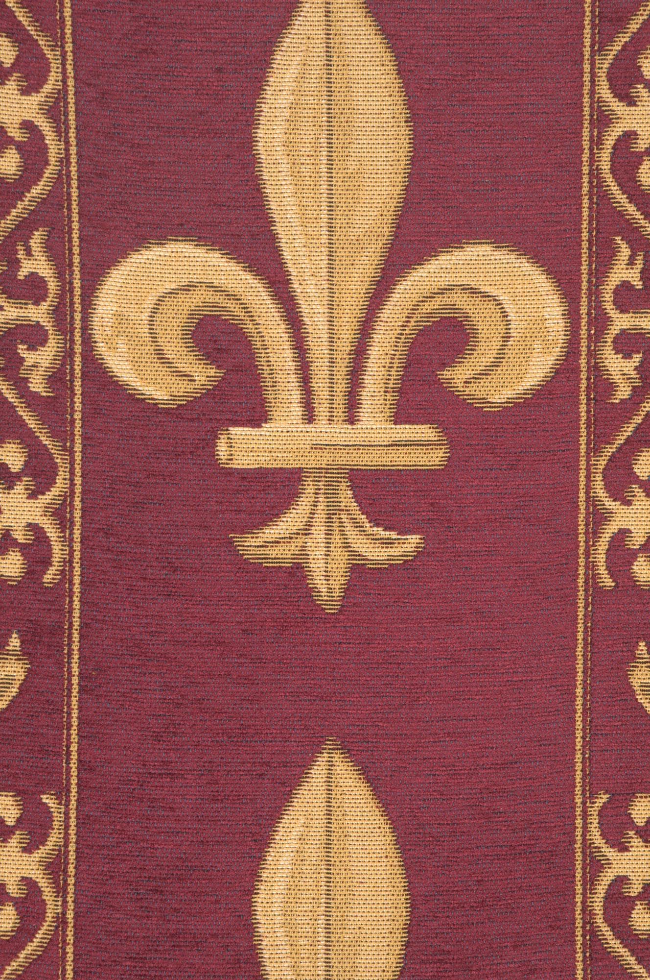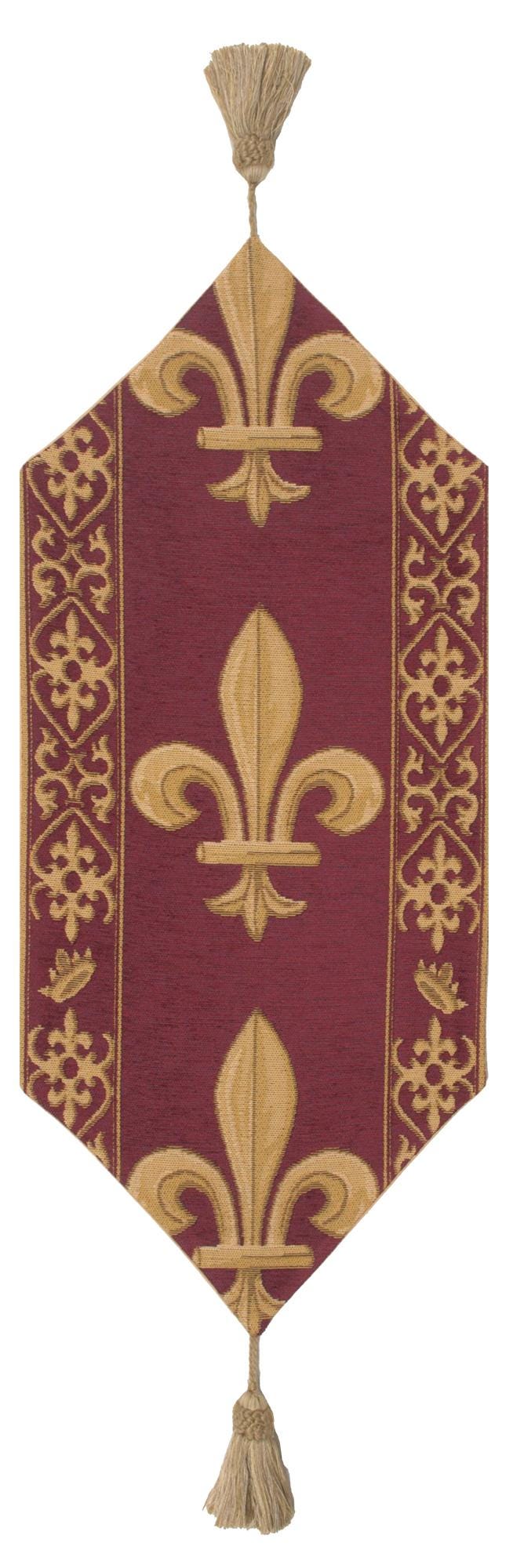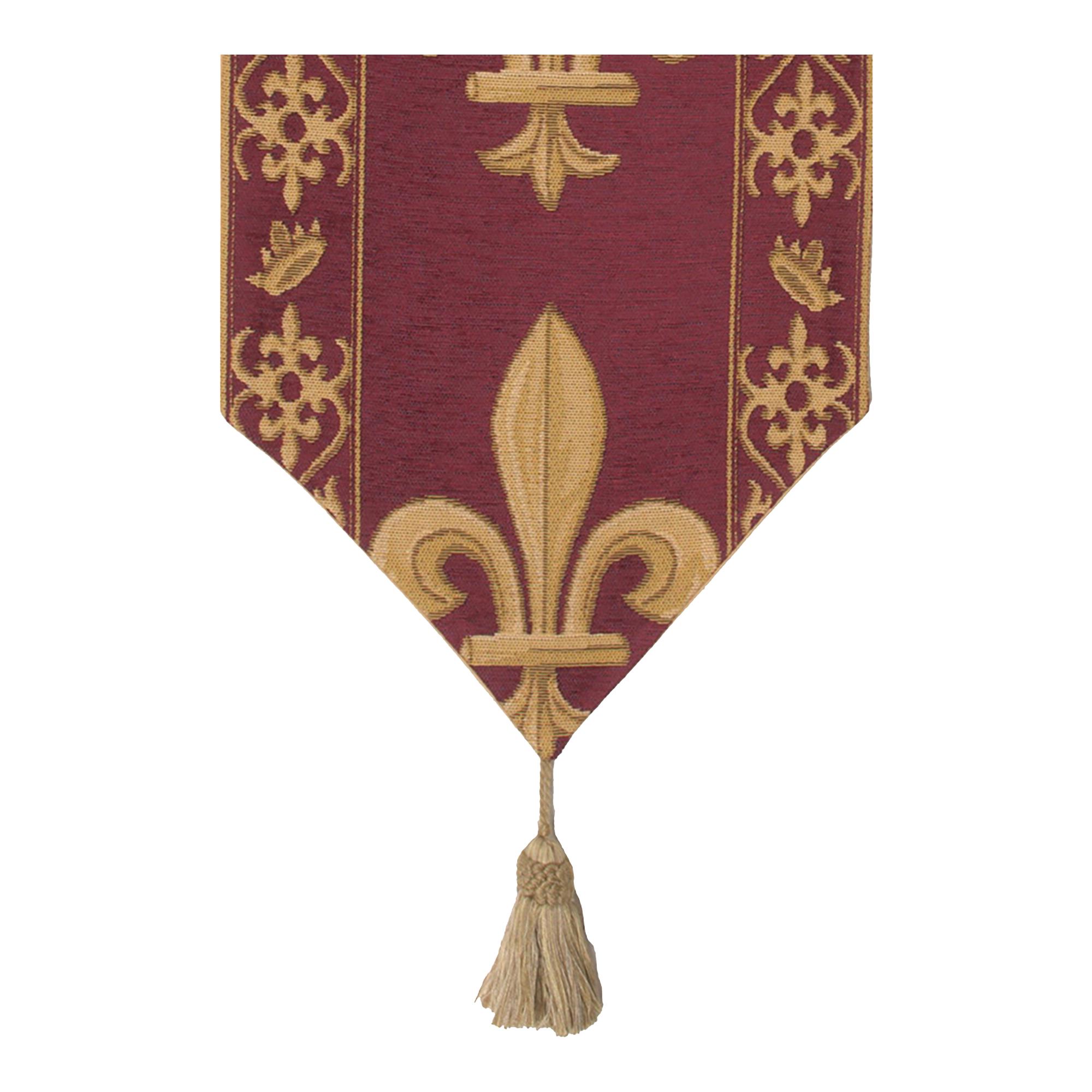 Add timeless elegance to your home with this luxurious tapestry runner, inspired by the French fleur de lys, a symbol of royalty since the 12th century. The regal gold fleur de lys motifs stand out against a rich regent red background, creating a sophisticated and historic look.